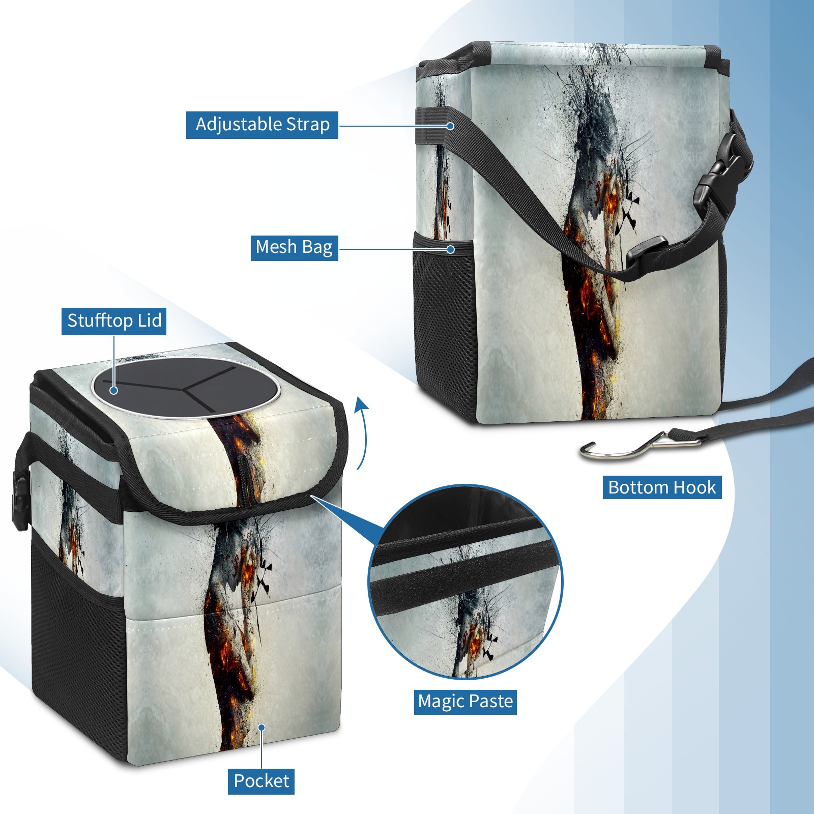 • <p>Keep your car neat with this practical car trash can—built for durability, versatility, and on-the-go convenience! Crafted from quality twill fabric with a waterproof lining, it prevents leaks, keeping seats/floors clean. Clean easily: empty directly or secure a disposable bag with side clips. Adjustable pull cord fits floor, seat, or headrest. 9.5x6.3x6.7 inches, ample space for daily trash, folds flat for storage. More than a trash can, it doubles as a storage bag for cups, toys, docs, and small gadgets—must-have car interior accessory. Installs in seconds on seats, console, or gear shift; adjustable straps keep it stable, no slipping on bumpy roads. Perfect gift for new car owners!</p>