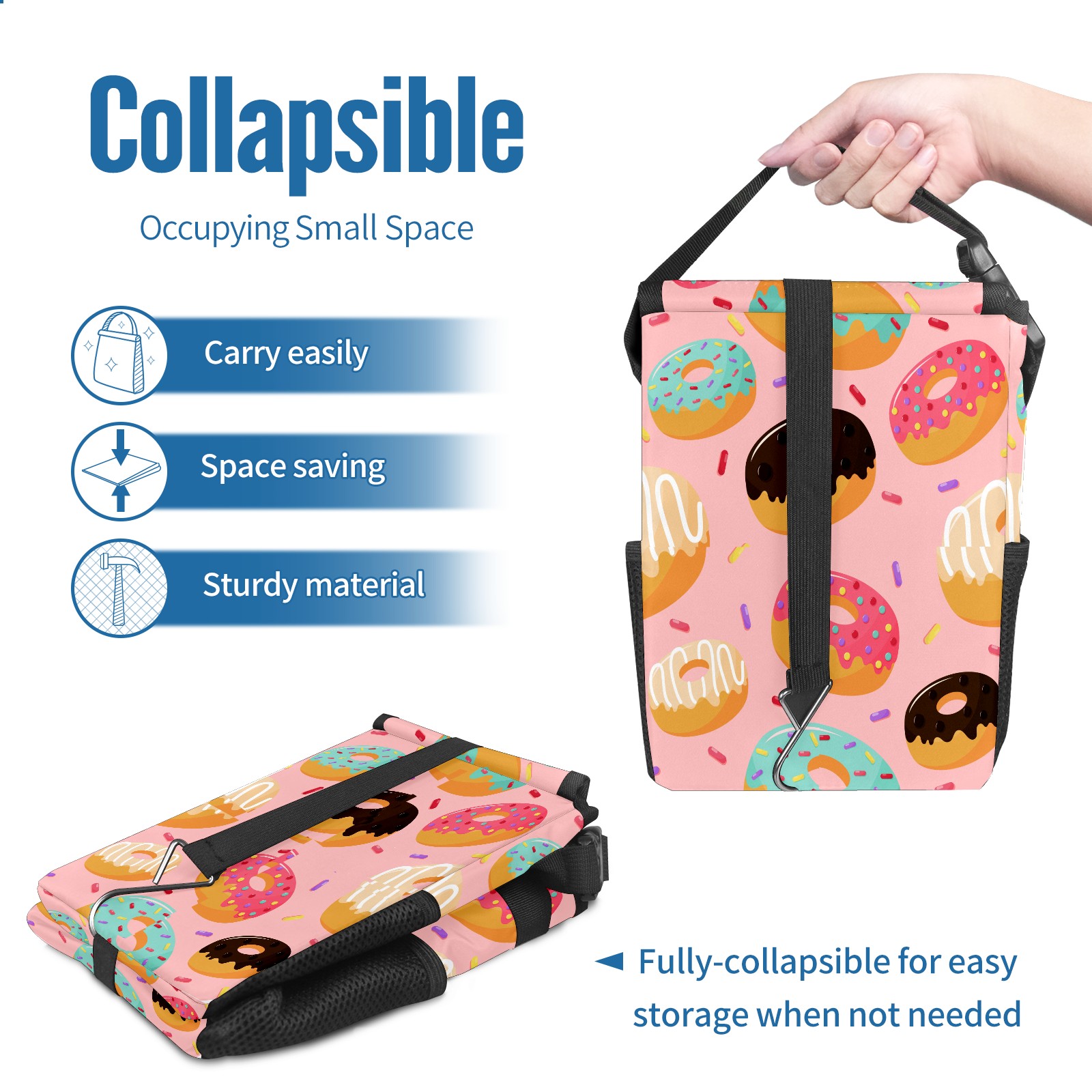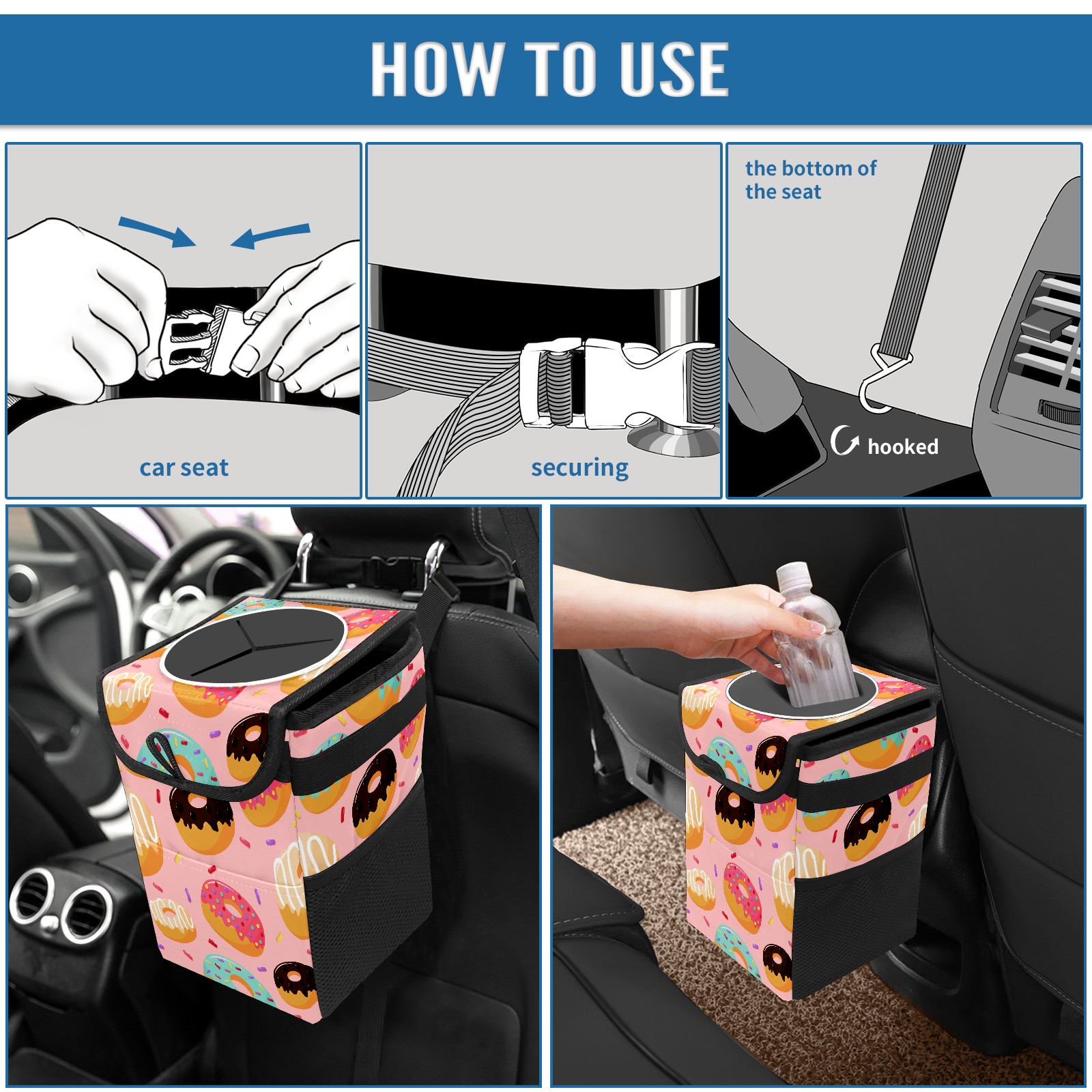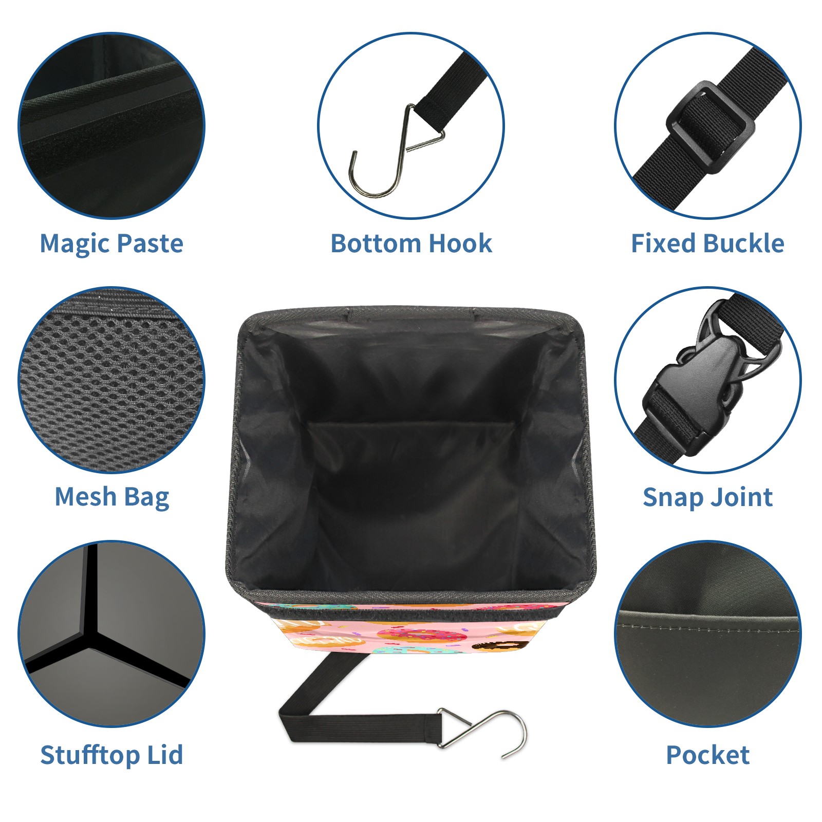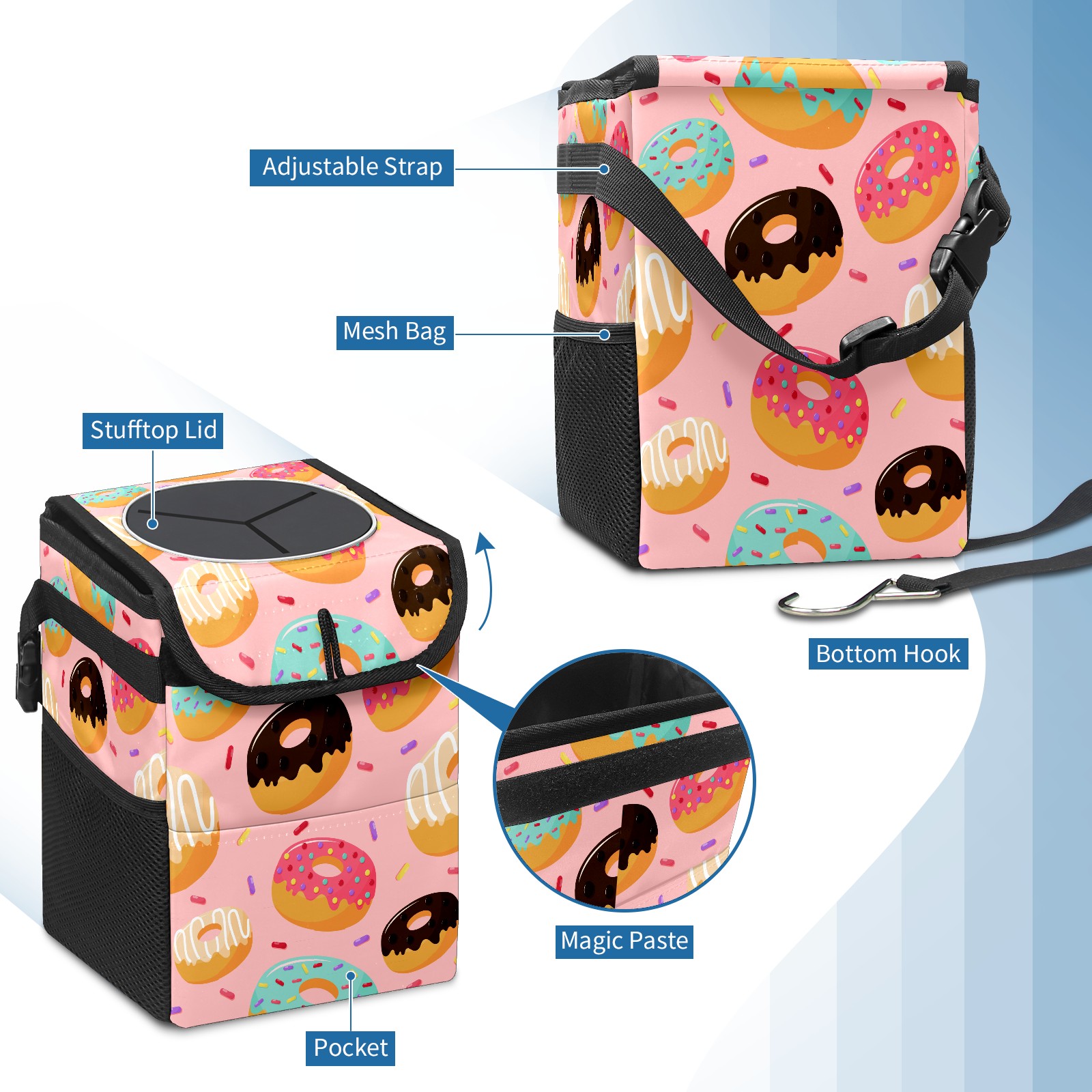 Car Garbage Can — Multi-functional, Lightweight Portable, Reusable Vehicle Trash Can, Waterproof with Sufficient Storage Capacity Sweet Donuts Pink Background