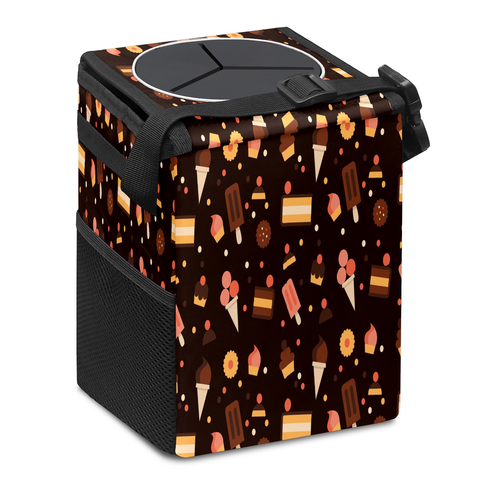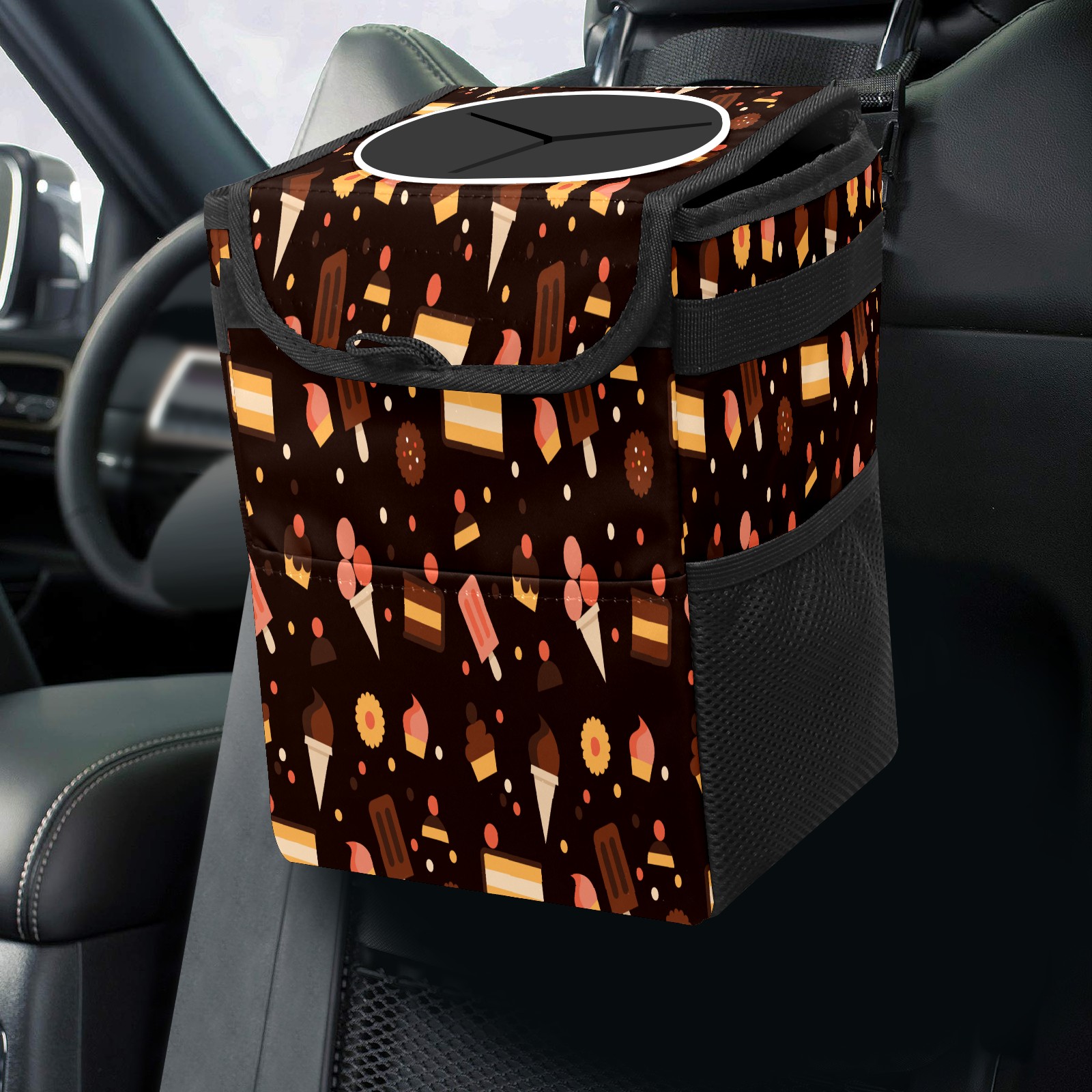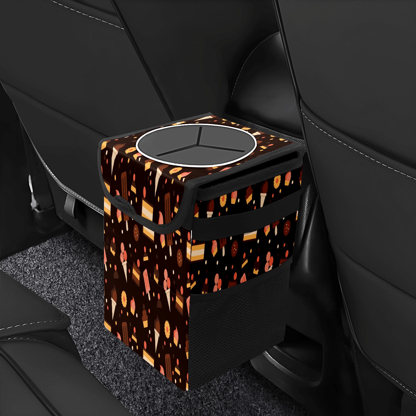 Car Garbage Can — Multi-functional, Lightweight Portable, Reusable Vehicle Trash Can, Waterproof with Sufficient Storage Capacity Pastry Pattern Black Background