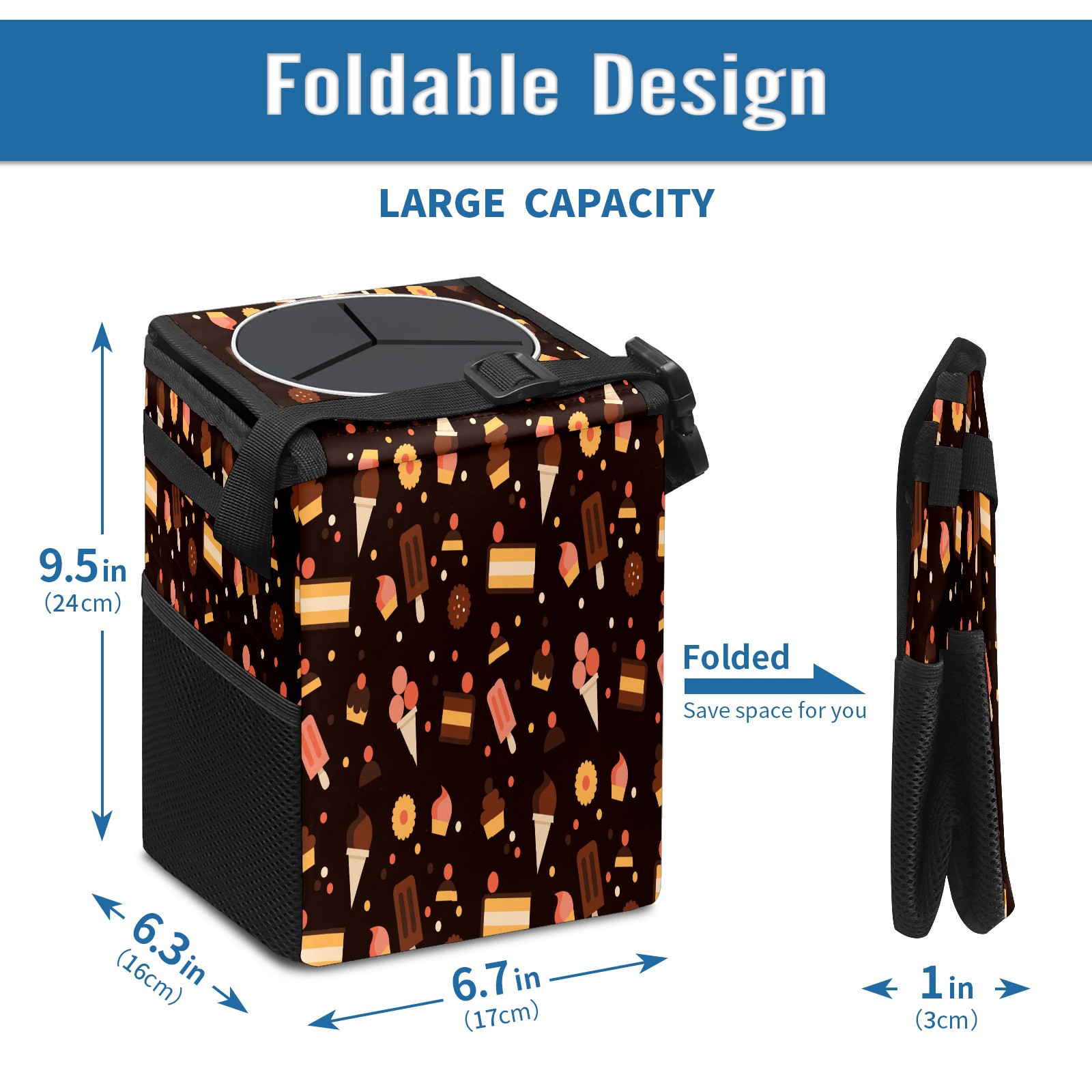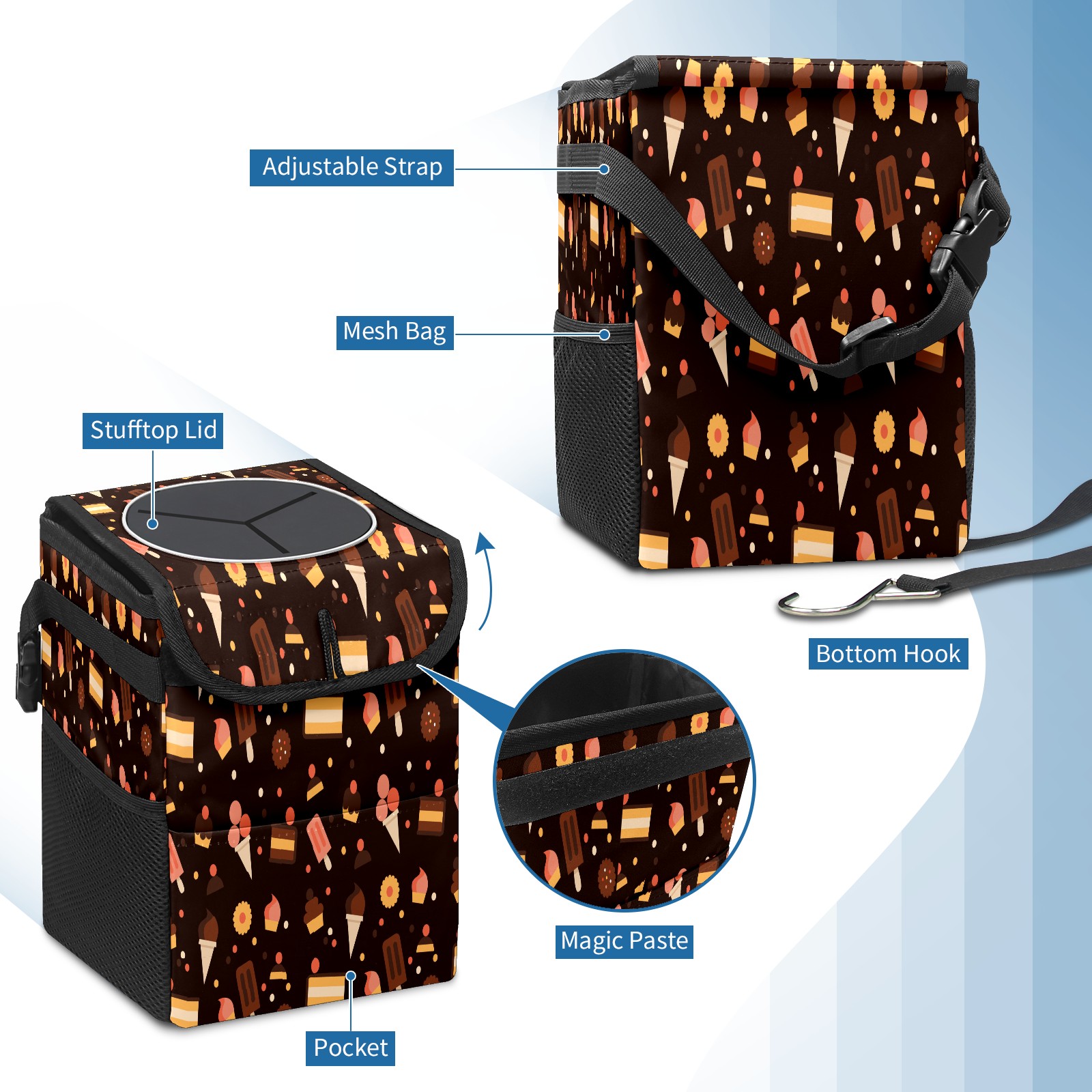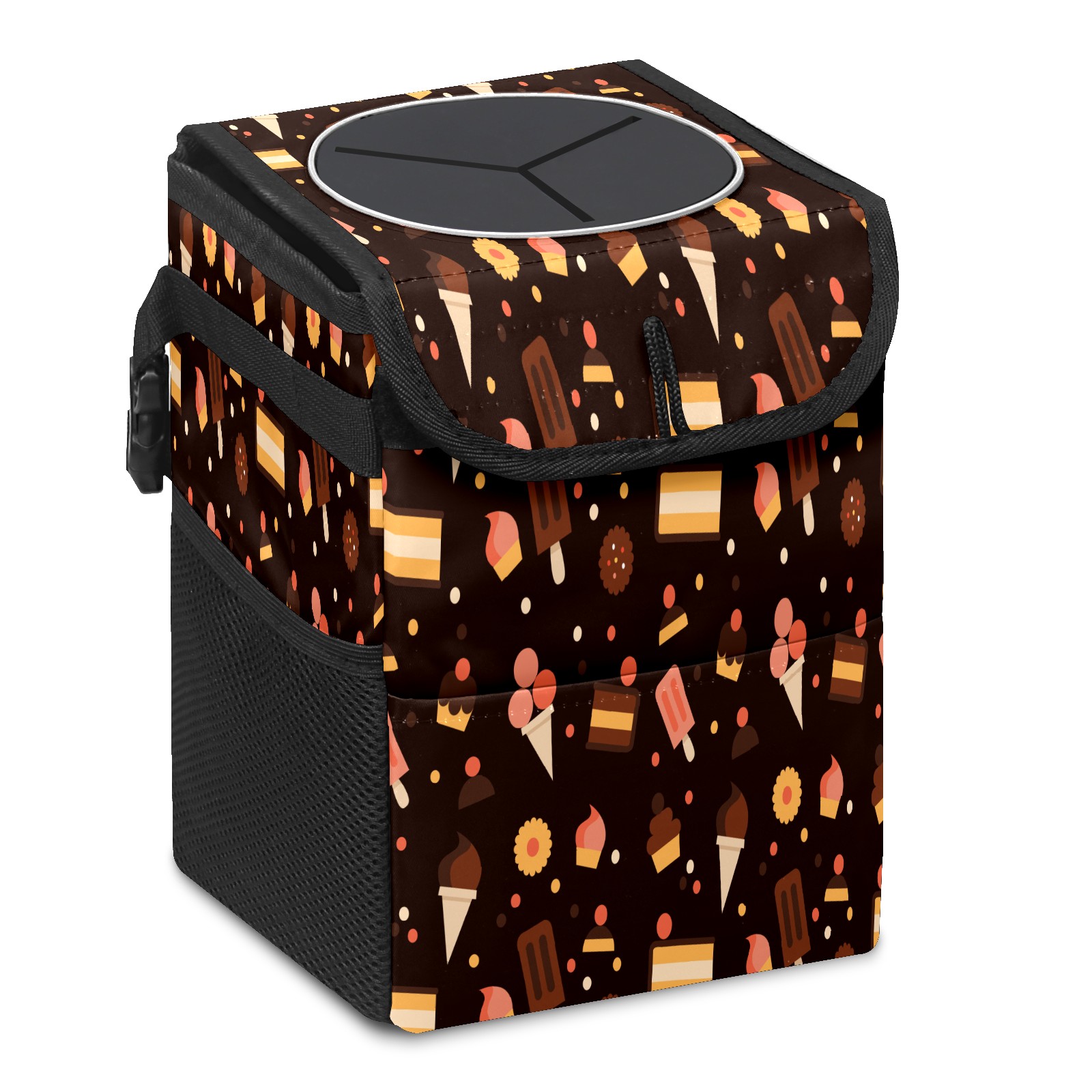 Car Garbage Can — Multi-functional, Lightweight Portable, Reusable Vehicle Trash Can, Waterproof with Sufficient Storage Capacity Pastry Pattern Black Background