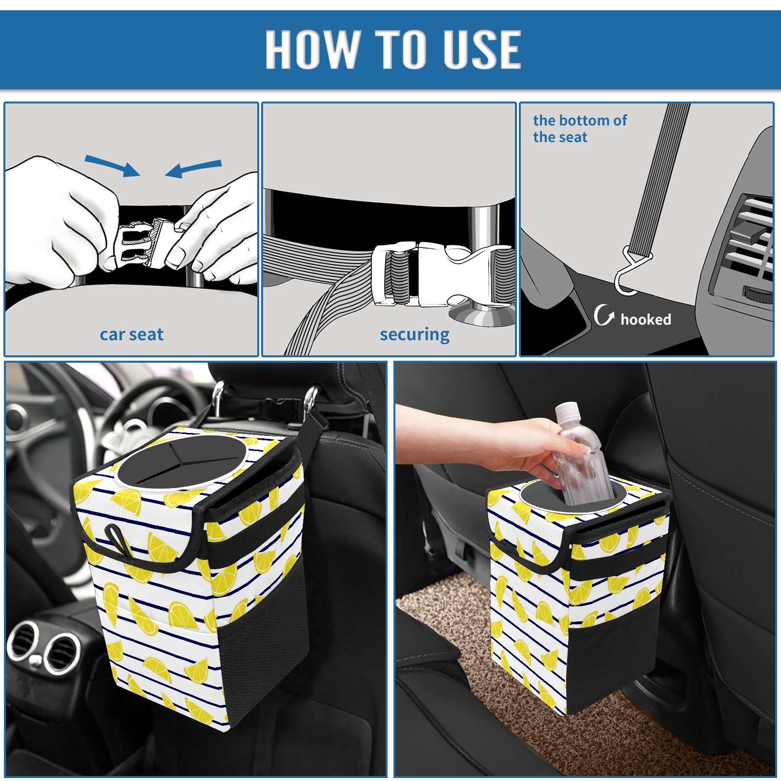 • <p>Keep your car neat with this practical car trash can—built for durability, versatility, and on-the-go convenience! Crafted from quality twill fabric with a waterproof lining, it prevents leaks, keeping seats/floors clean. Clean easily: empty directly or secure a disposable bag with side clips. Adjustable pull cord fits floor, seat, or headrest. 9.5x6.3x6.7 inches, ample space for daily trash, folds flat for storage. More than a trash can, it doubles as a storage bag for cups, toys, docs, and small gadgets—must-have car interior accessory. Installs in seconds on seats, console, or gear shift; adjustable straps keep it stable, no slipping on bumpy roads. Perfect gift for new car owners!</p>