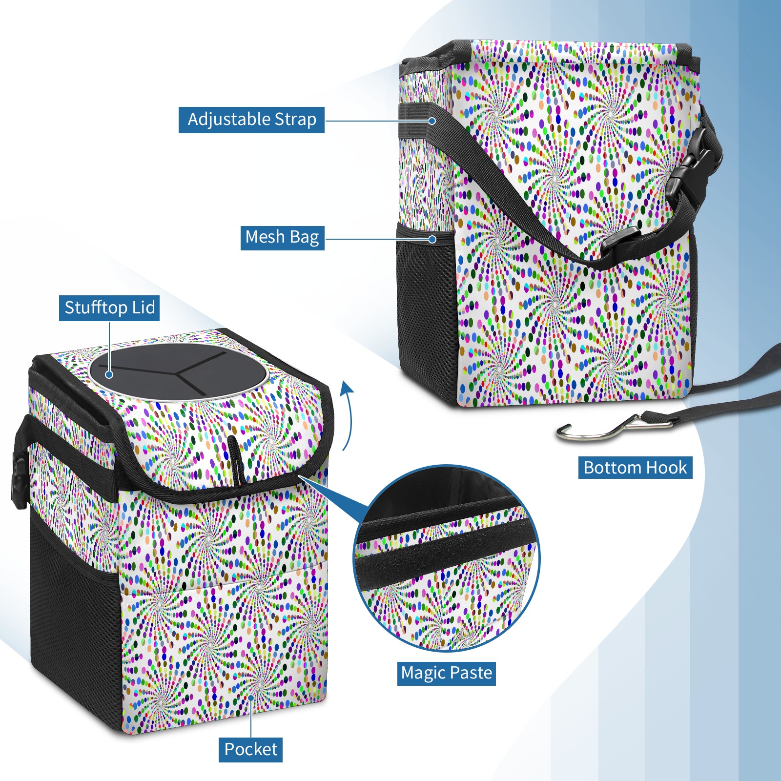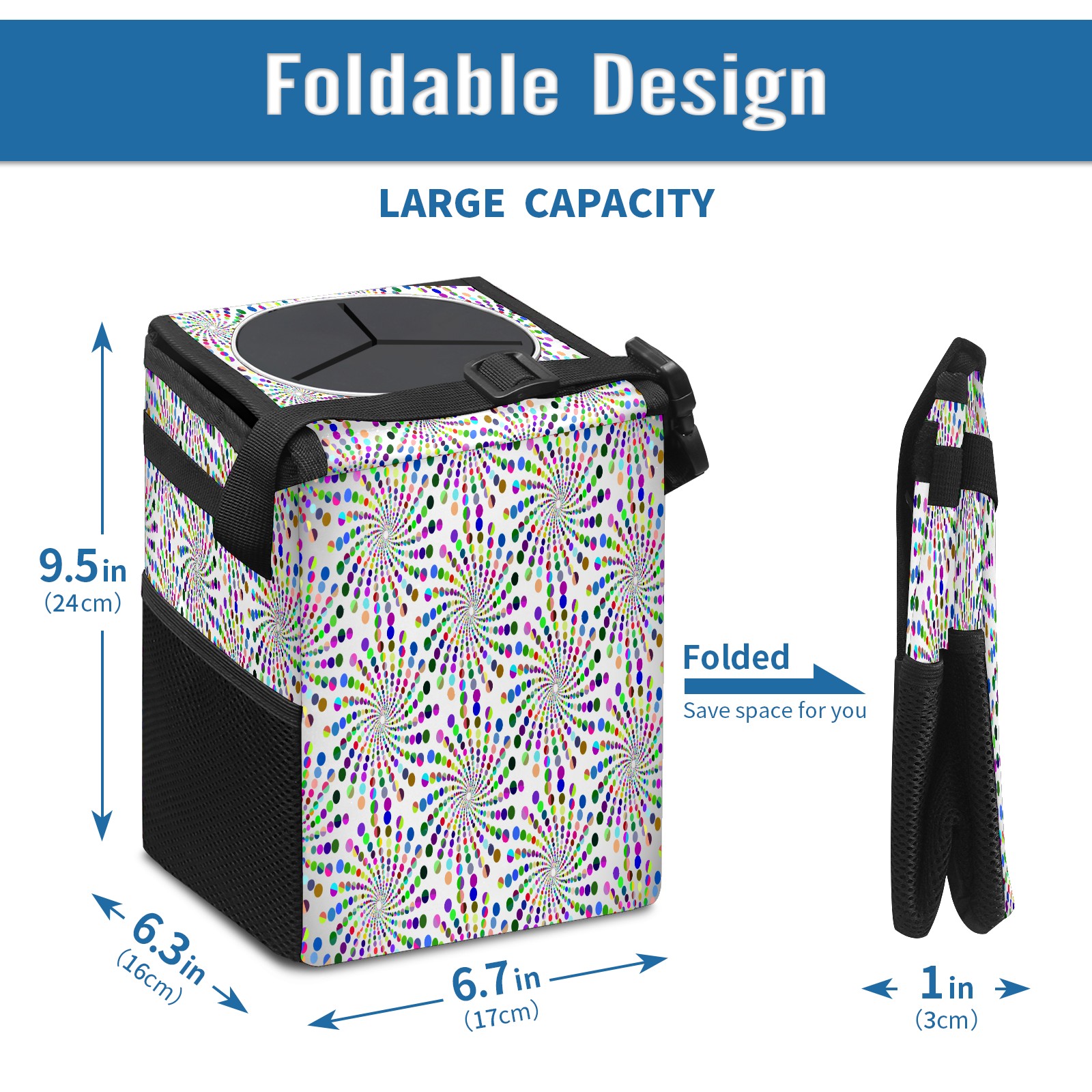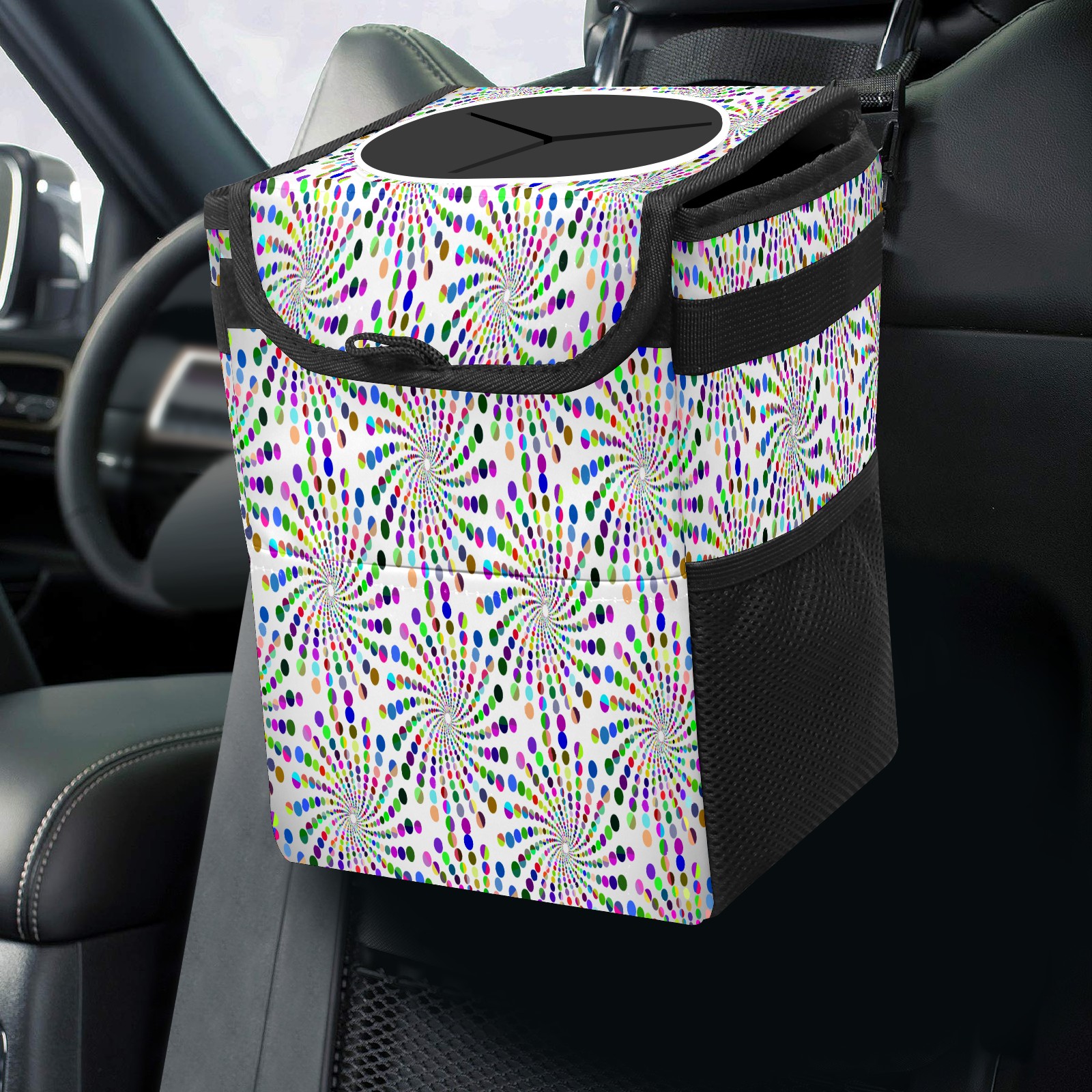 Car Garbage Can — Multi-functional, Lightweight Portable, Reusable Vehicle Trash Can, Waterproof with Sufficient Storage Capacity Colorful Dotted
