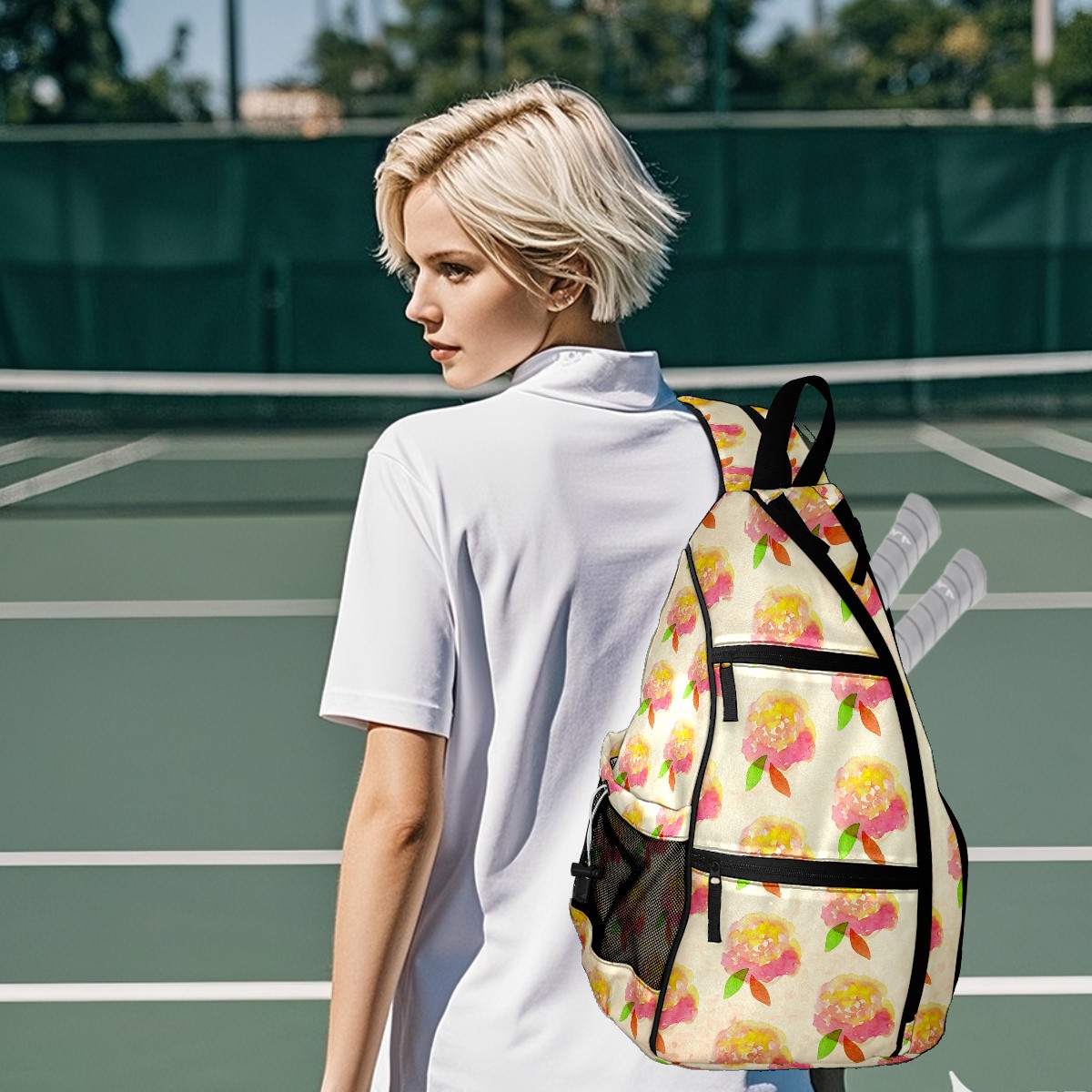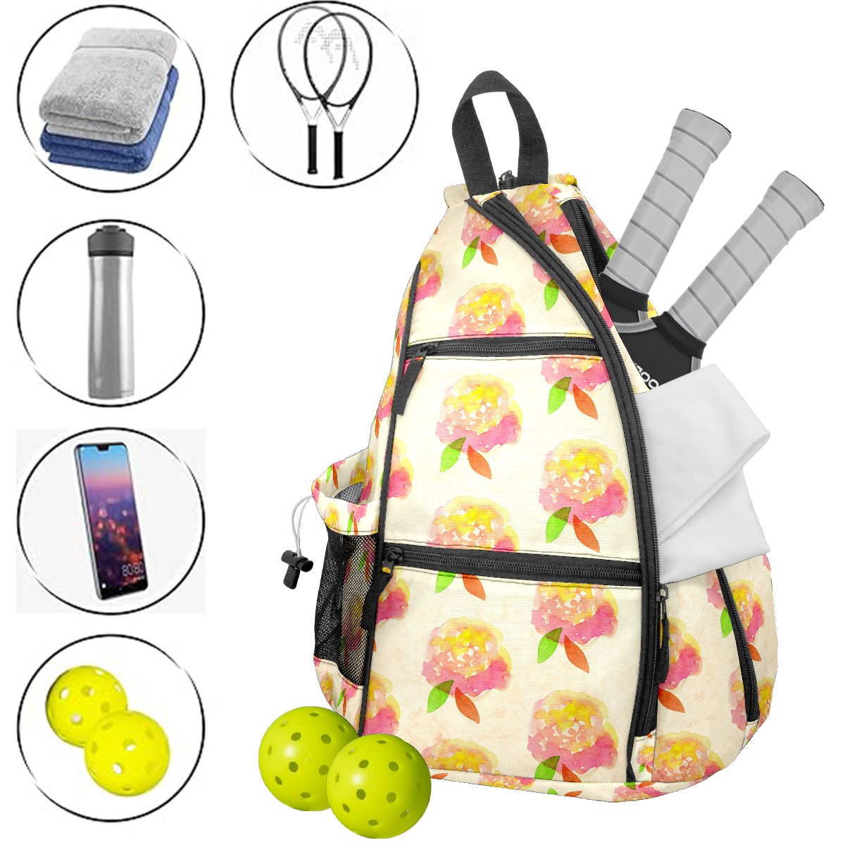 Multifunctional Pickleball Bag,Large Capacity Sports Pickleball Racket Bag, Water Bottle Holder and Fence Hook,Suitable for Both Men Women -Watercolor Flowers
