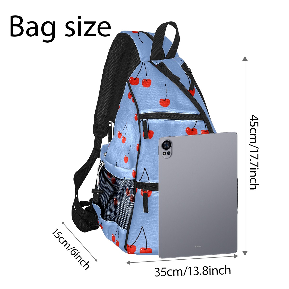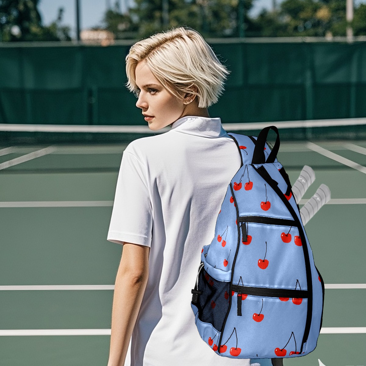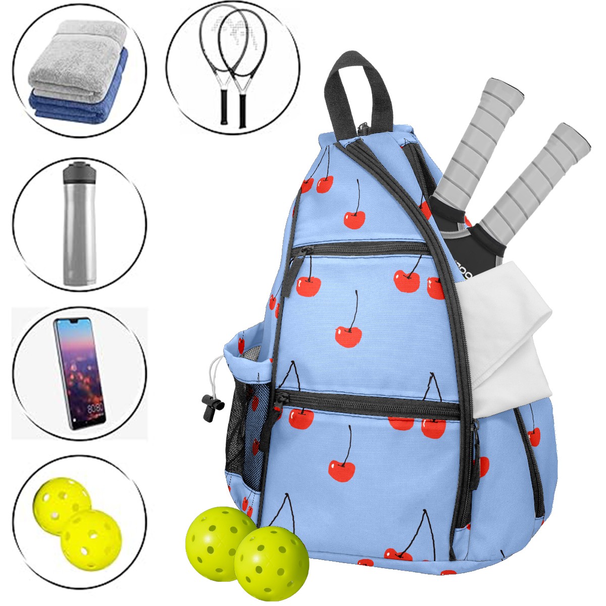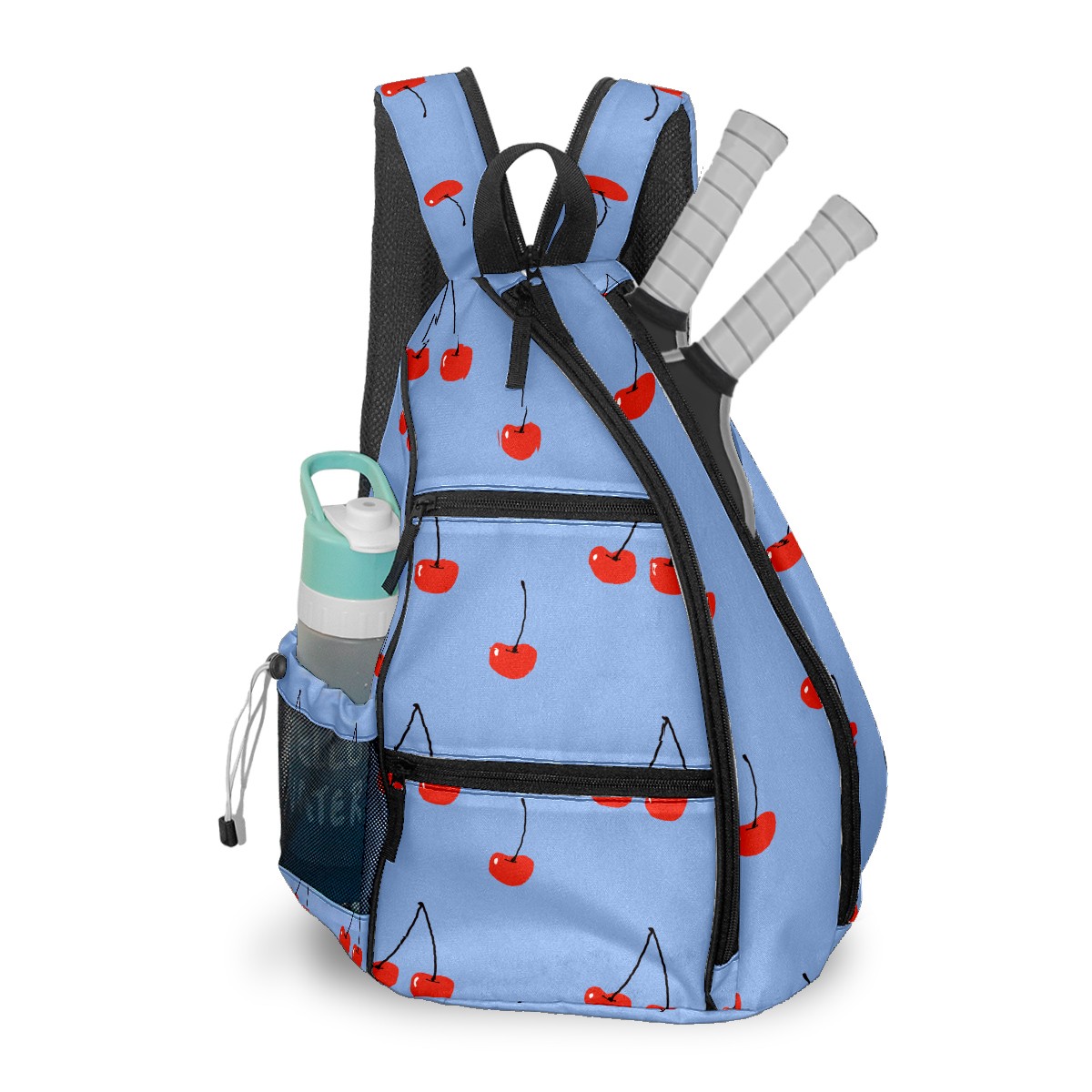 Multifunctional Pickleball Bag,Large Capacity Sports Pickleball Racket Bag, Water Bottle Holder and Fence Hook,Suitable for Both Men Women -Cherries On Blue Background