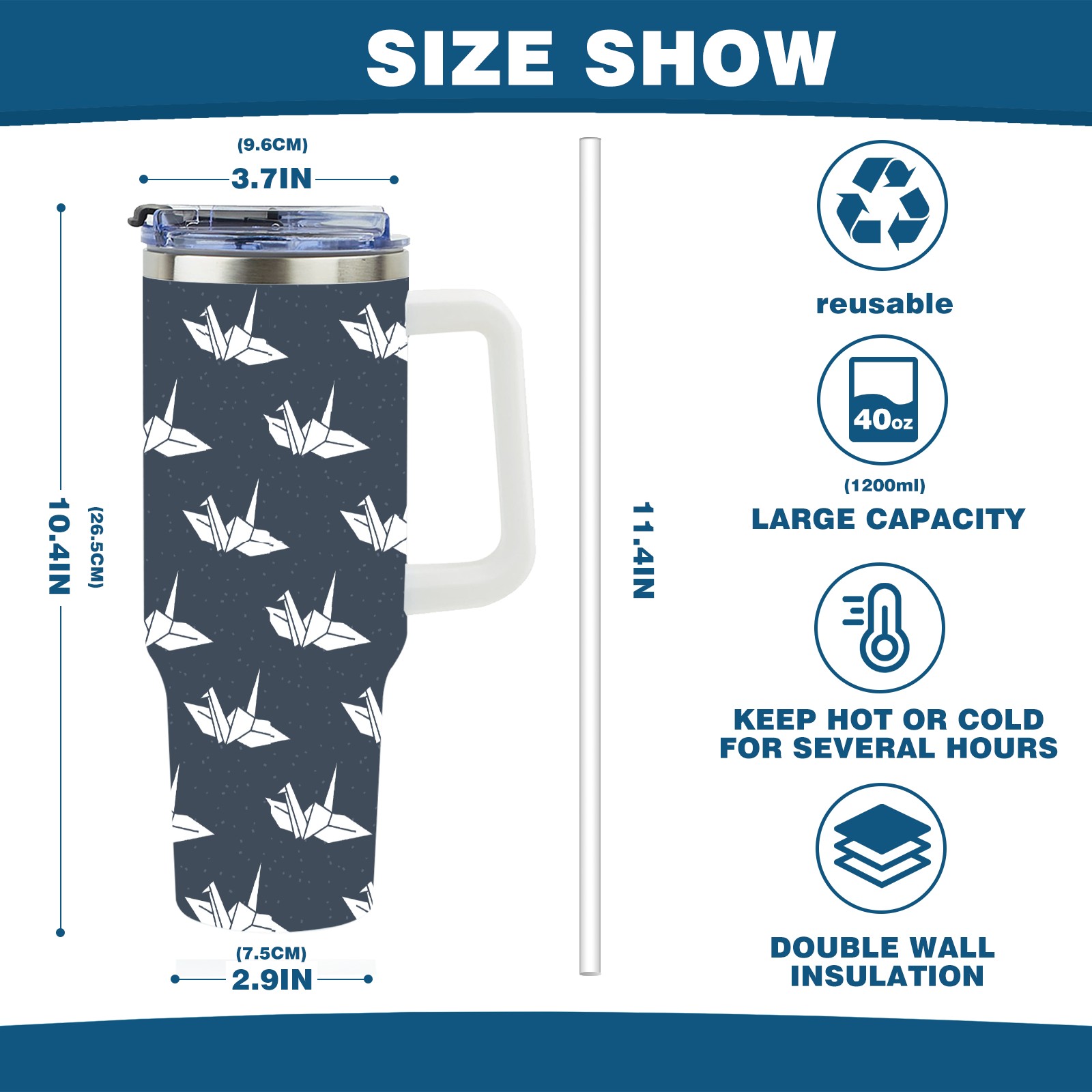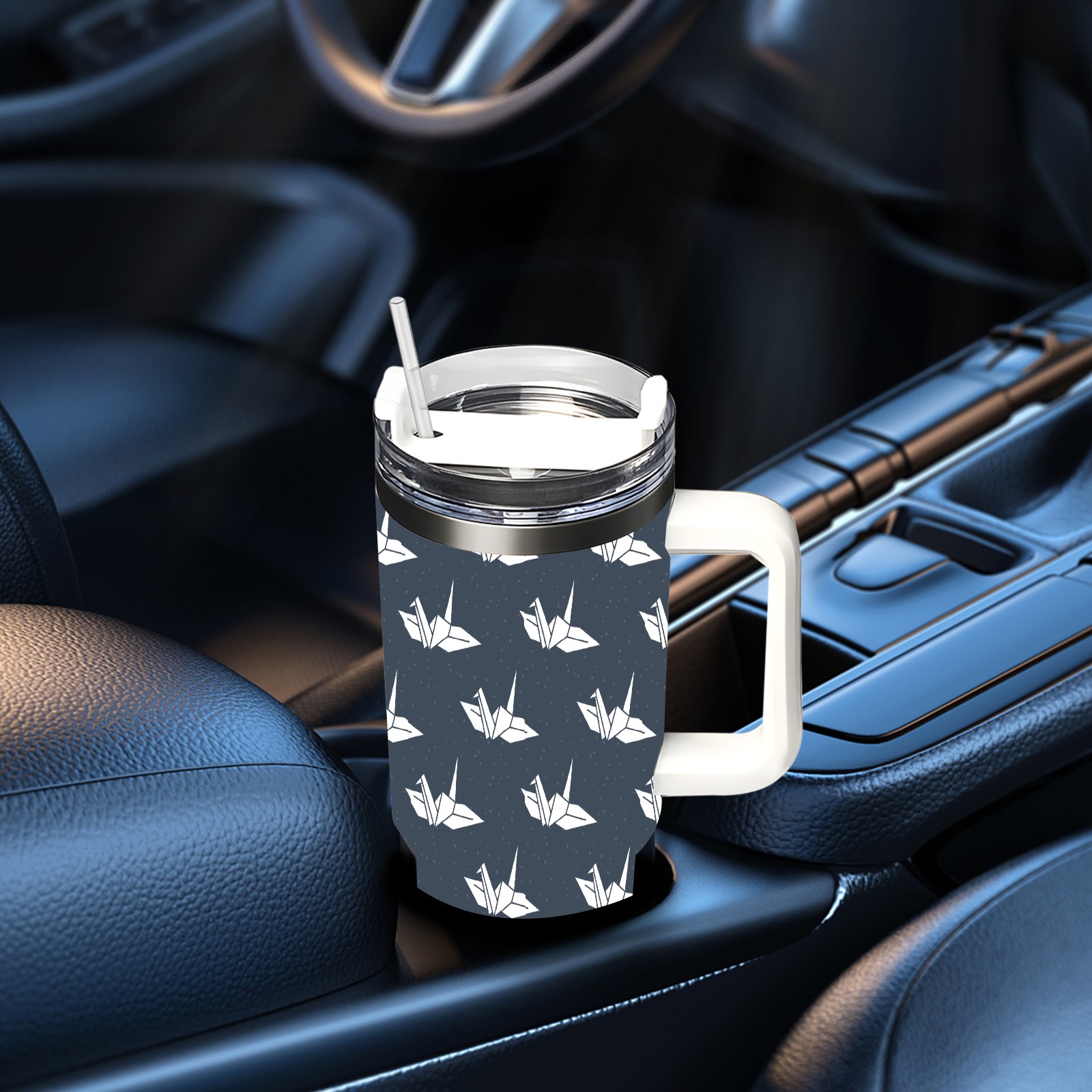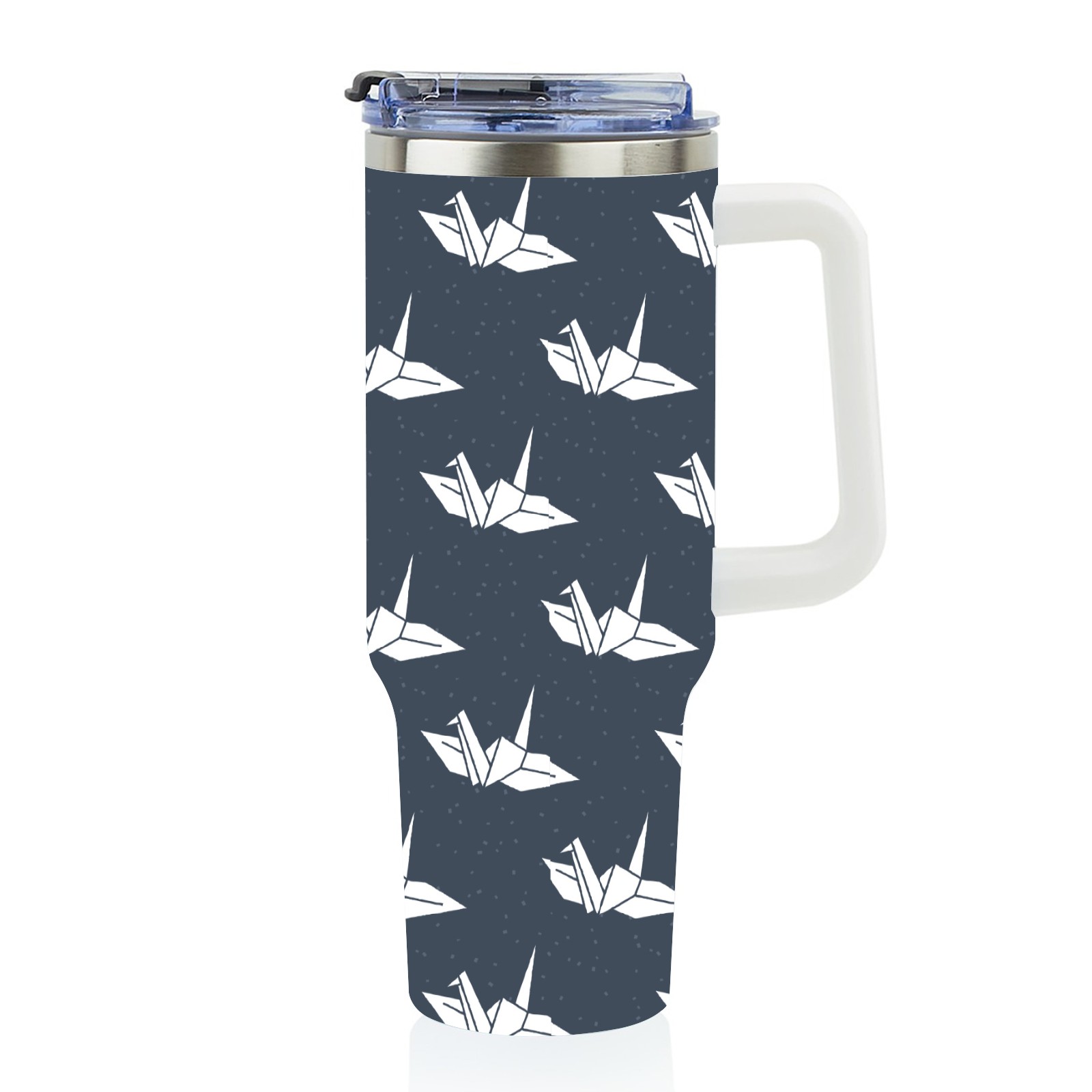 40oz Dark Blue Paper Crane thermos with lid and straw, leak-proof stainless steel, with handle, spill-proof bottle, convenient for travel(blue)