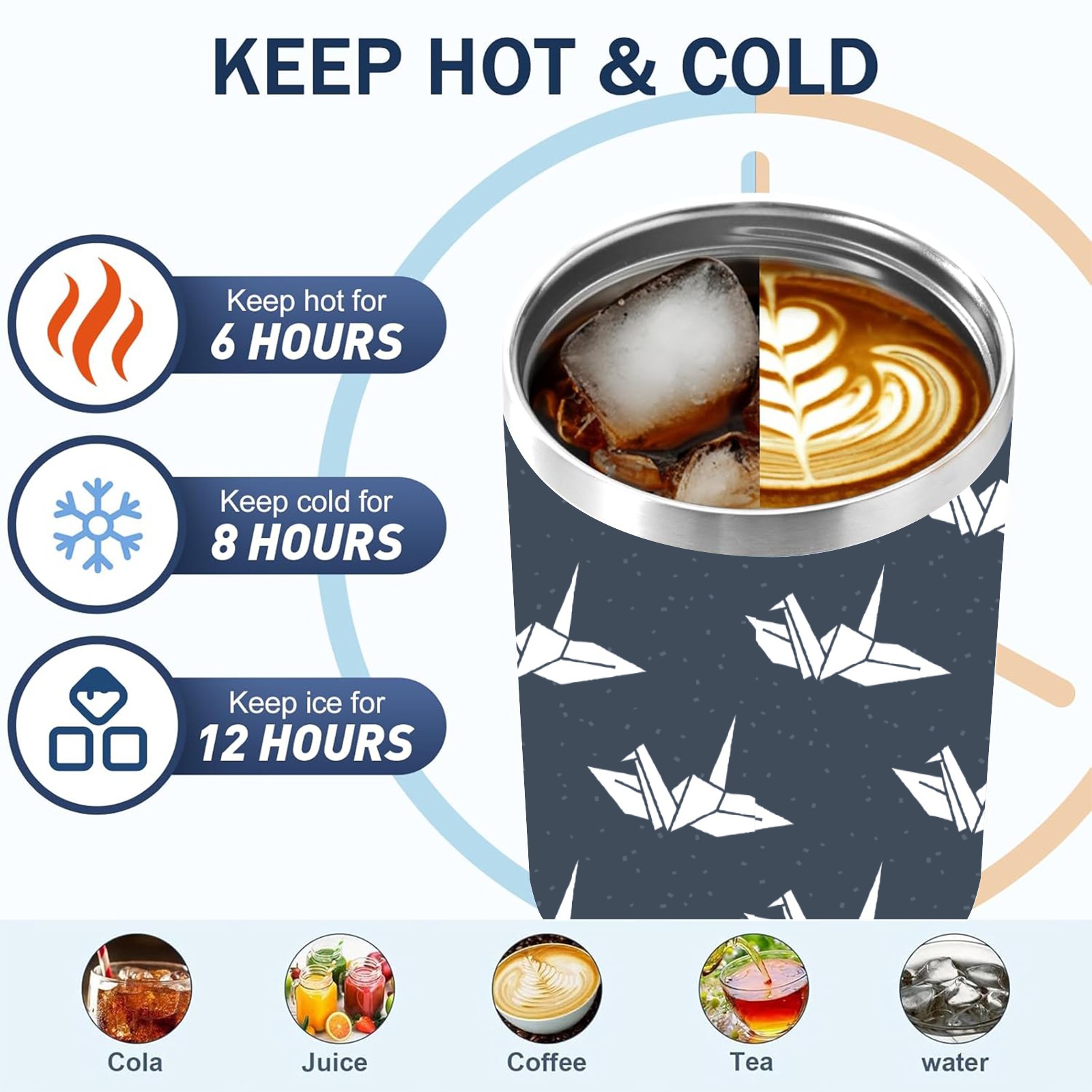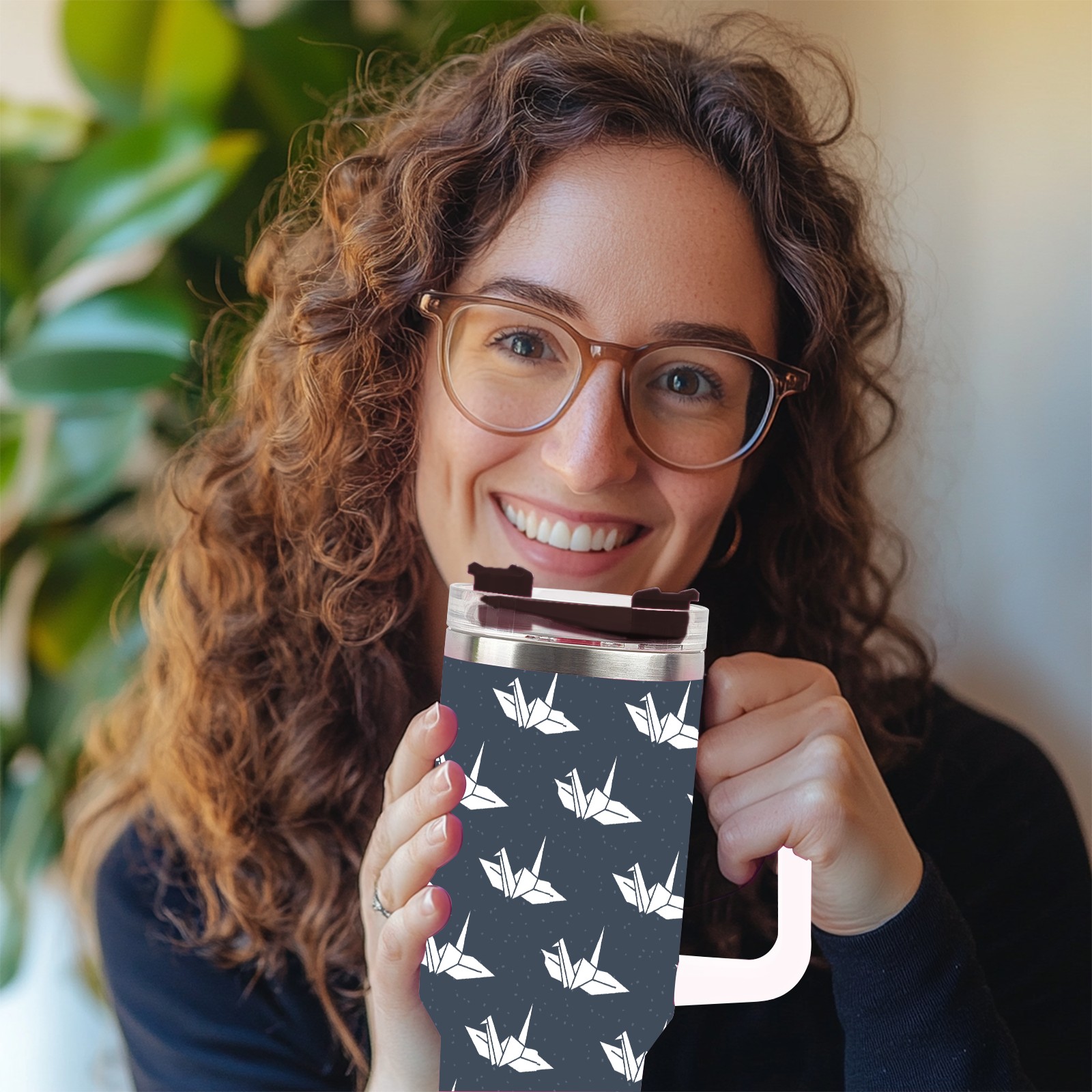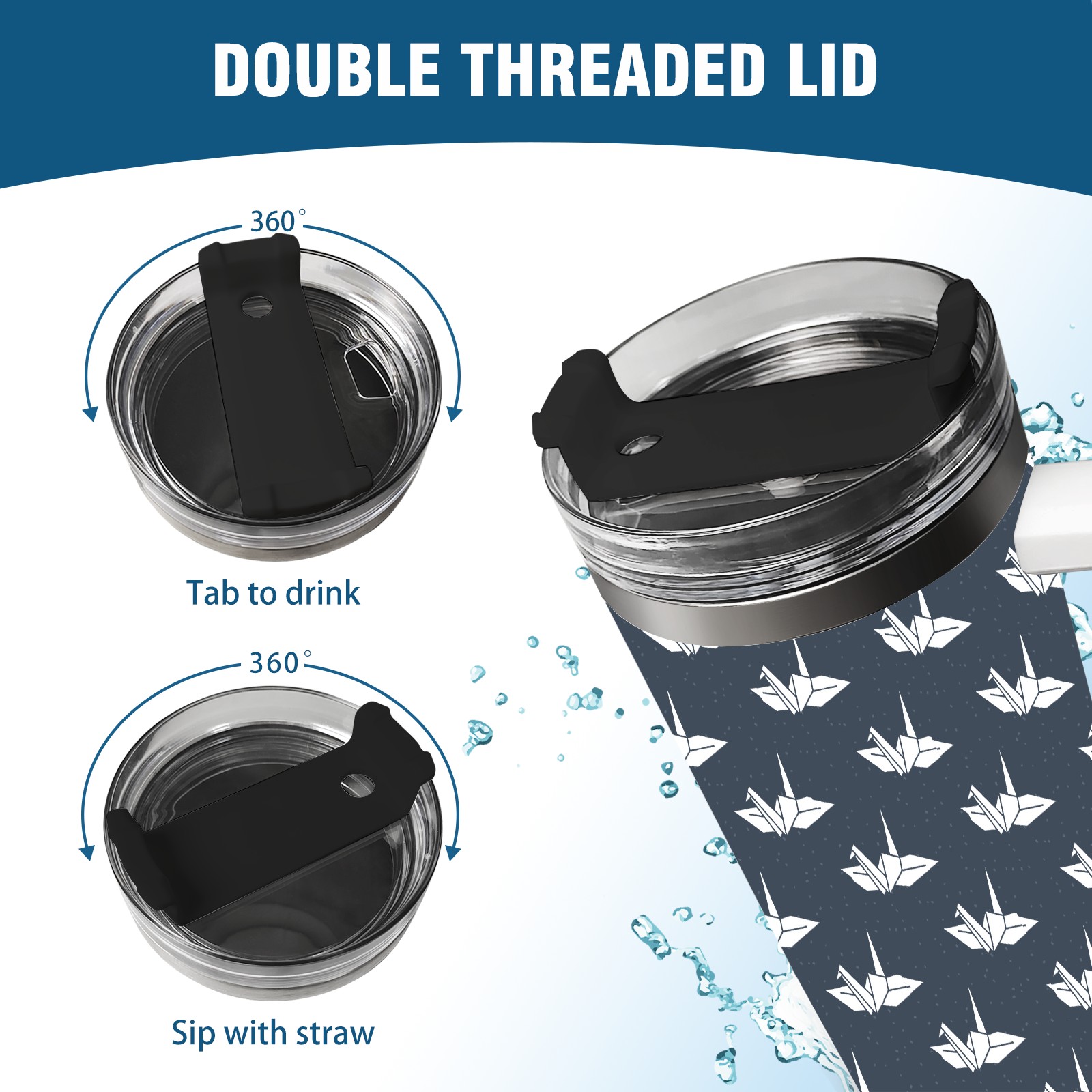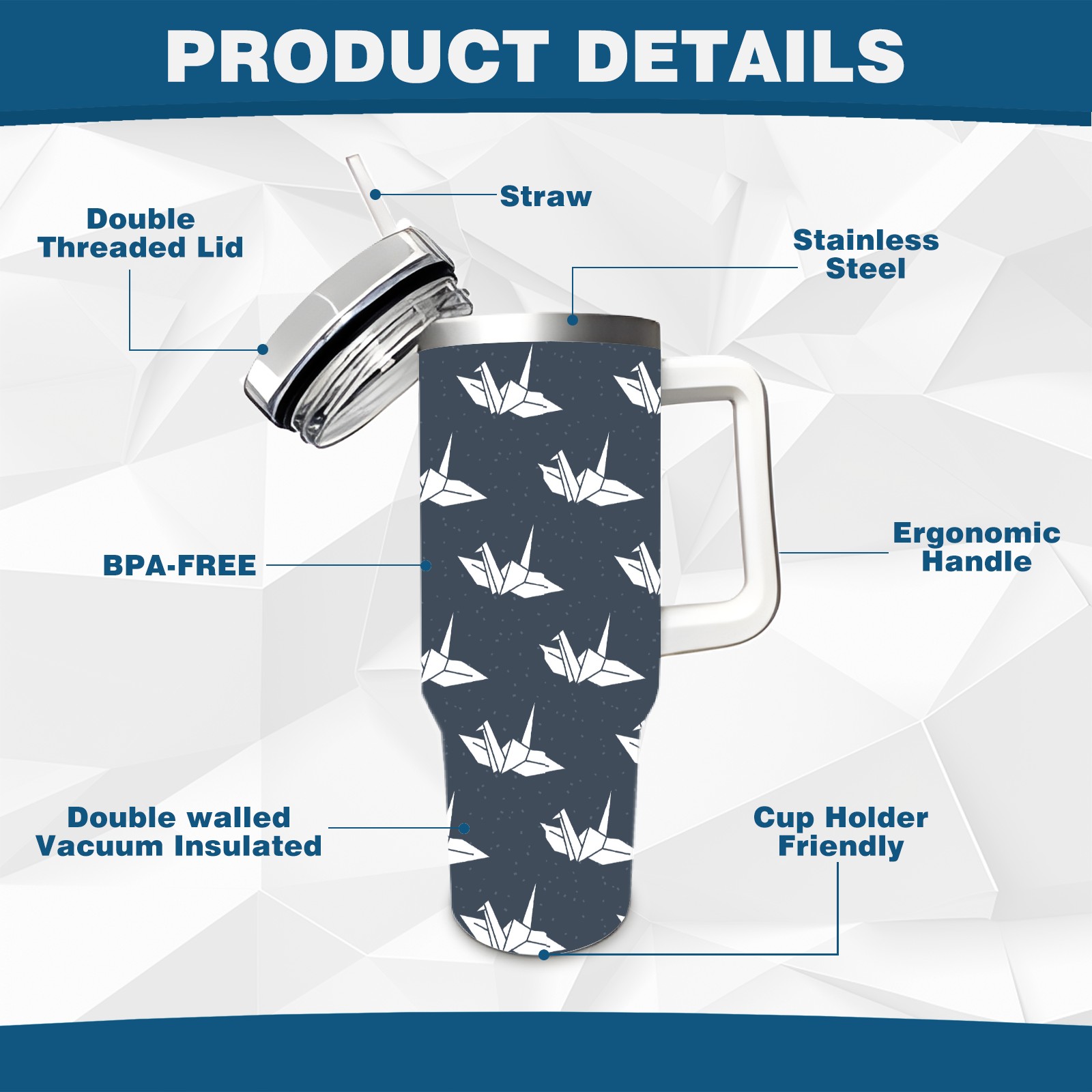 40oz Dark Blue Paper Crane thermos with lid and straw, leak-proof stainless steel, with handle, spill-proof bottle, convenient for travel(blue)