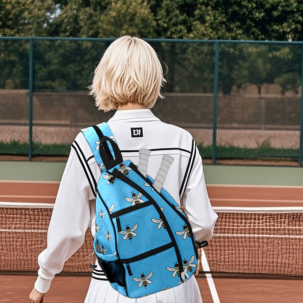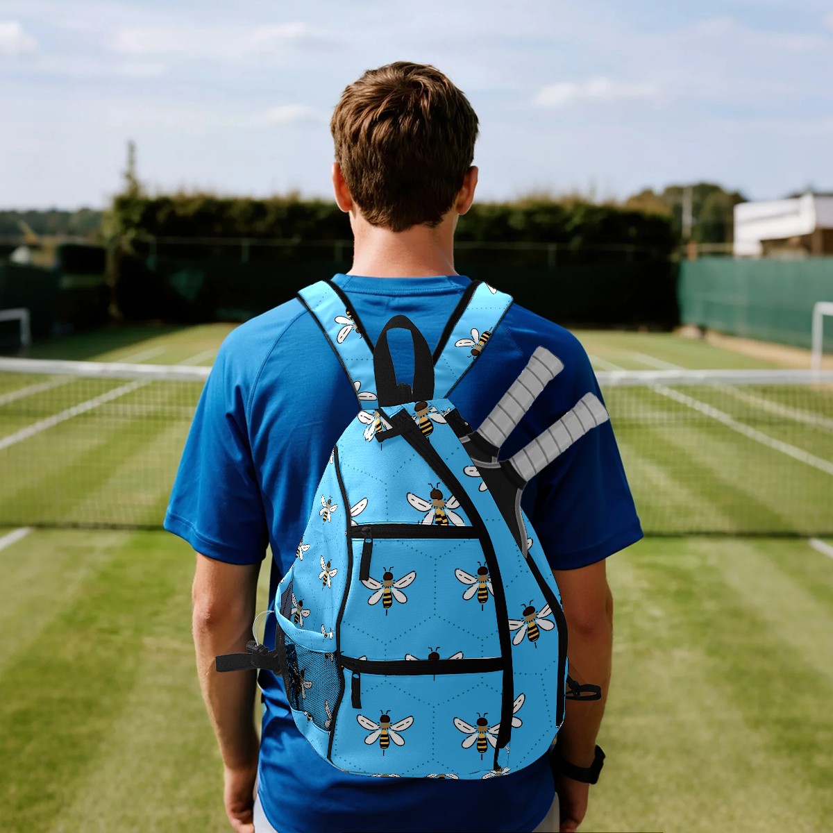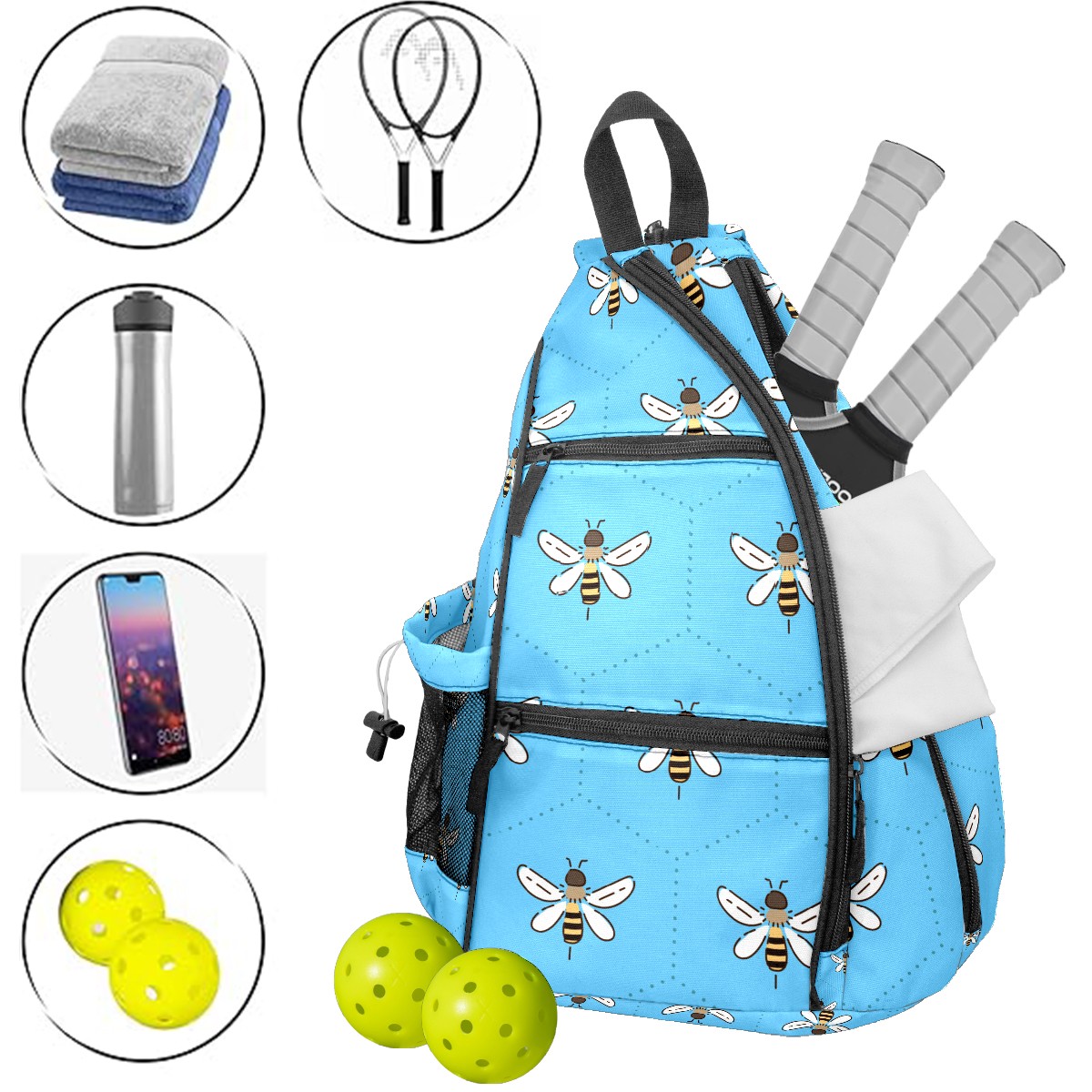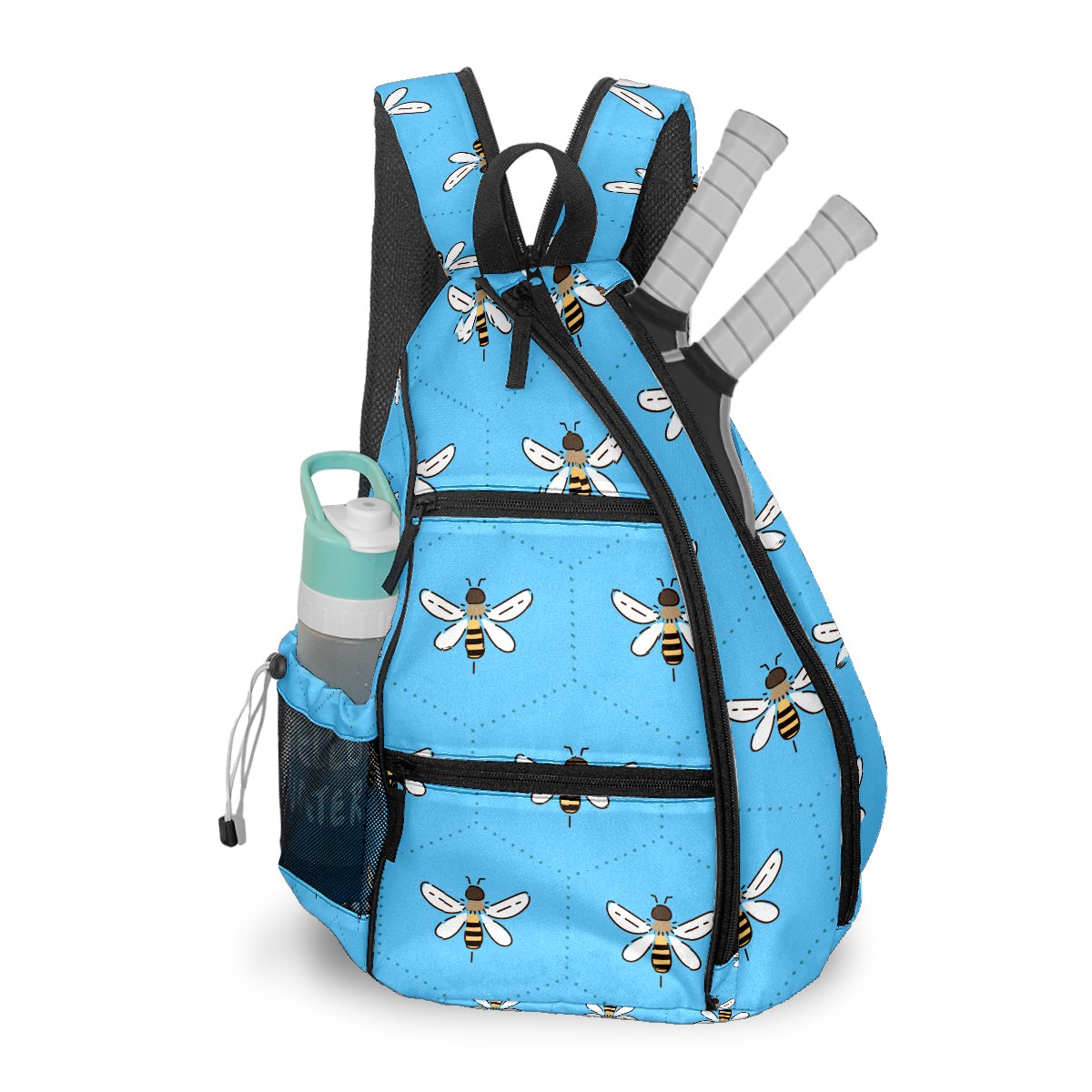 Multifunctional Pickleball Bag,Large Capacity Sports Pickleball Racket Bag, Water Bottle Holder and Fence Hook,Suitable for Both Men Women -Bee On Blue Background
