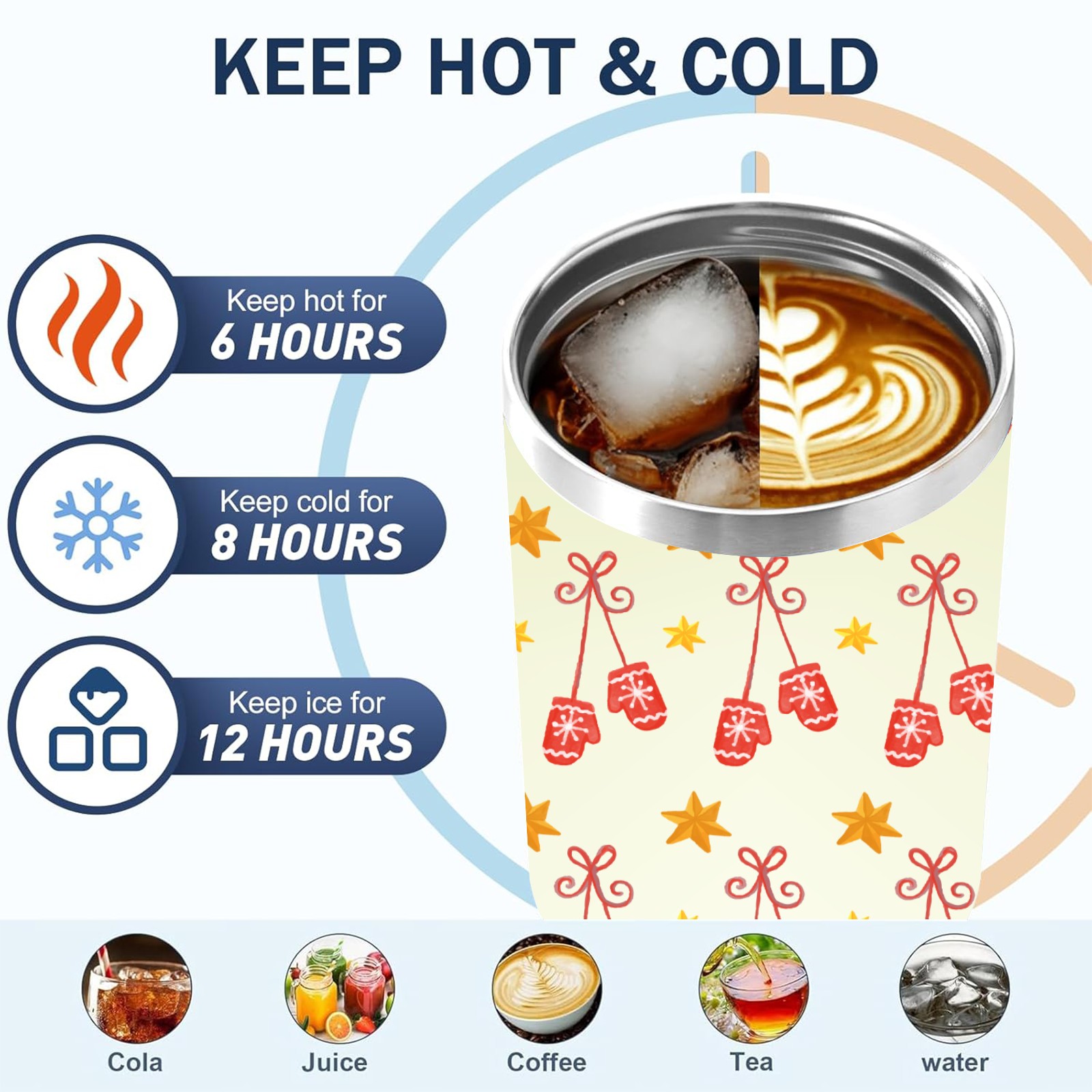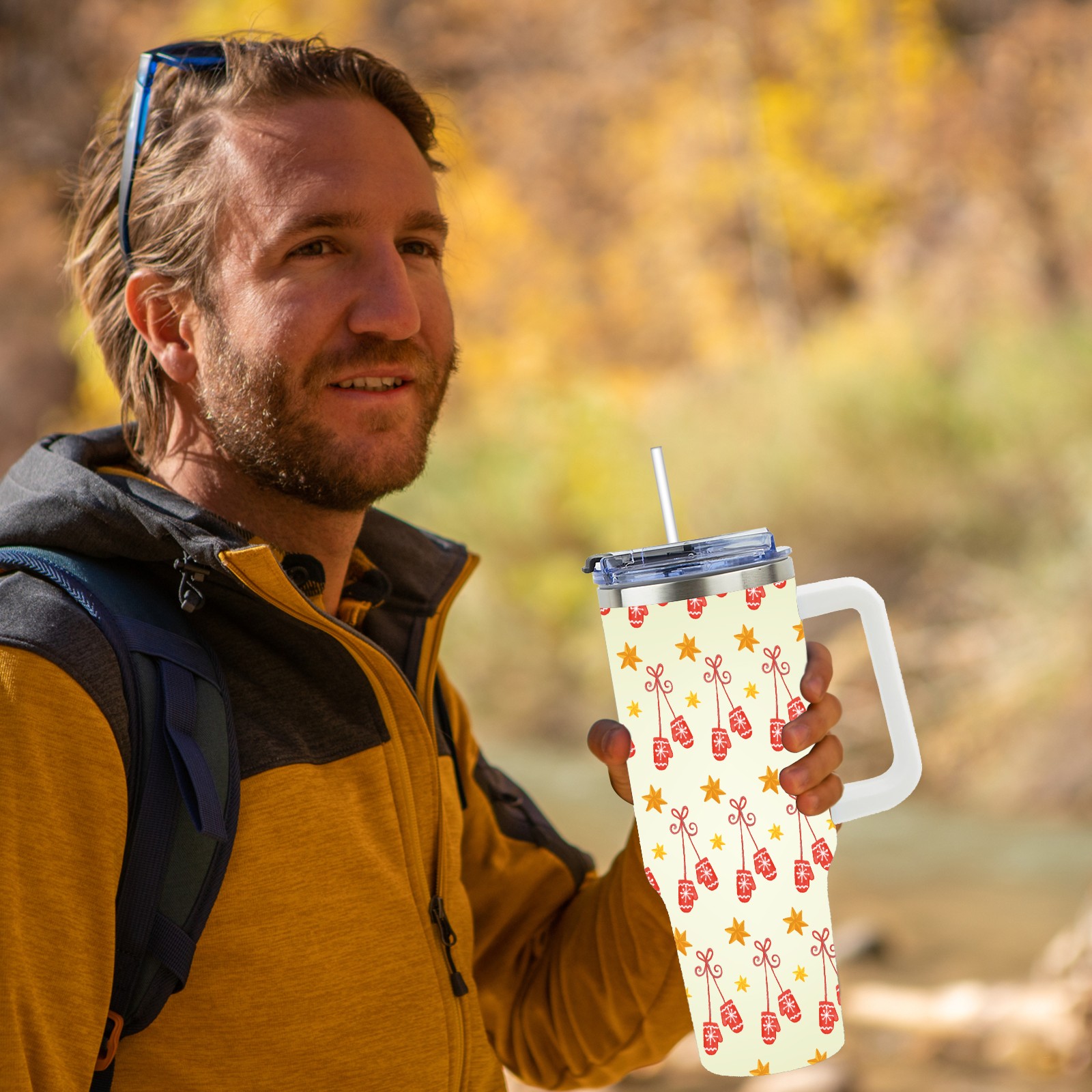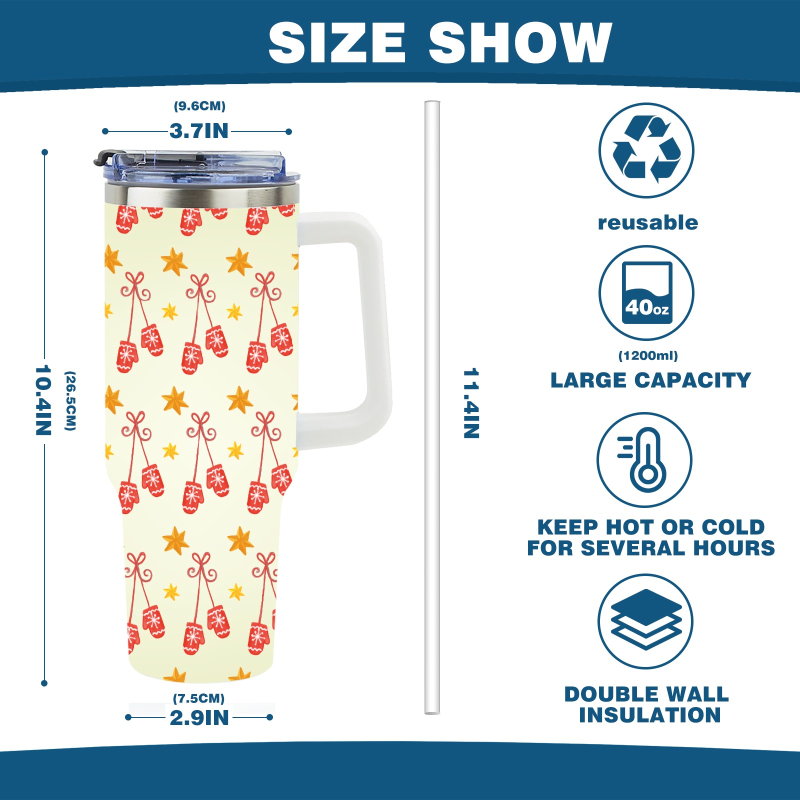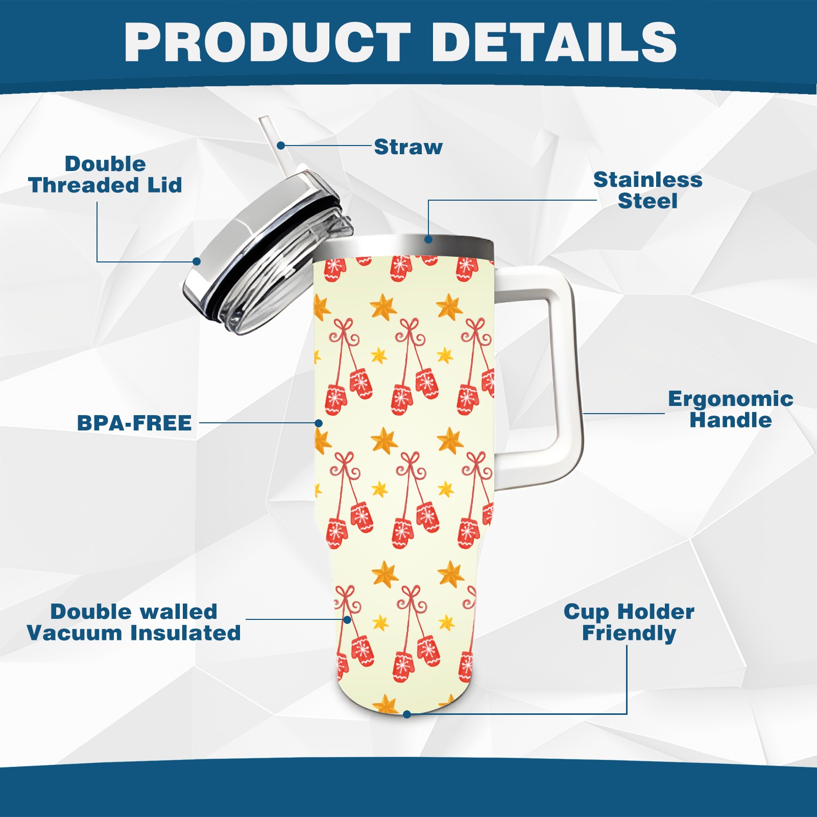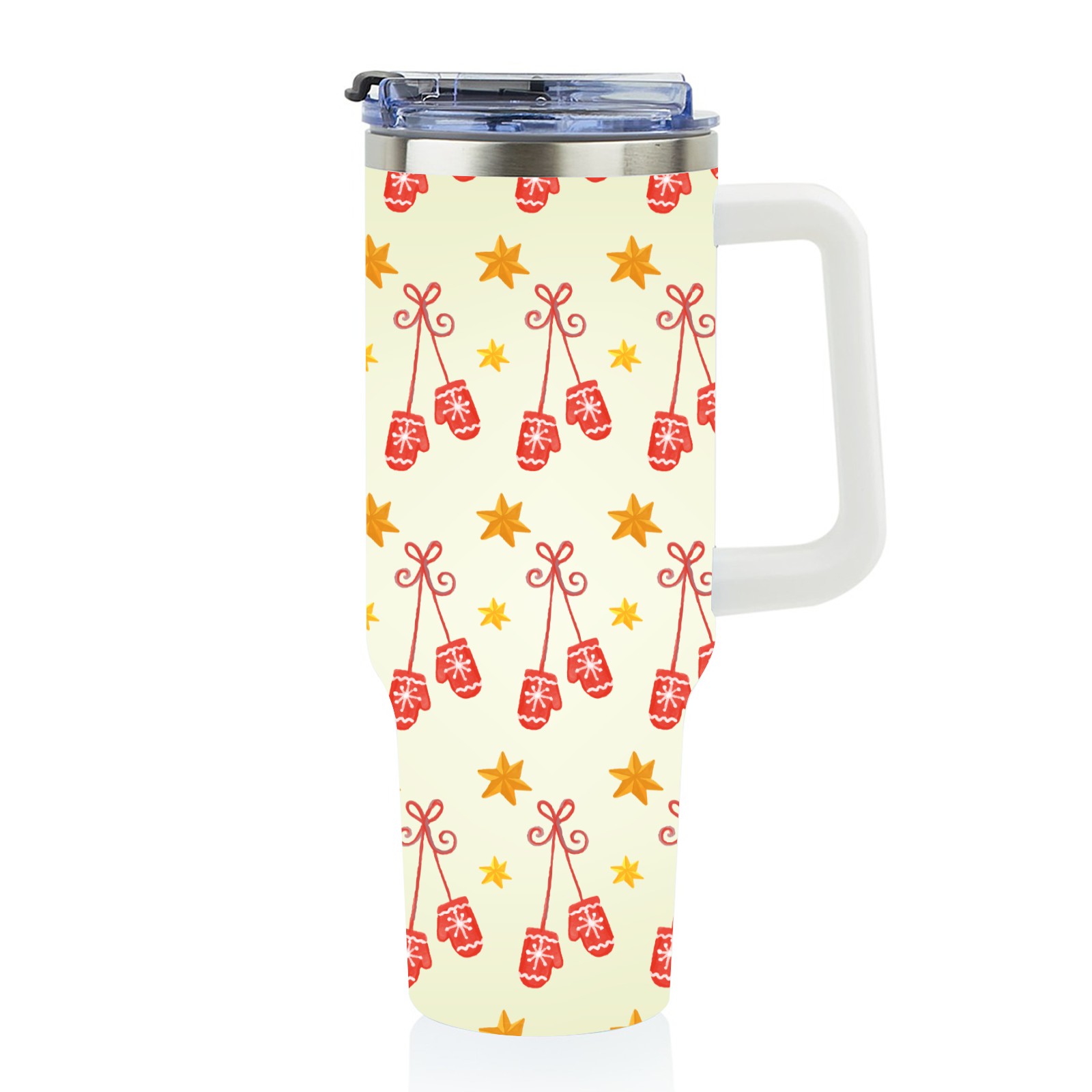 40oz Christmas Pattern With Gloves thermos with lid and straw, leak-proof stainless steel, with handle, spill-proof bottle, convenient for travel(blue)