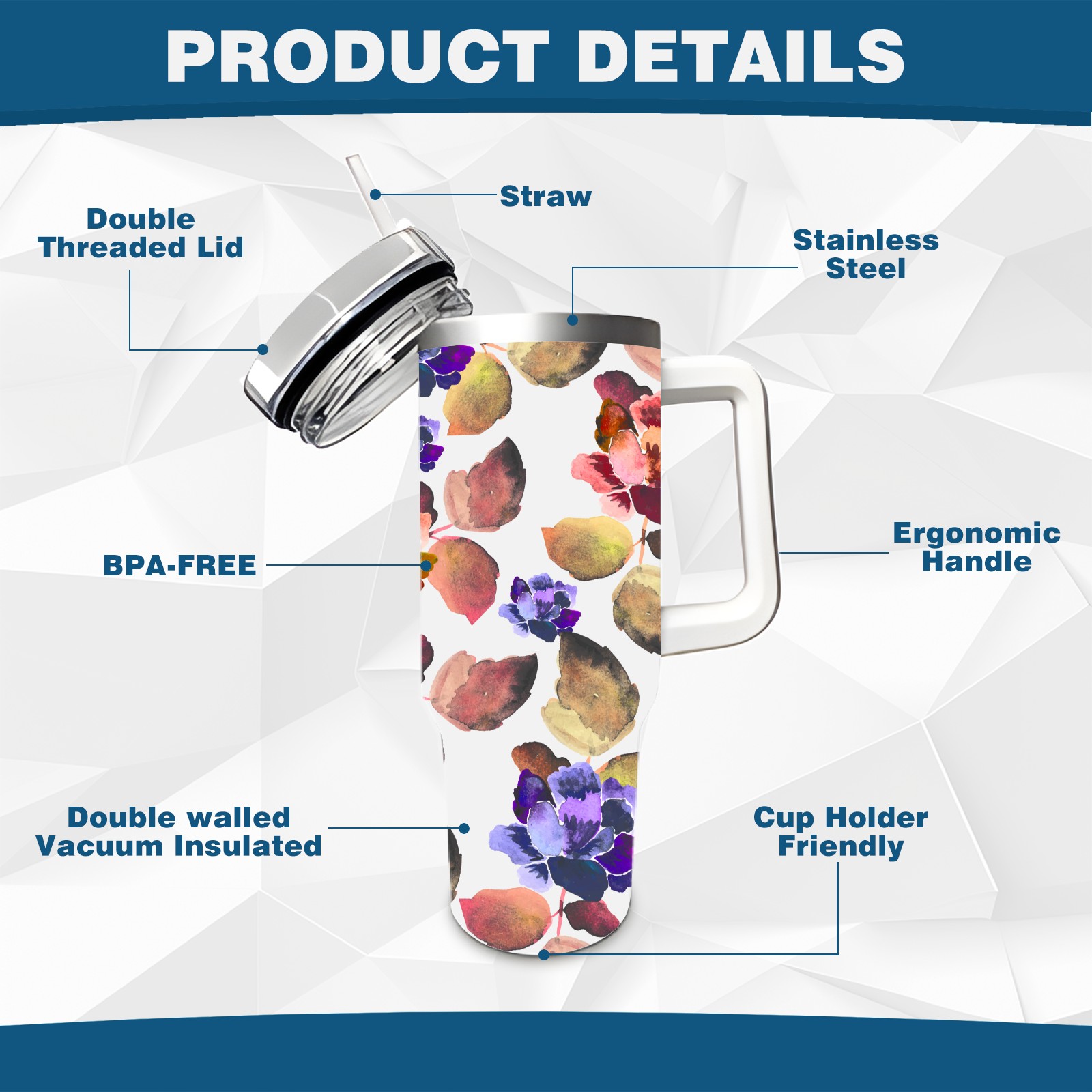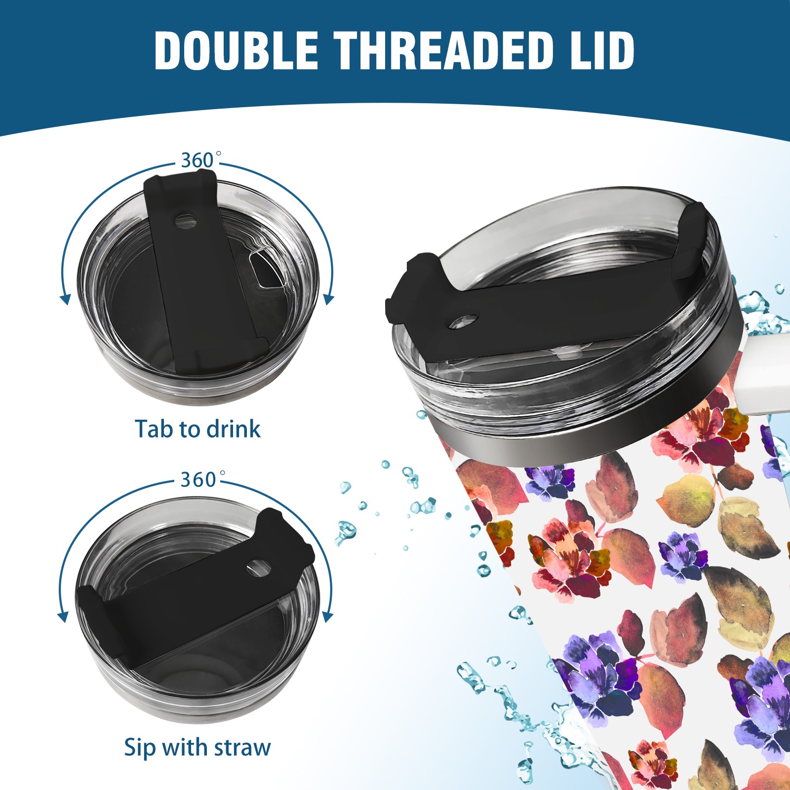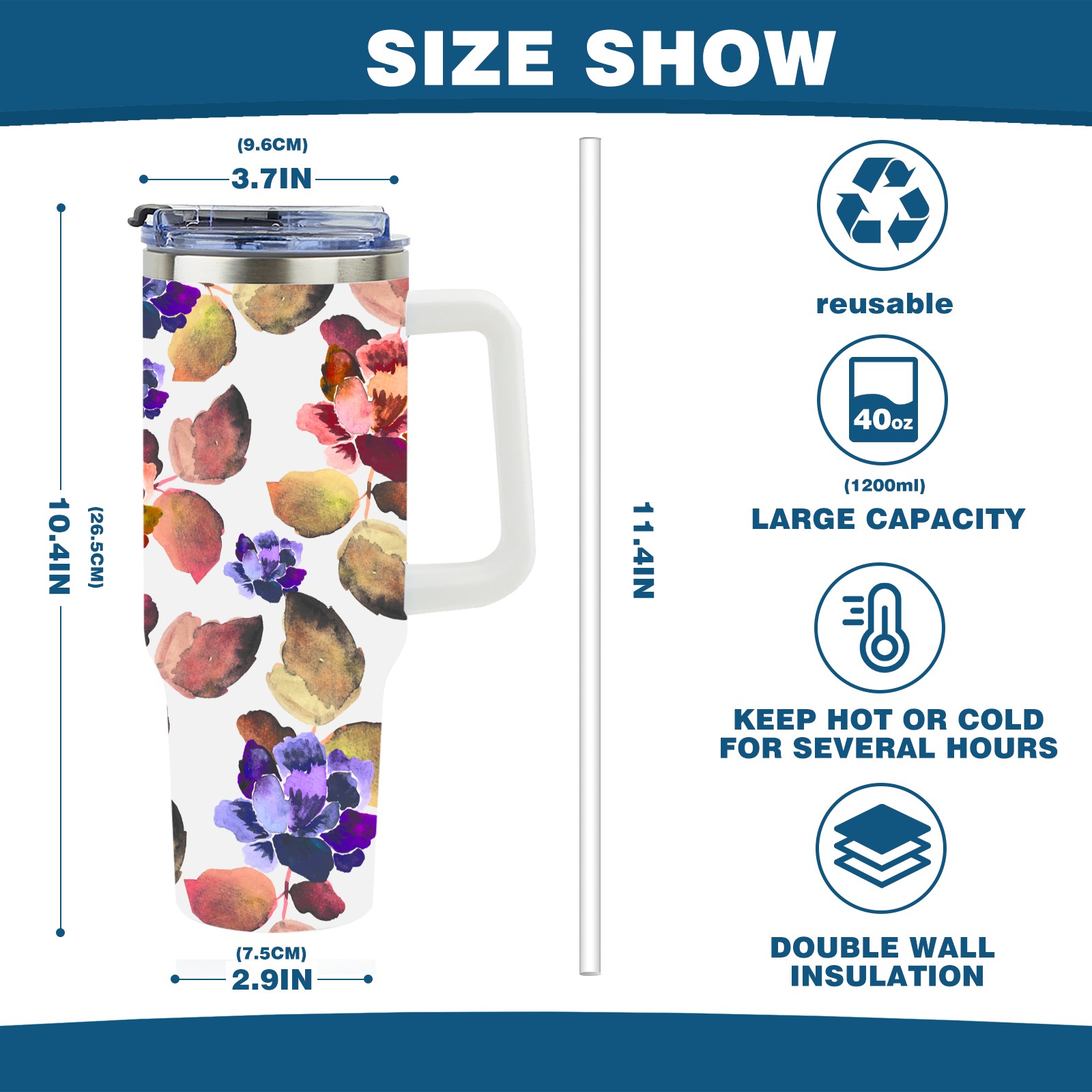 40oz Watercolor Vintage Flowers thermos with lid and straw, leak-proof stainless steel, with handle, spill-proof bottle, convenient for travel(blue)