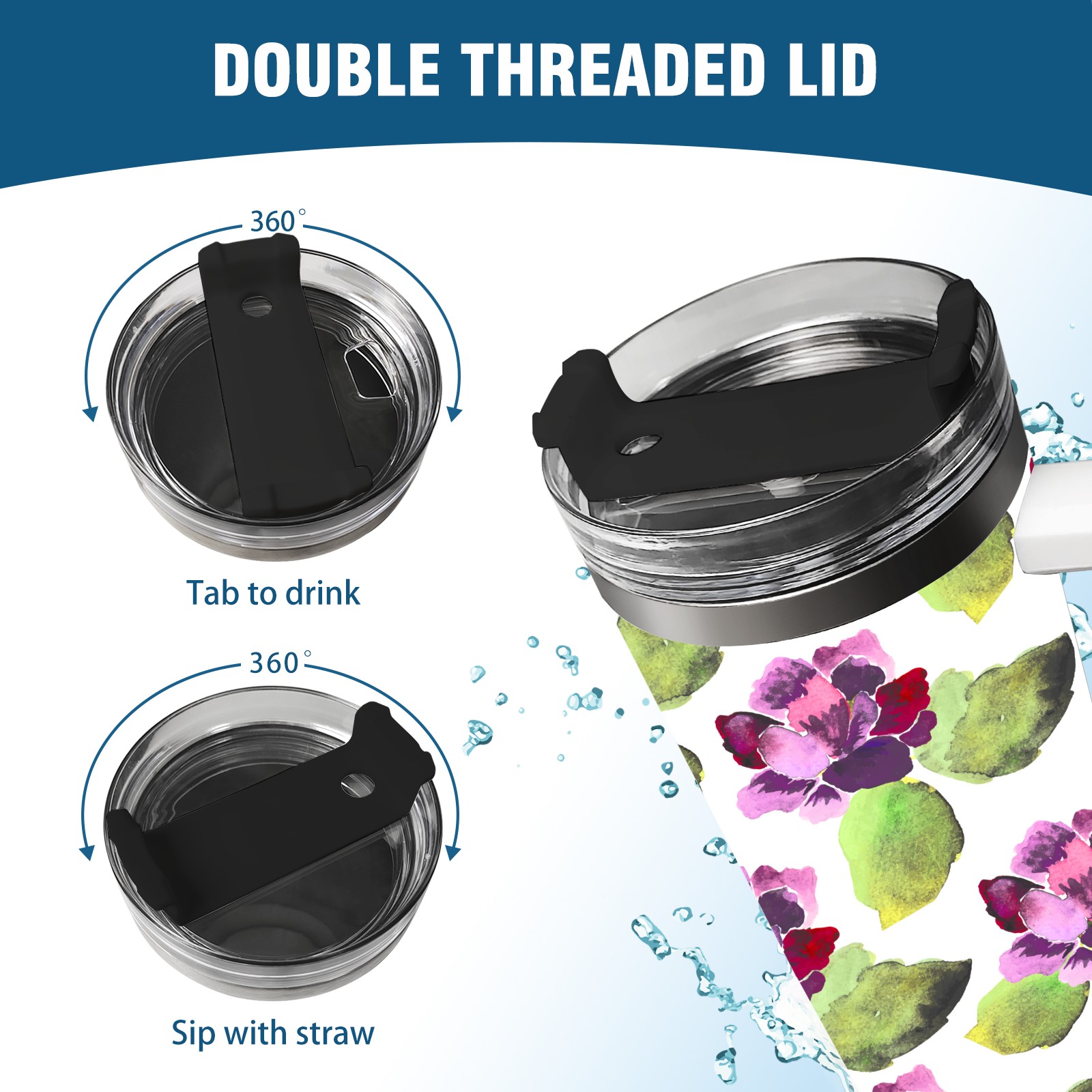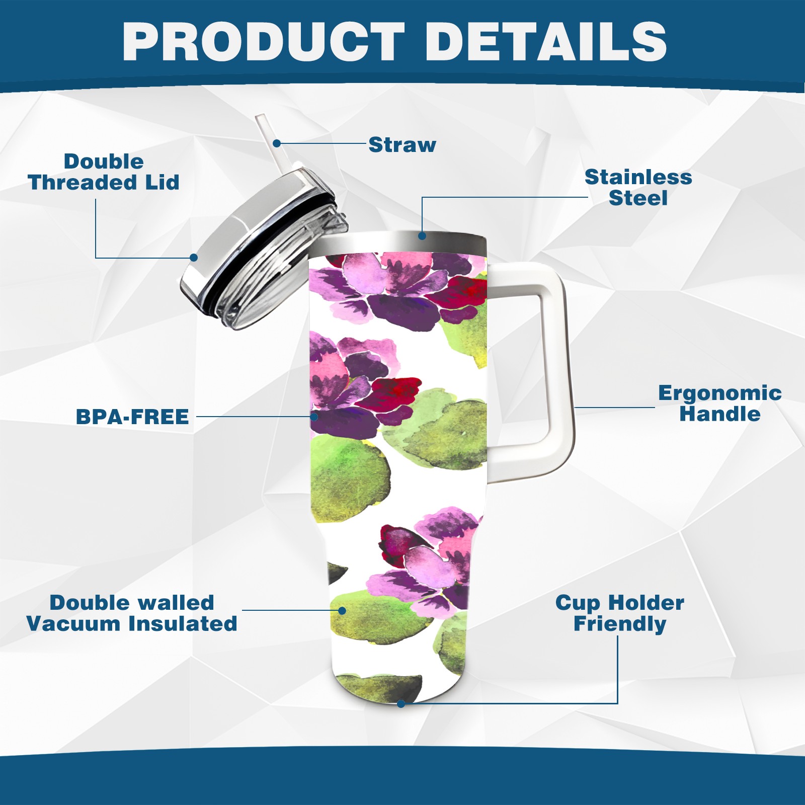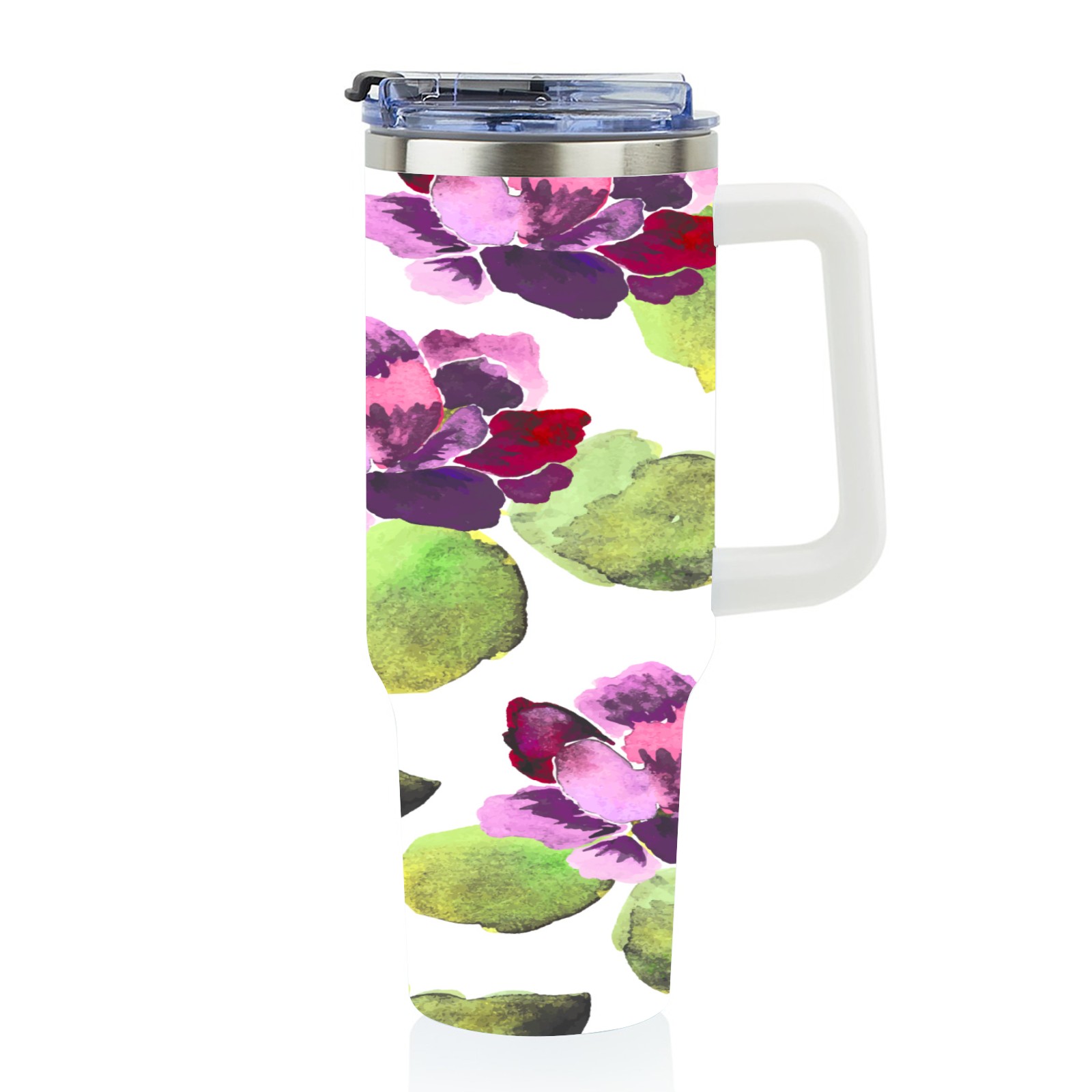 40oz Watercolor Purple Flowers thermos with lid and straw, leak-proof stainless steel, with handle, spill-proof bottle, convenient for travel(blue)