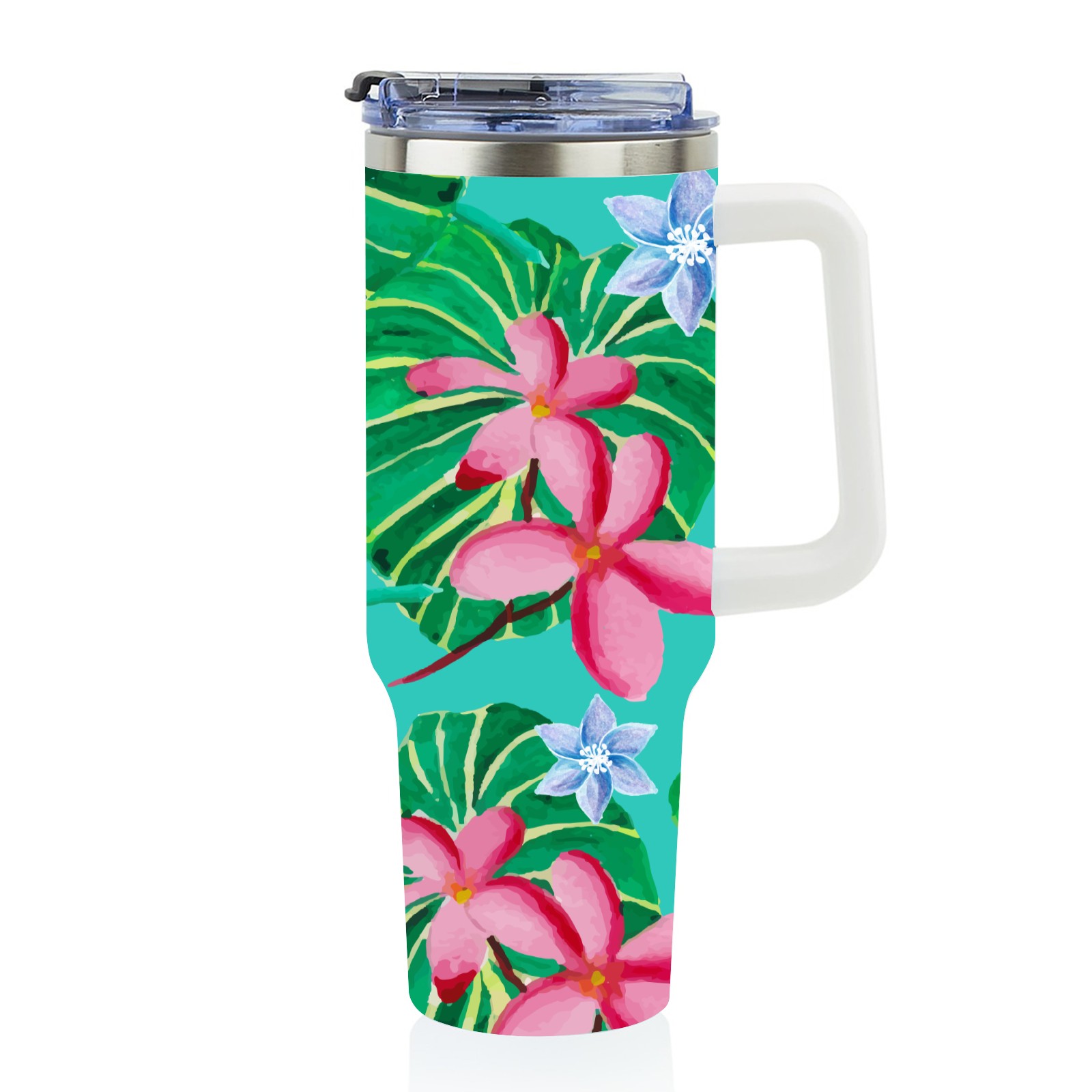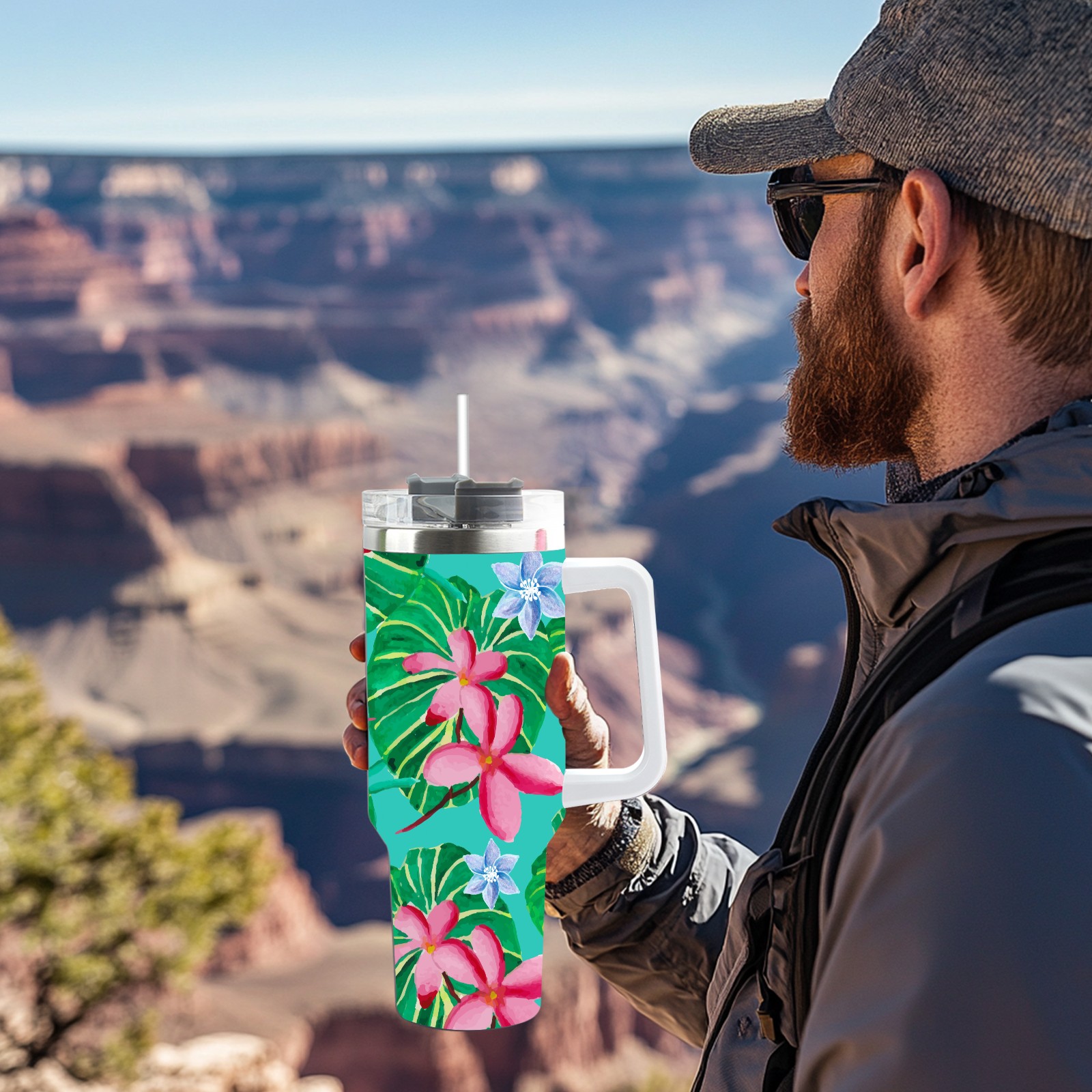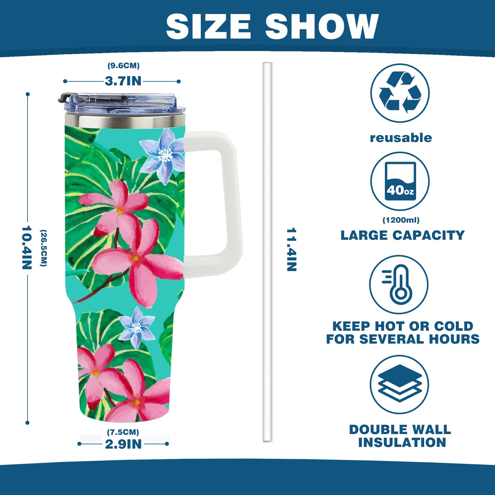 40oz Tropical Summer Plant thermos with lid and straw, leak-proof stainless steel, with handle, spill-proof bottle, convenient for travel(blue)