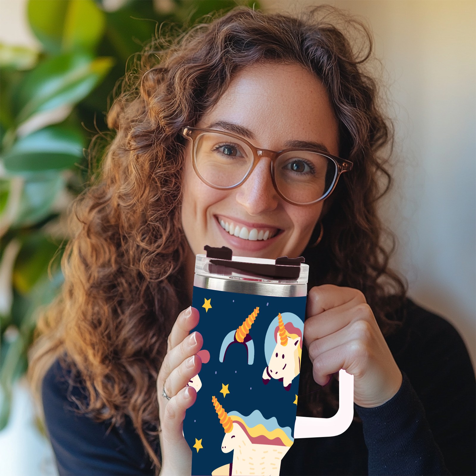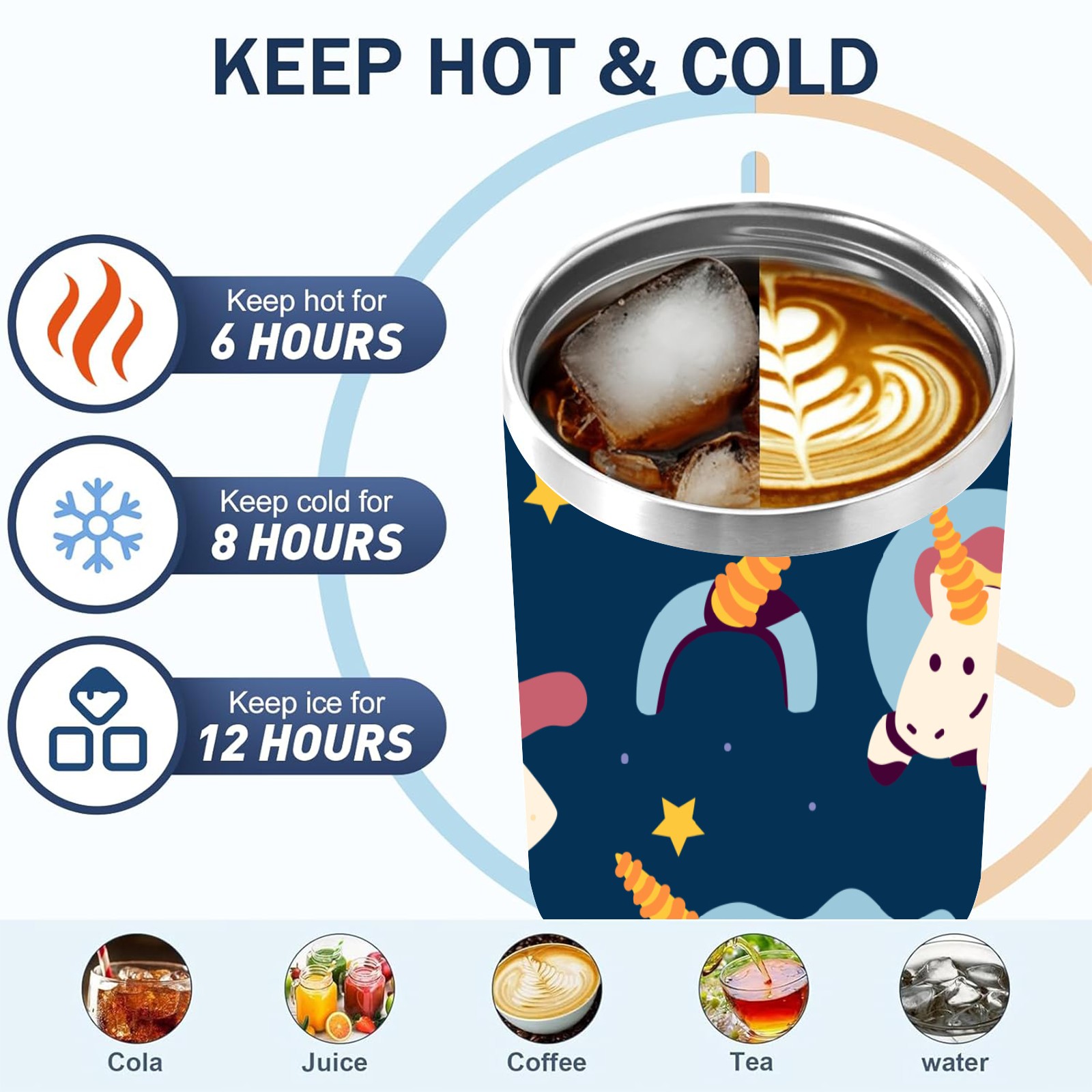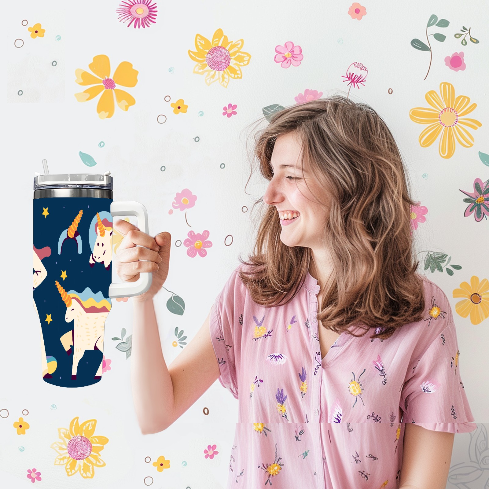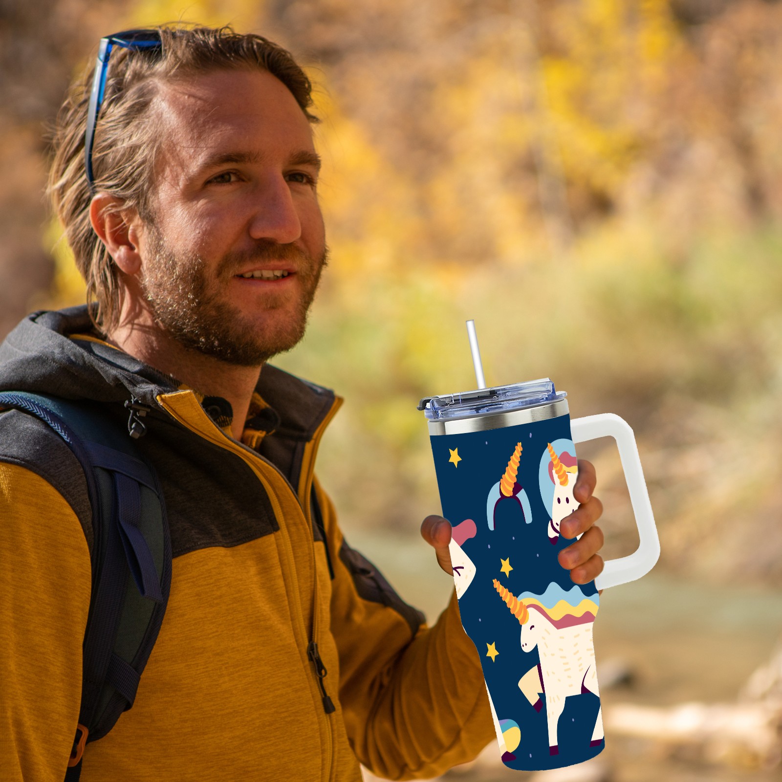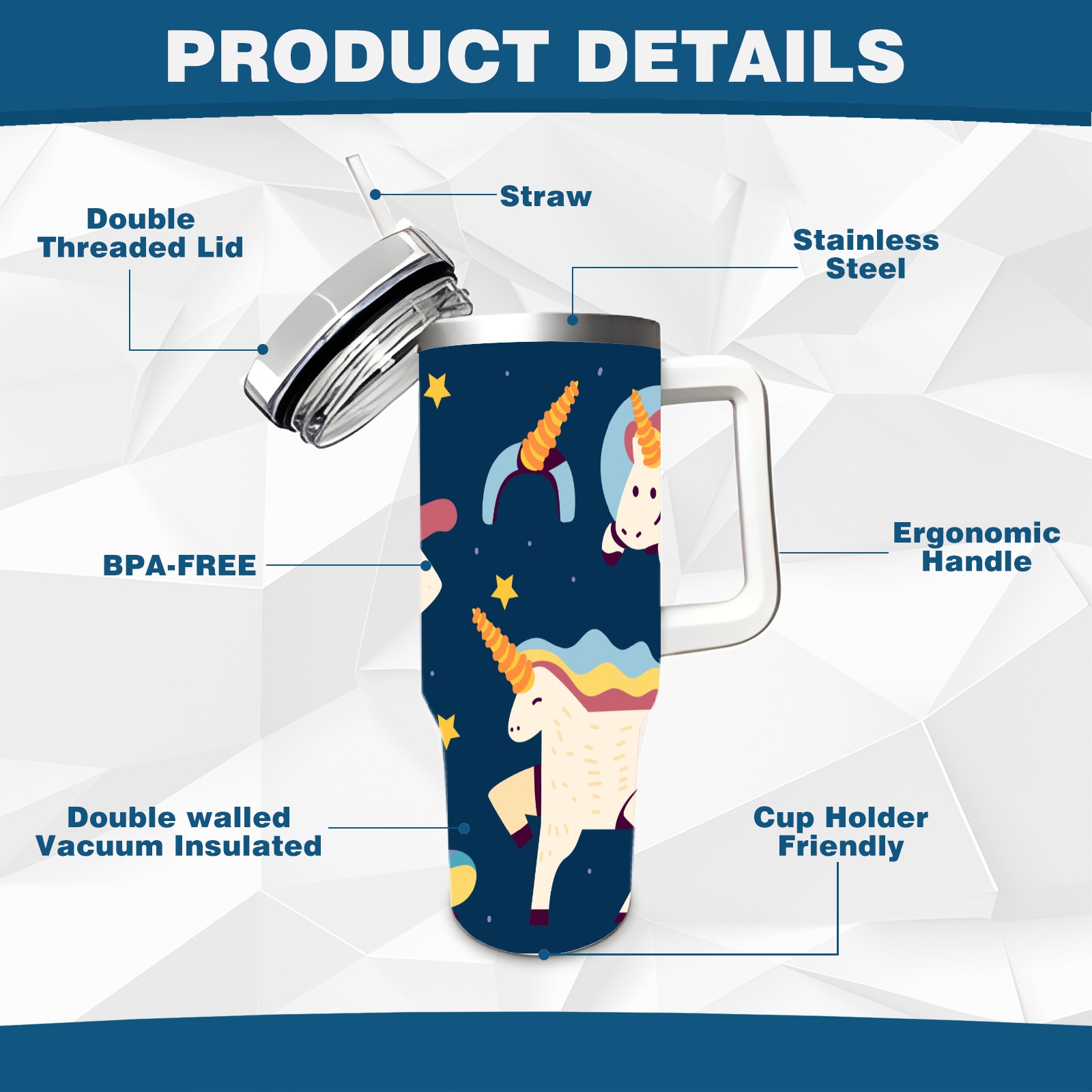 40oz Wannabe Unicorn Clipart Set-01 thermos with lid and straw, leak-proof stainless steel, with handle, spill-proof bottle, convenient for travel(blue)