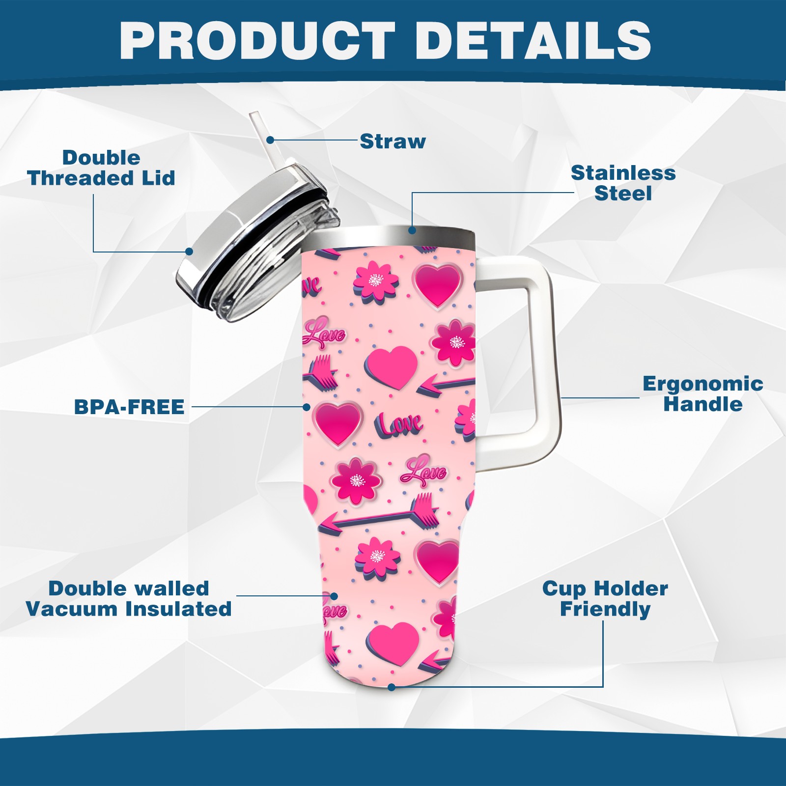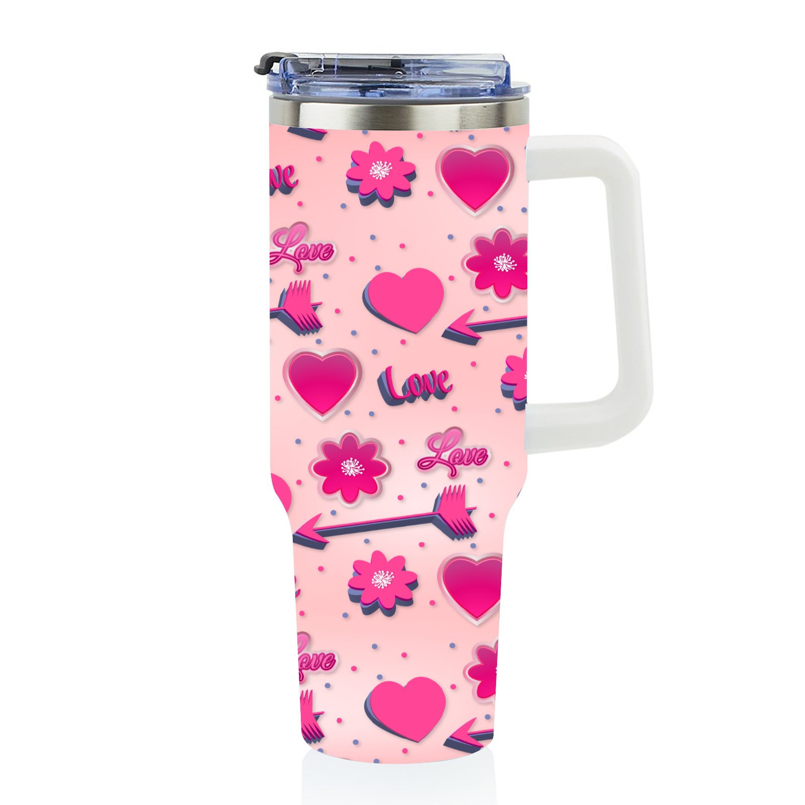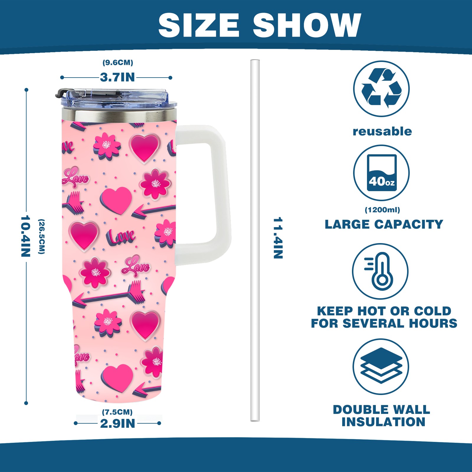 40oz Romantic Pink Pattern thermos with lid and straw, leak-proof stainless steel, with handle, spill-proof bottle, convenient for travel(blue)