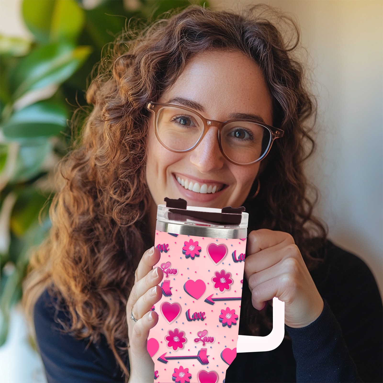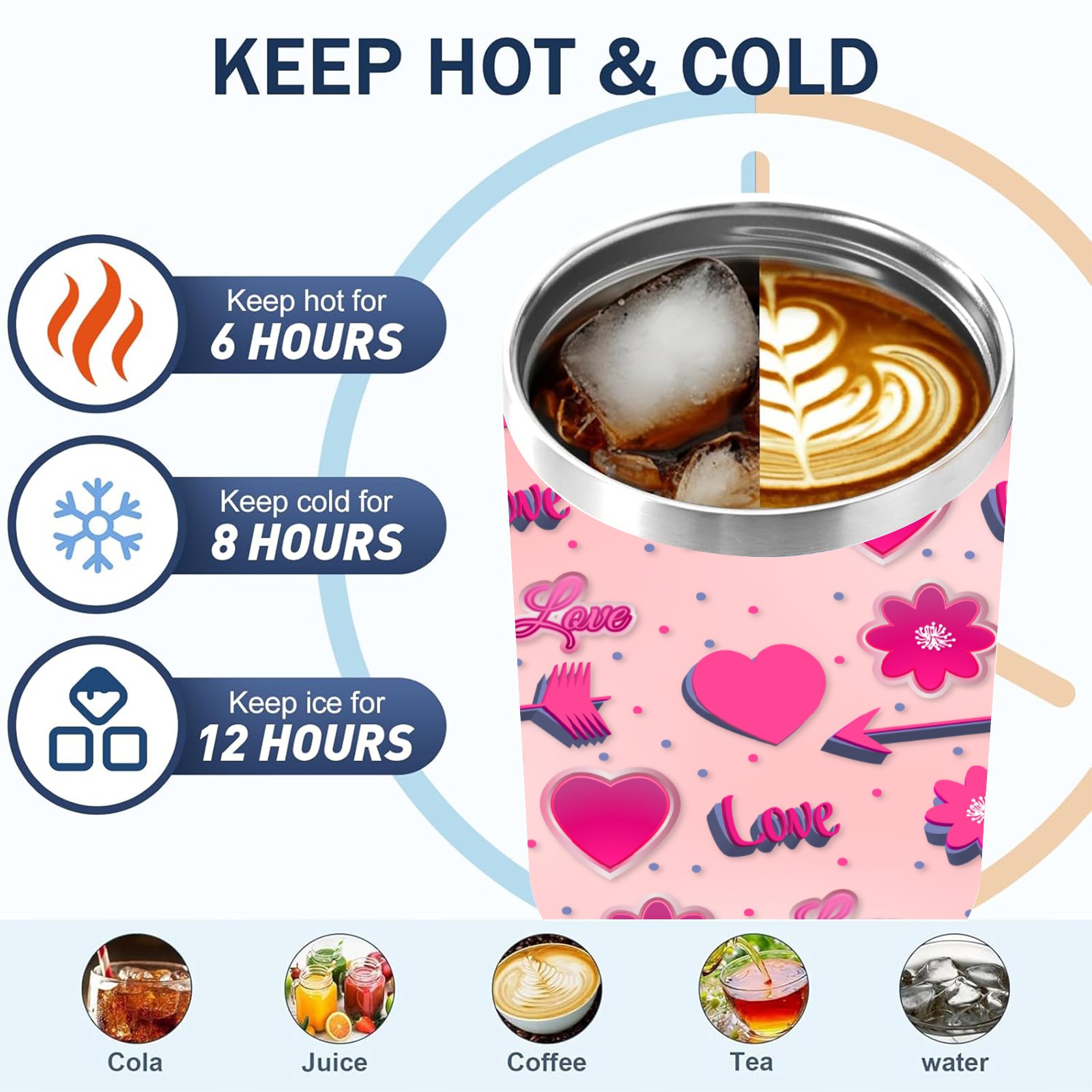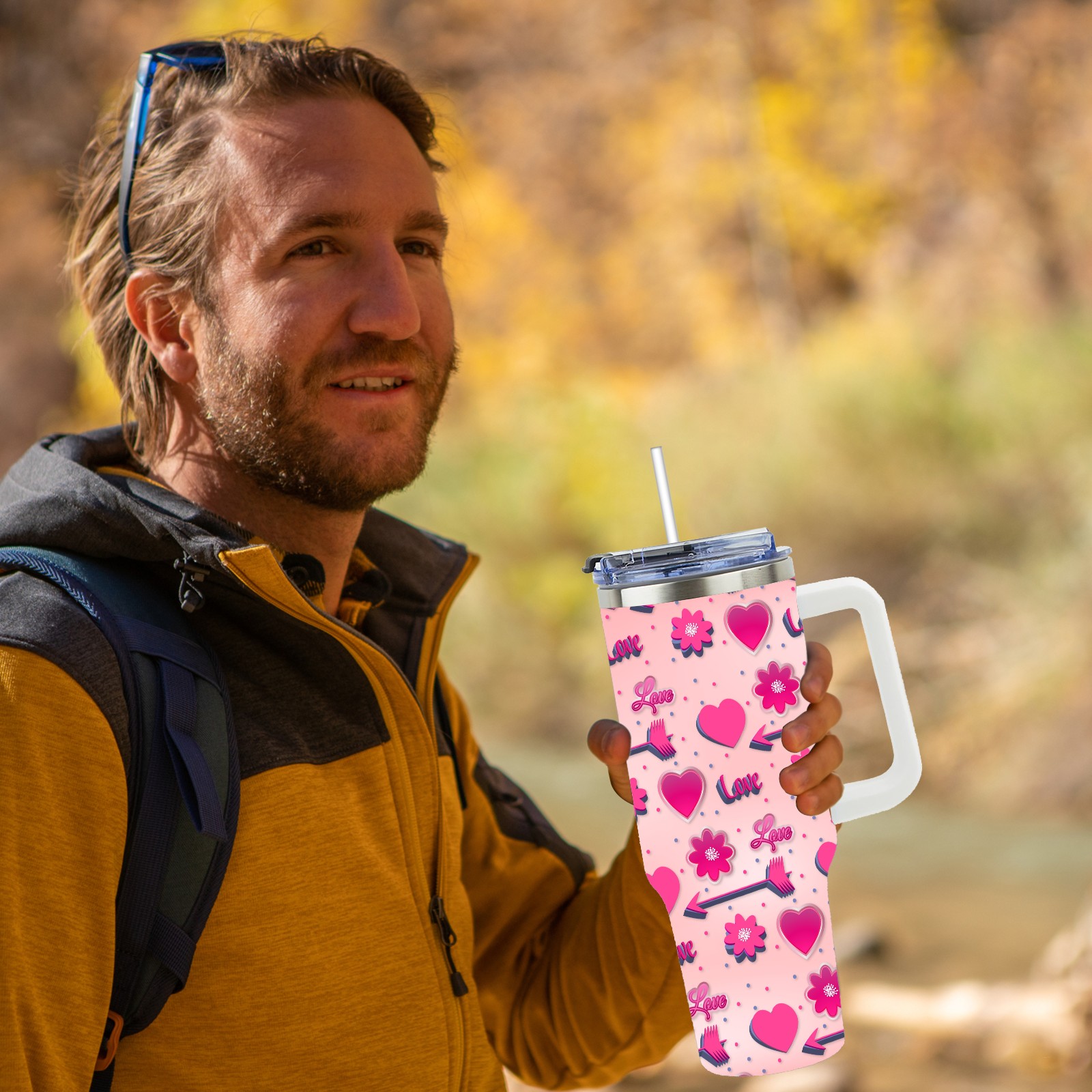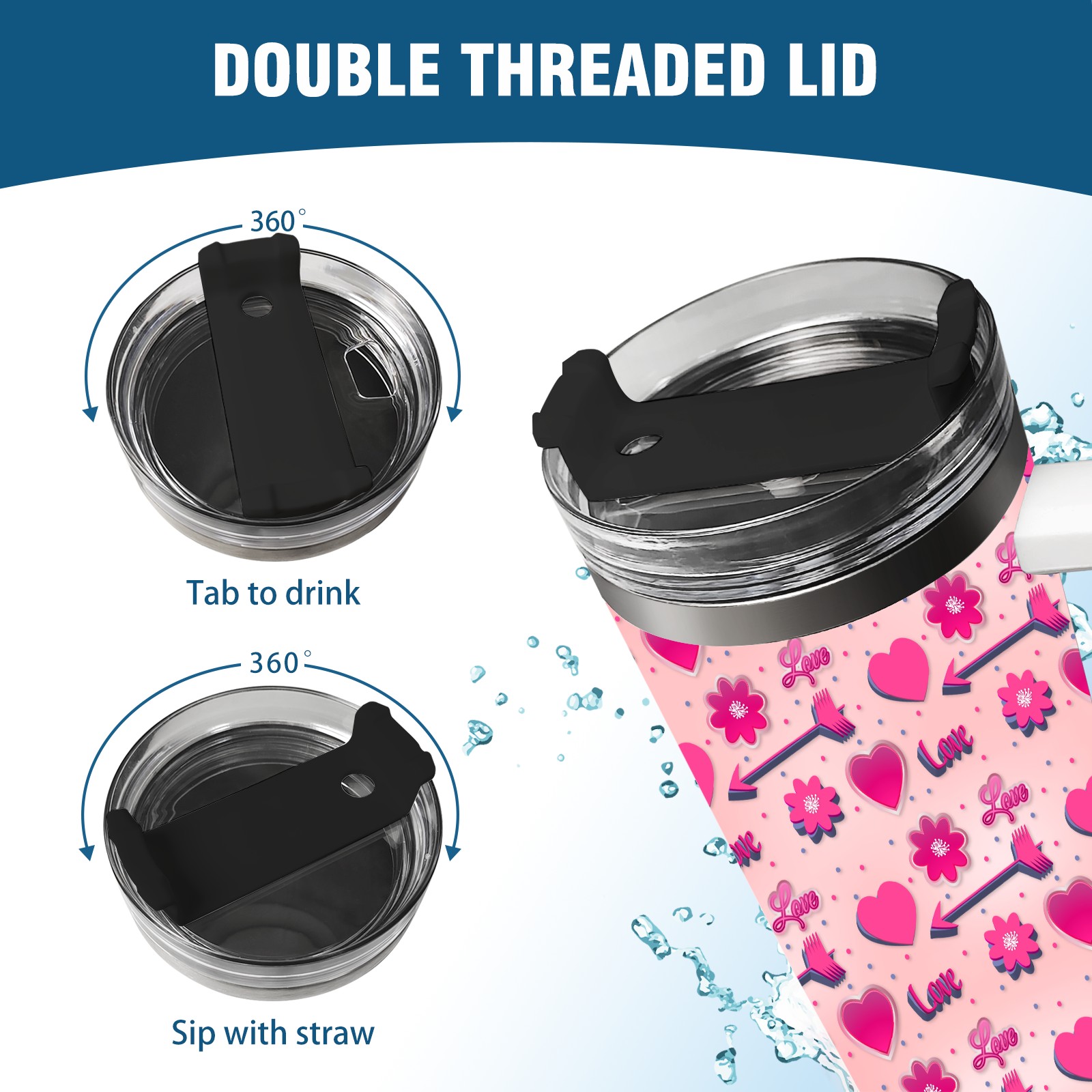 40oz Romantic Pink Pattern thermos with lid and straw, leak-proof stainless steel, with handle, spill-proof bottle, convenient for travel(blue)