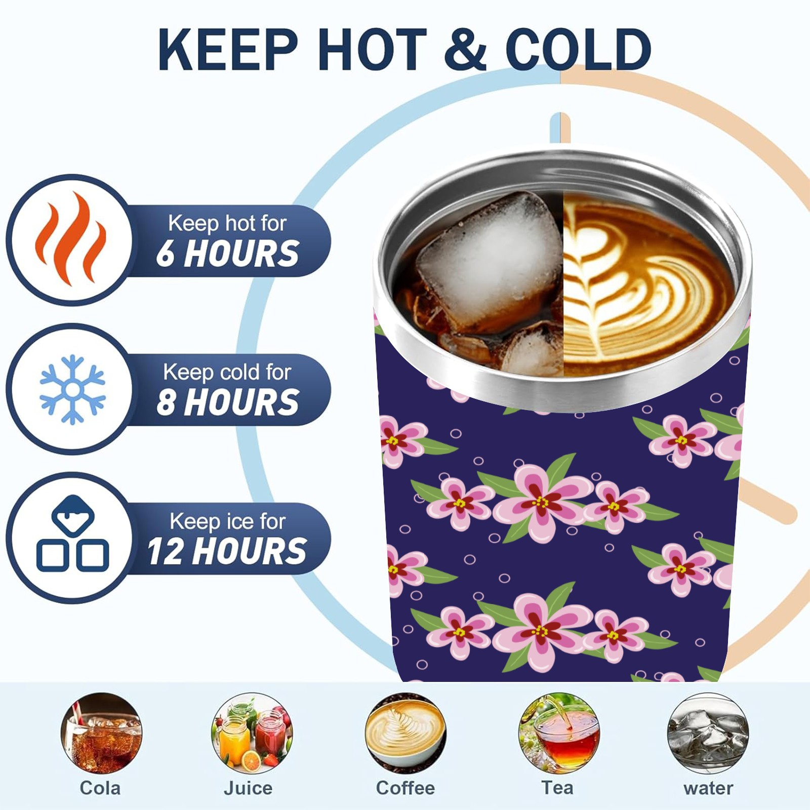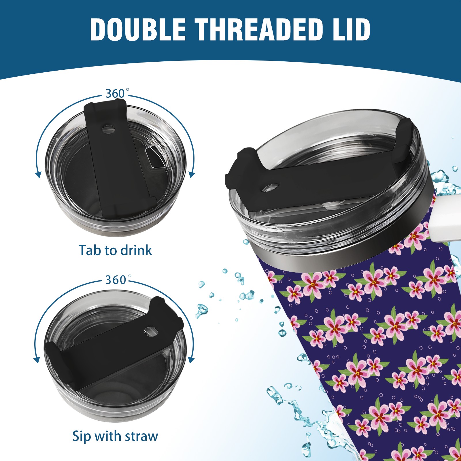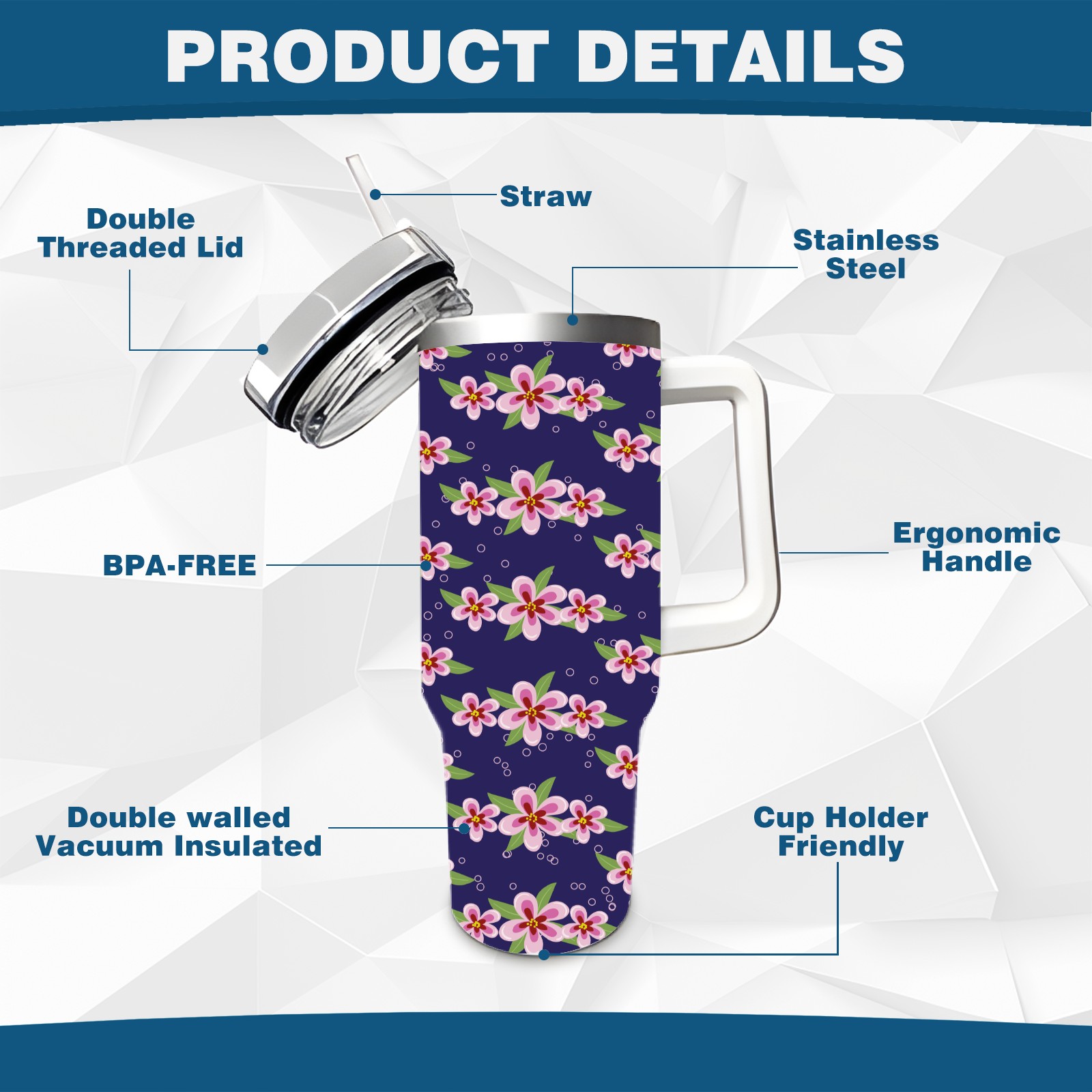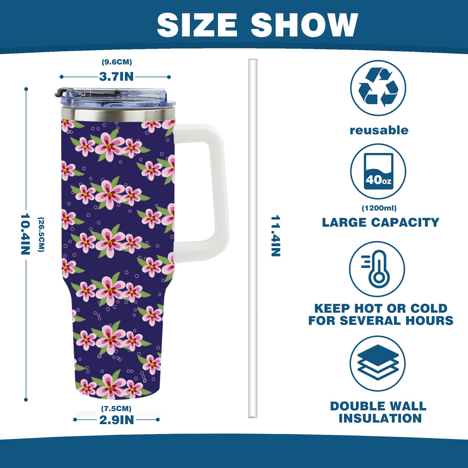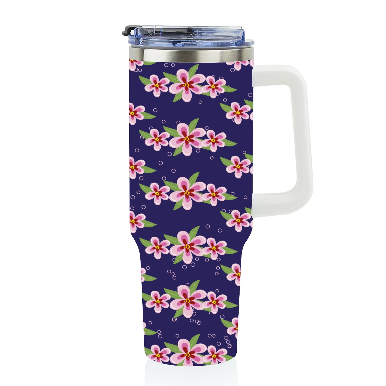 40oz Pink Cherry Blossom thermos with lid and straw, leak-proof stainless steel, with handle, spill-proof bottle, convenient for travel(blue)