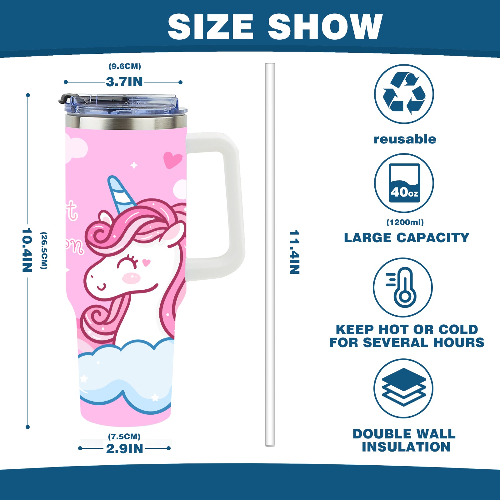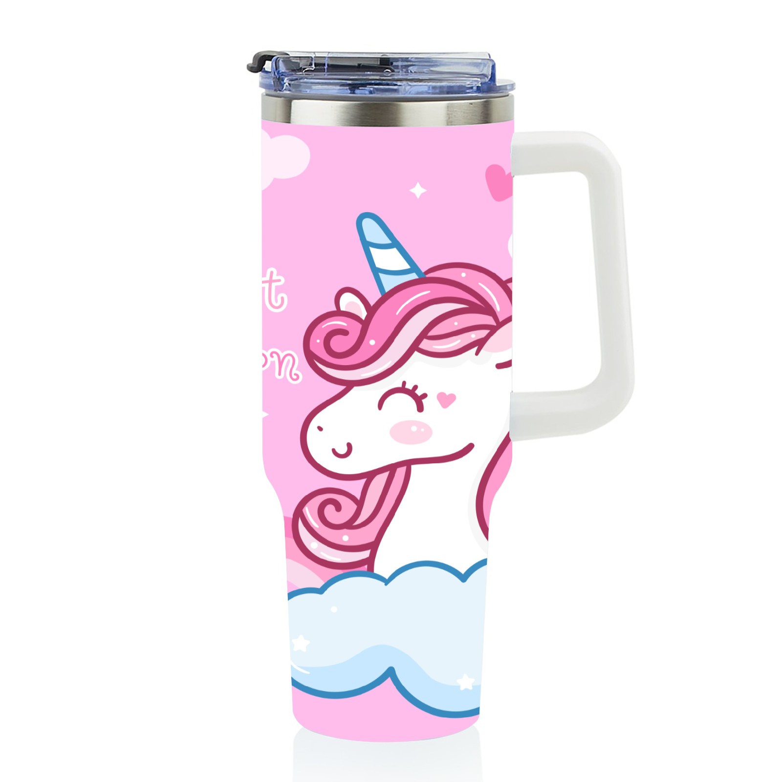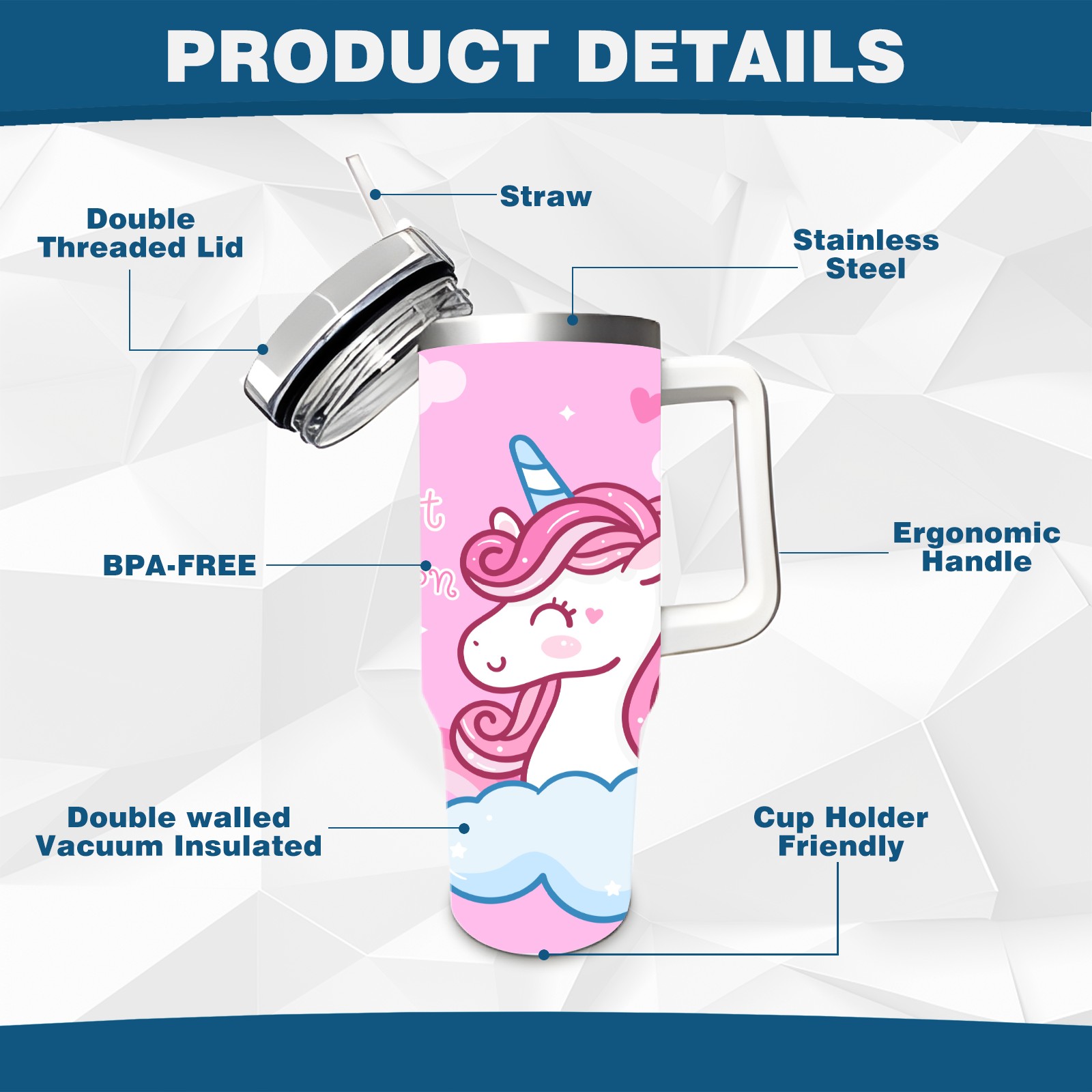 40oz Kawaii Unicorn Head thermos with lid and straw, leak-proof stainless steel, with handle, spill-proof bottle, convenient for travel(blue)