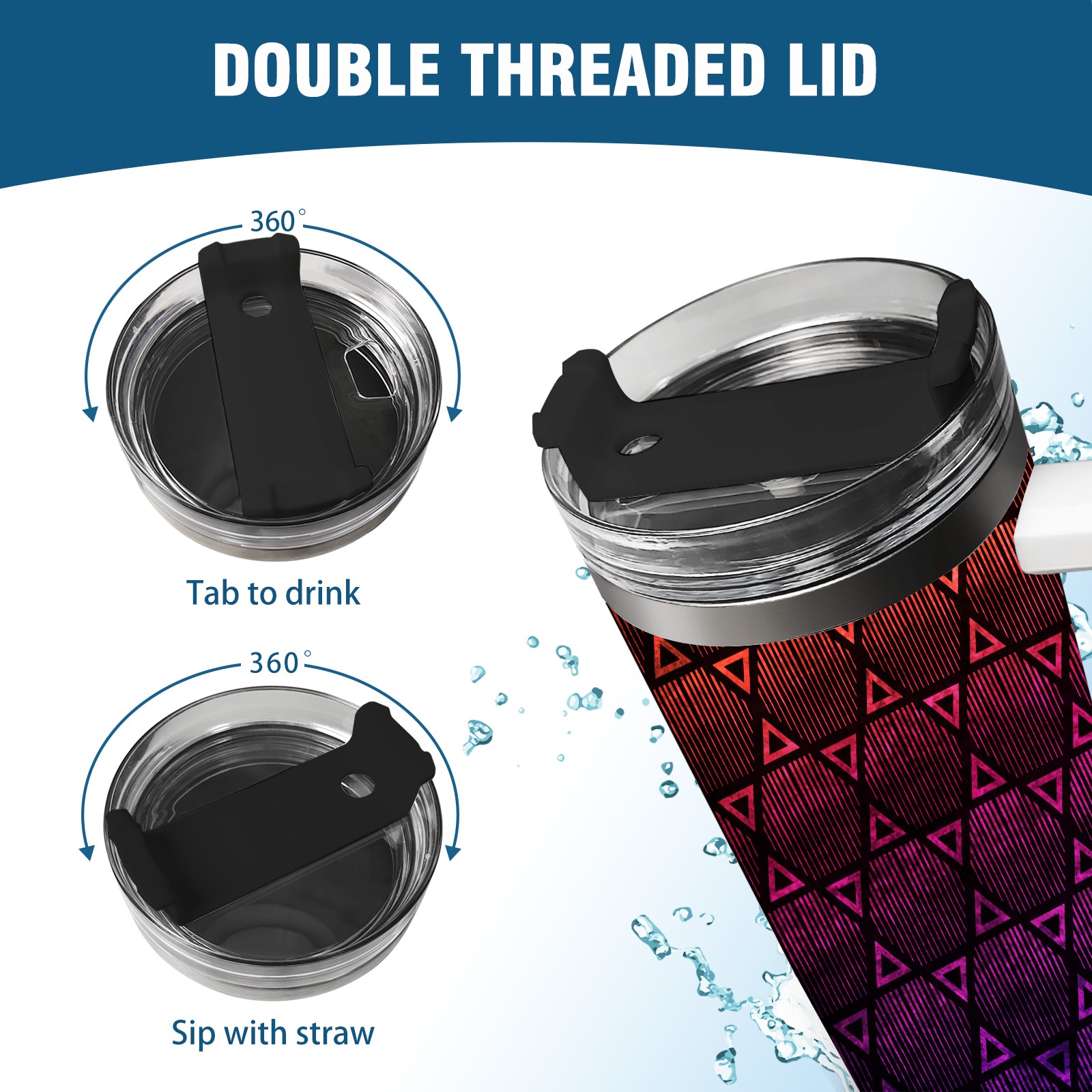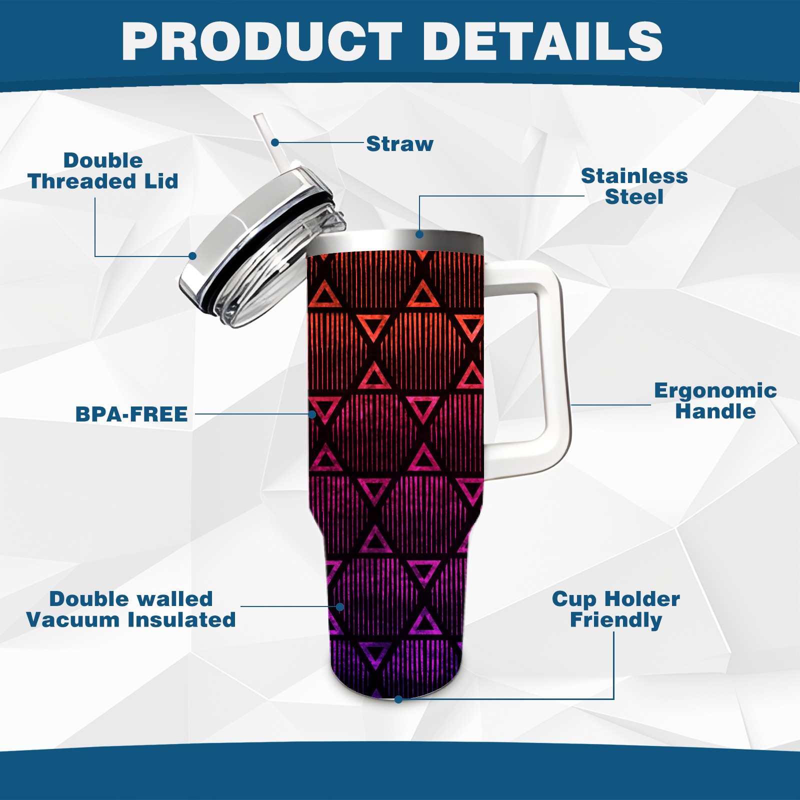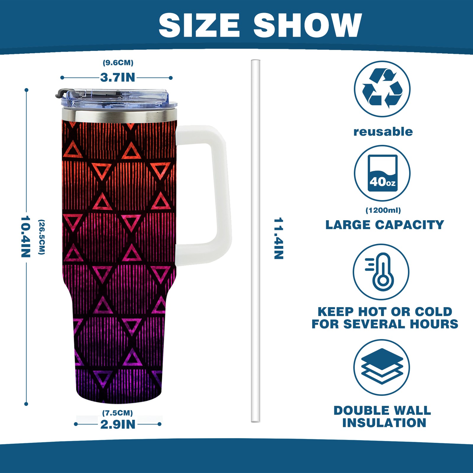 40oz Geometric Pattern thermos with lid and straw, leak-proof stainless steel, with handle, spill-proof bottle, convenient for travel(blue)
