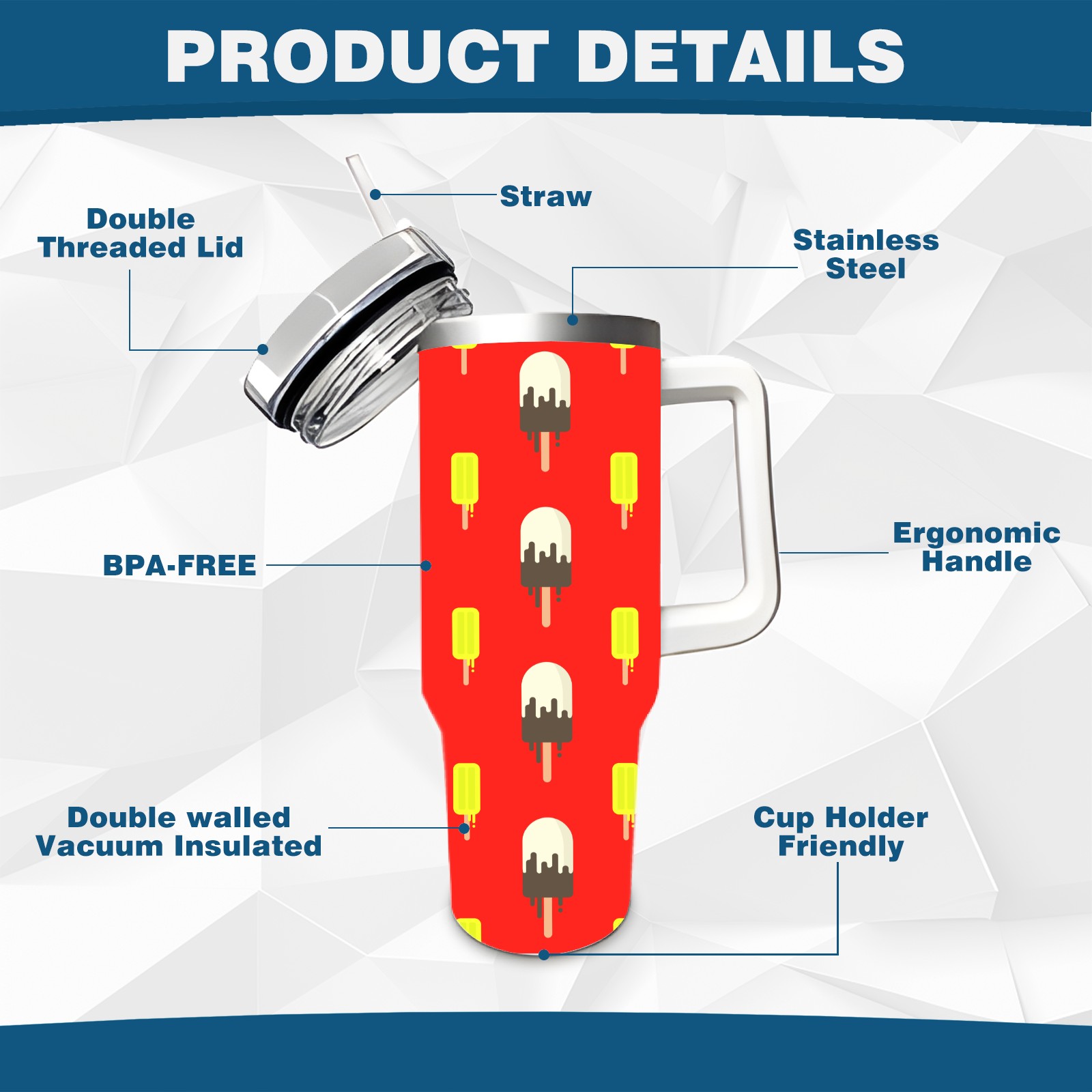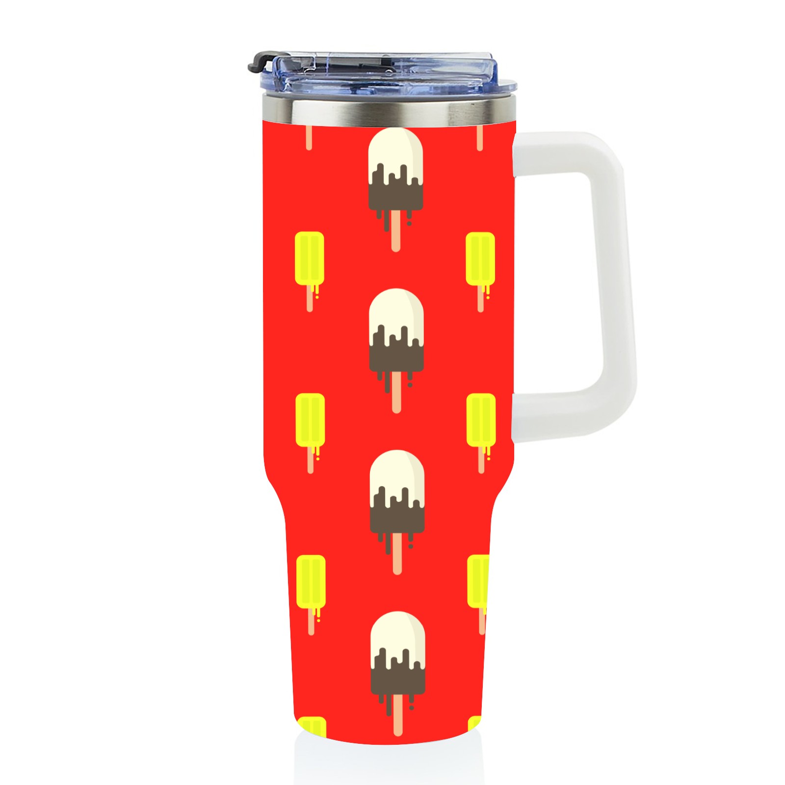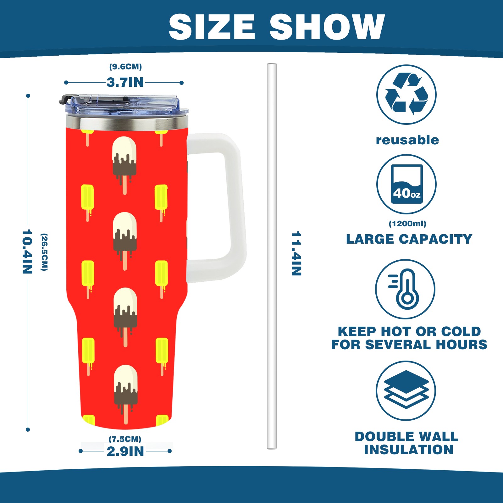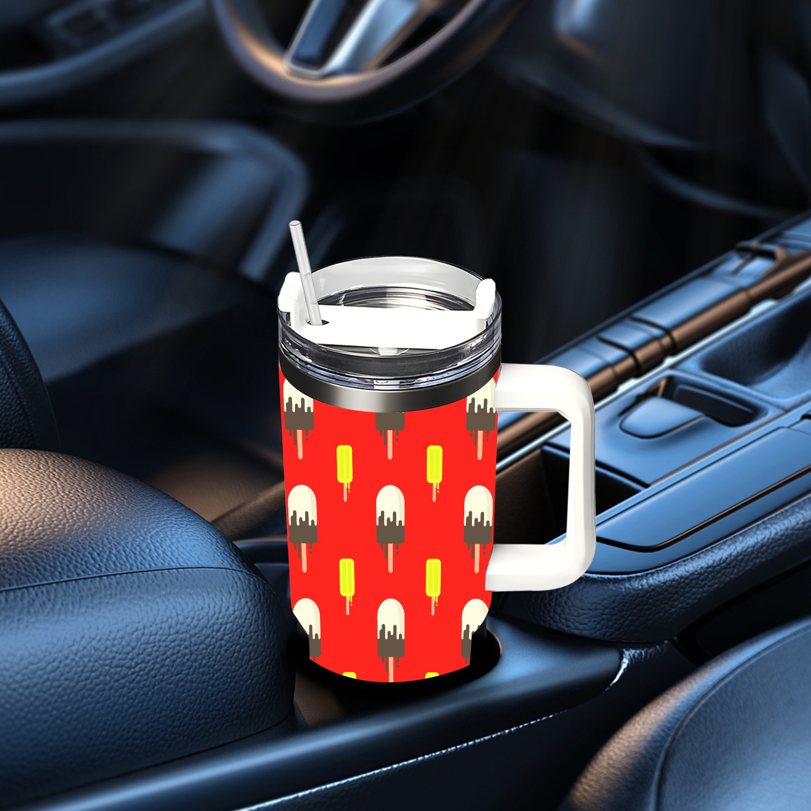 40oz Ice Cream Pattern thermos with lid and straw, leak-proof stainless steel, with handle, spill-proof bottle, convenient for travel(blue)