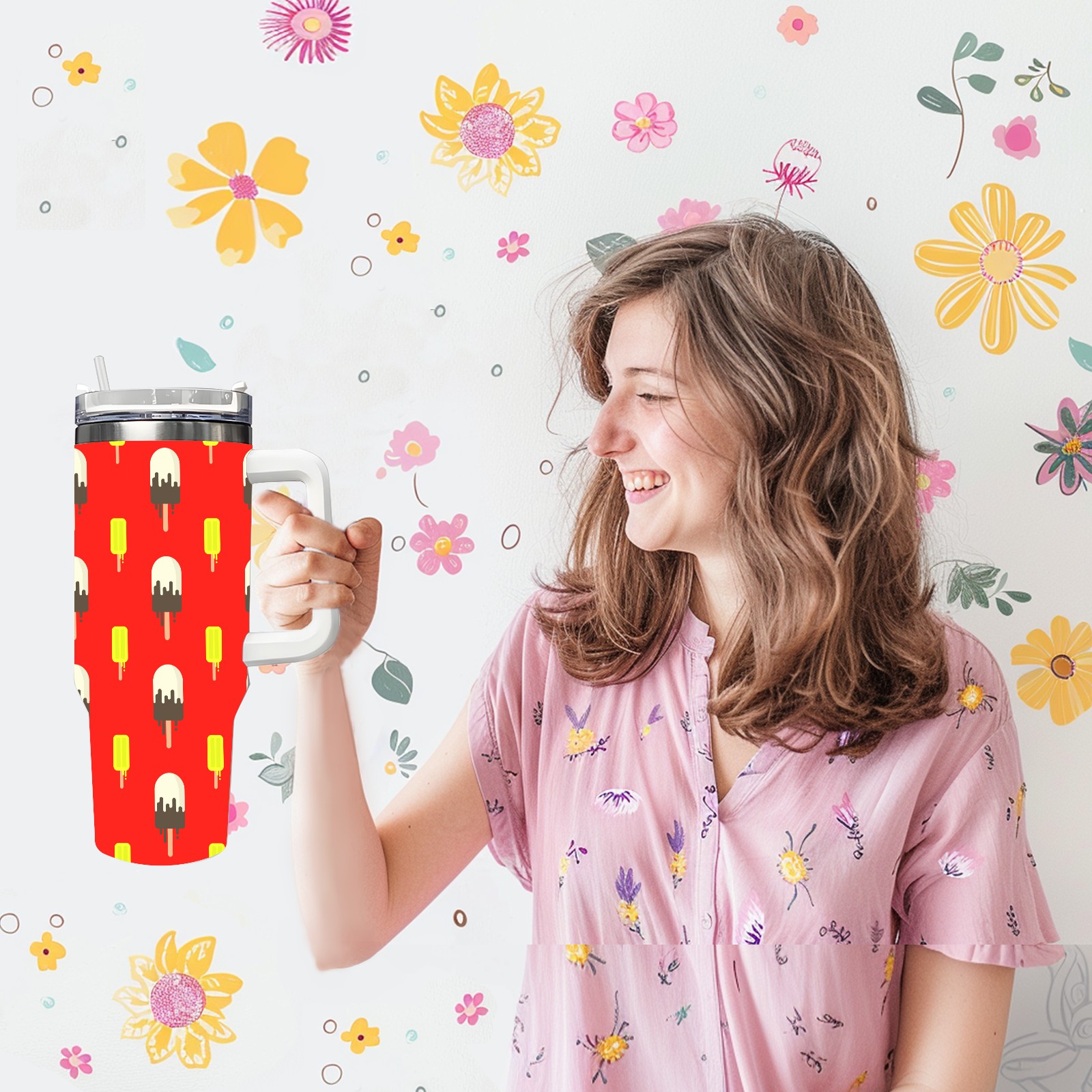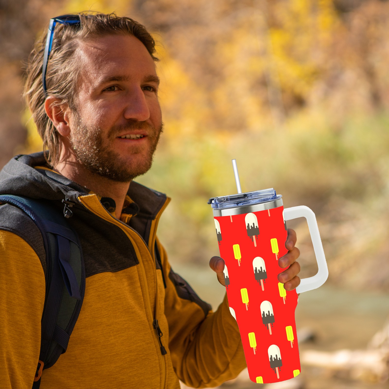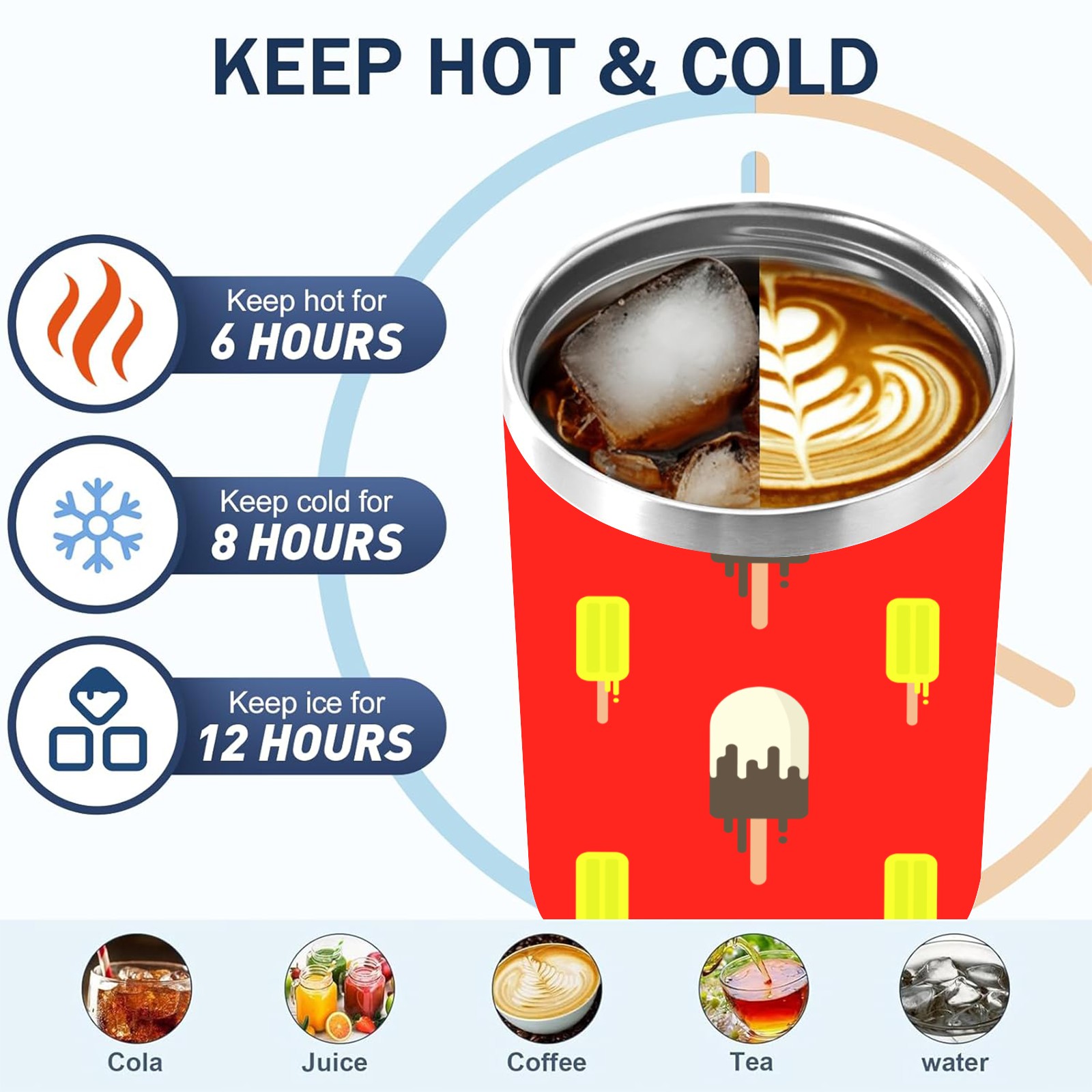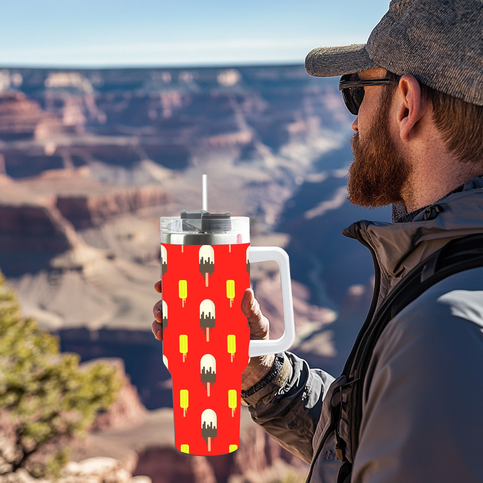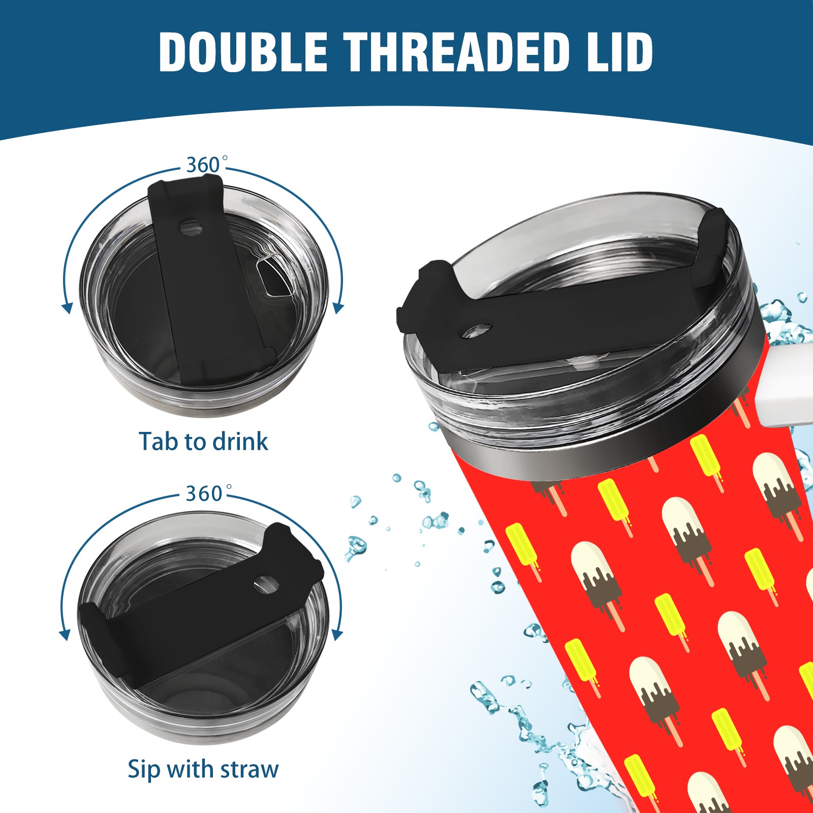 40oz Ice Cream Pattern thermos with lid and straw, leak-proof stainless steel, with handle, spill-proof bottle, convenient for travel(blue)