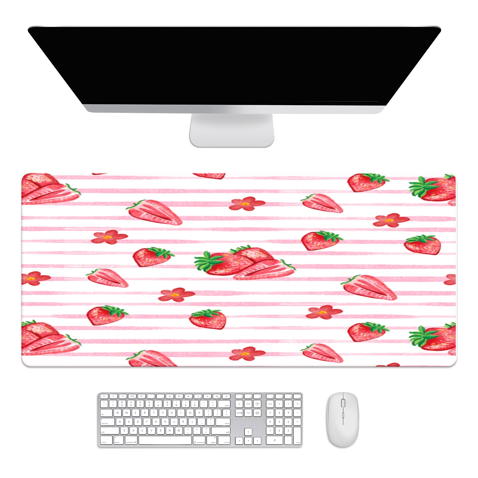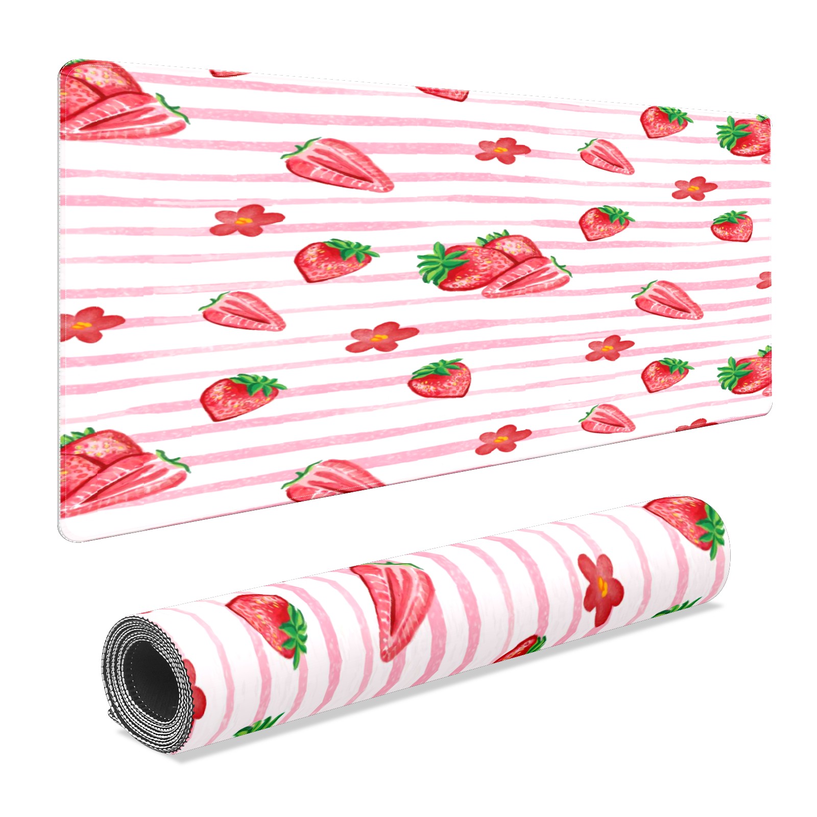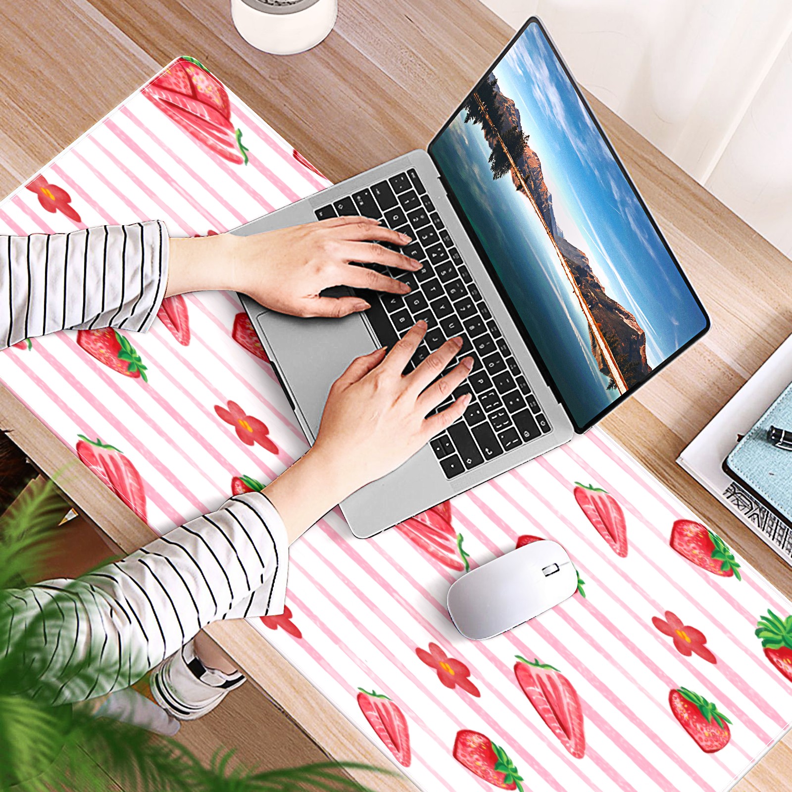 Large Mouse Pad for Desktop, Cute Desk Mat Pad Protector for Work & Gaming, Aesthetic Pretty Anti-Slip Laptop Blotter Cover for Office School Home Supplies, Striped Watercolor Strawberries , 35.4inx15.7in