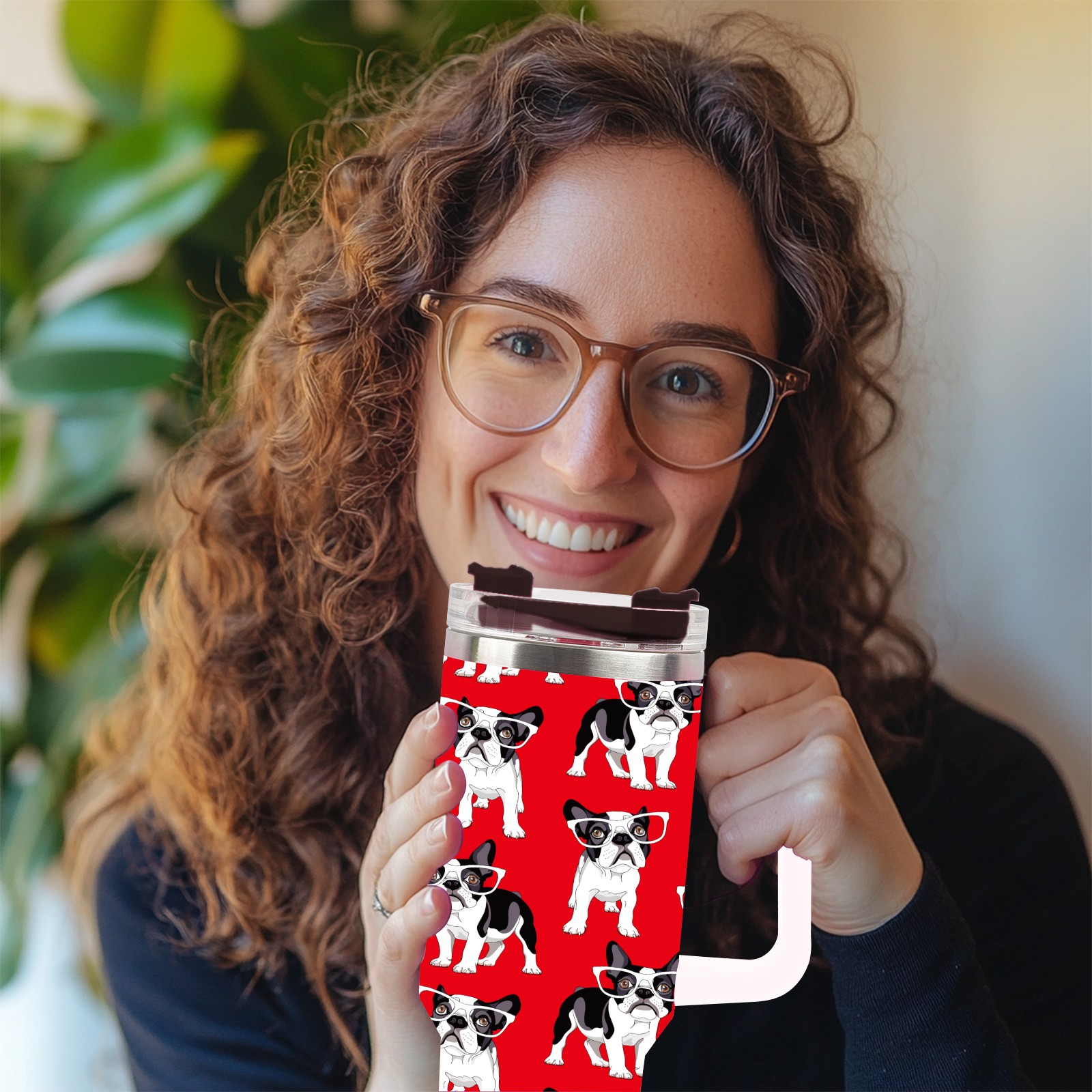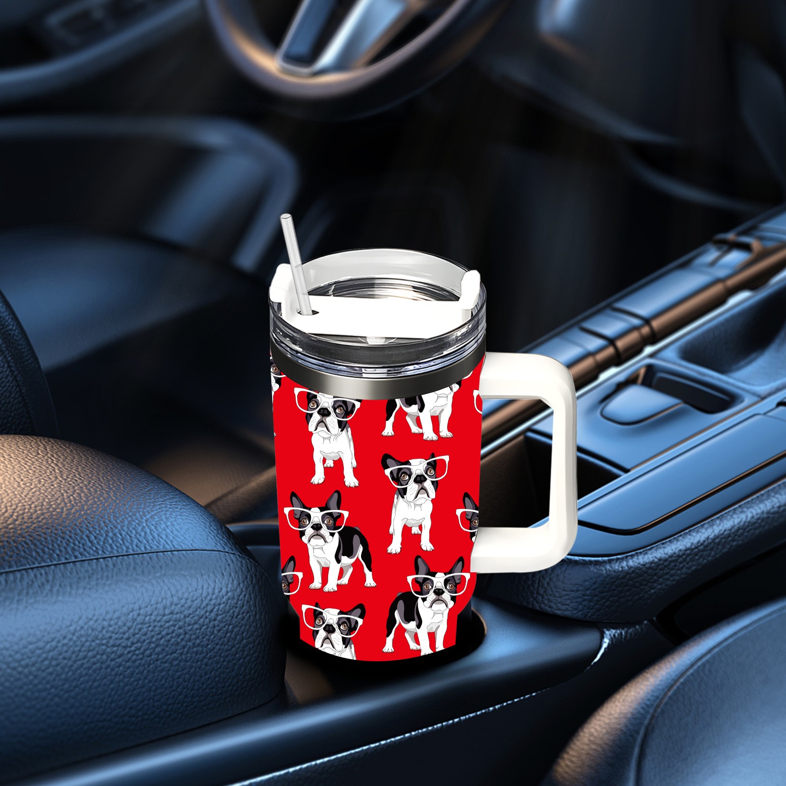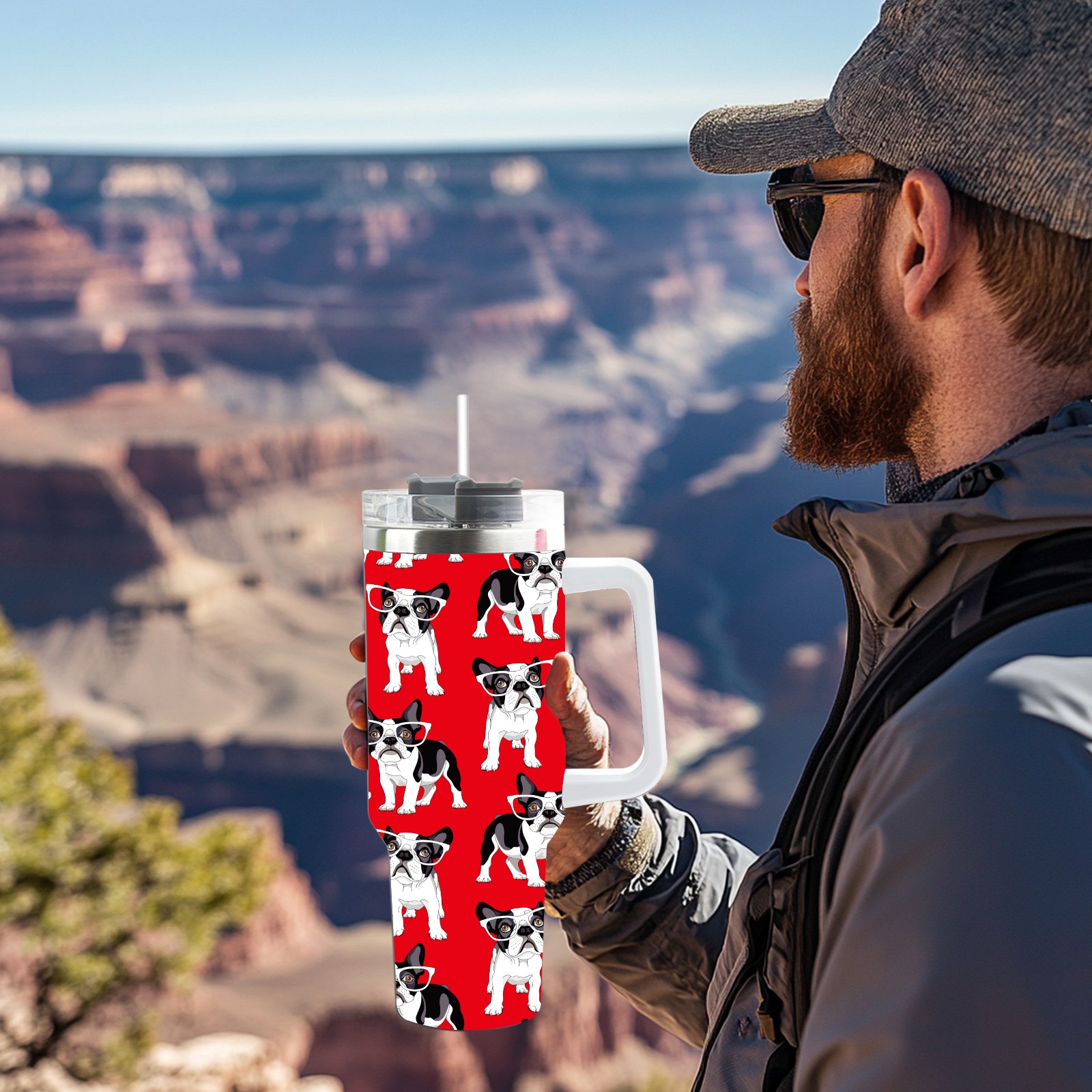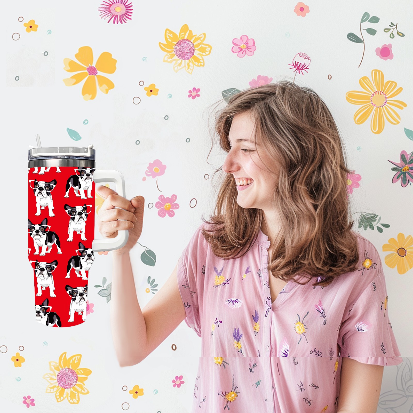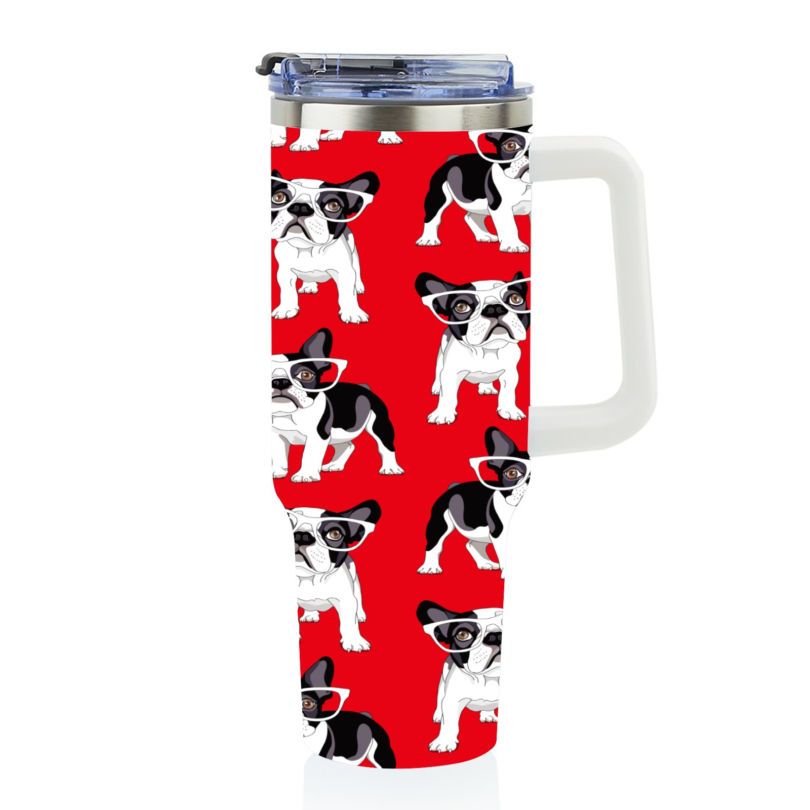 40oz French Pug Wearing Glasses Dog Red thermos with lid and straw, leak-proof stainless steel, with handle, spill-proof bottle, convenient for travel(pink)