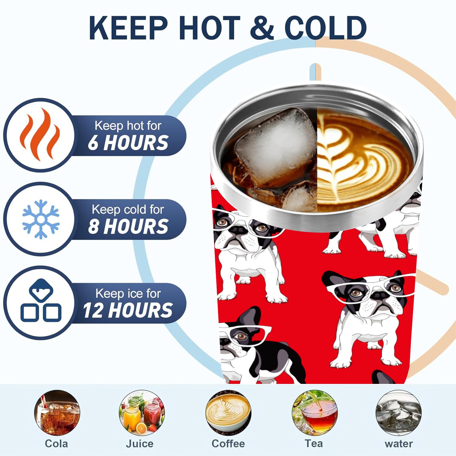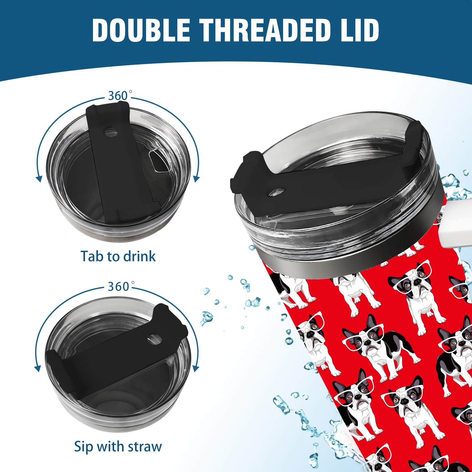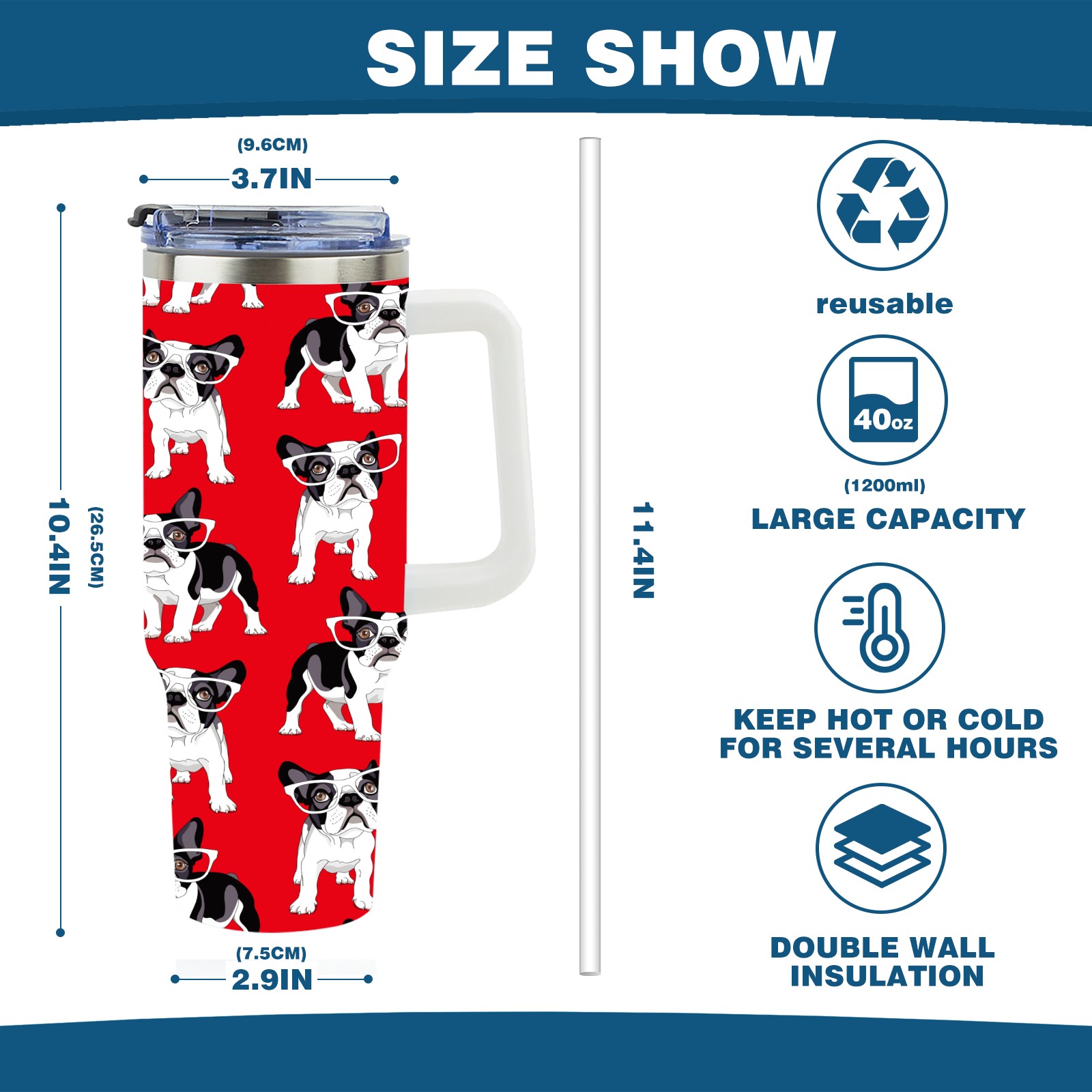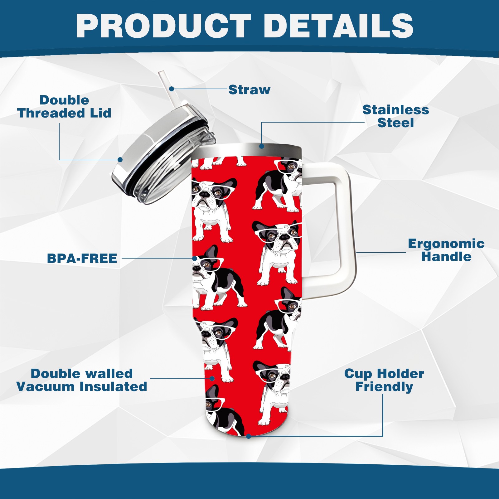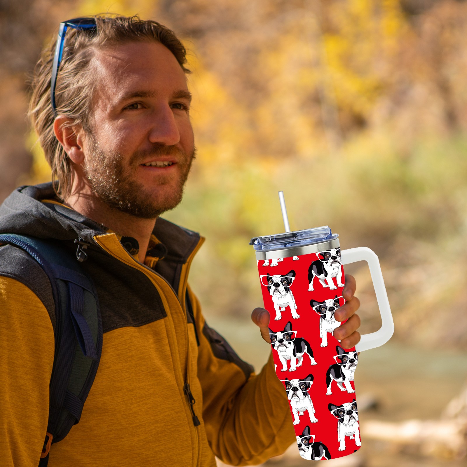 40oz French Pug Wearing Glasses Dog Red thermos with lid and straw, leak-proof stainless steel, with handle, spill-proof bottle, convenient for travel(pink)