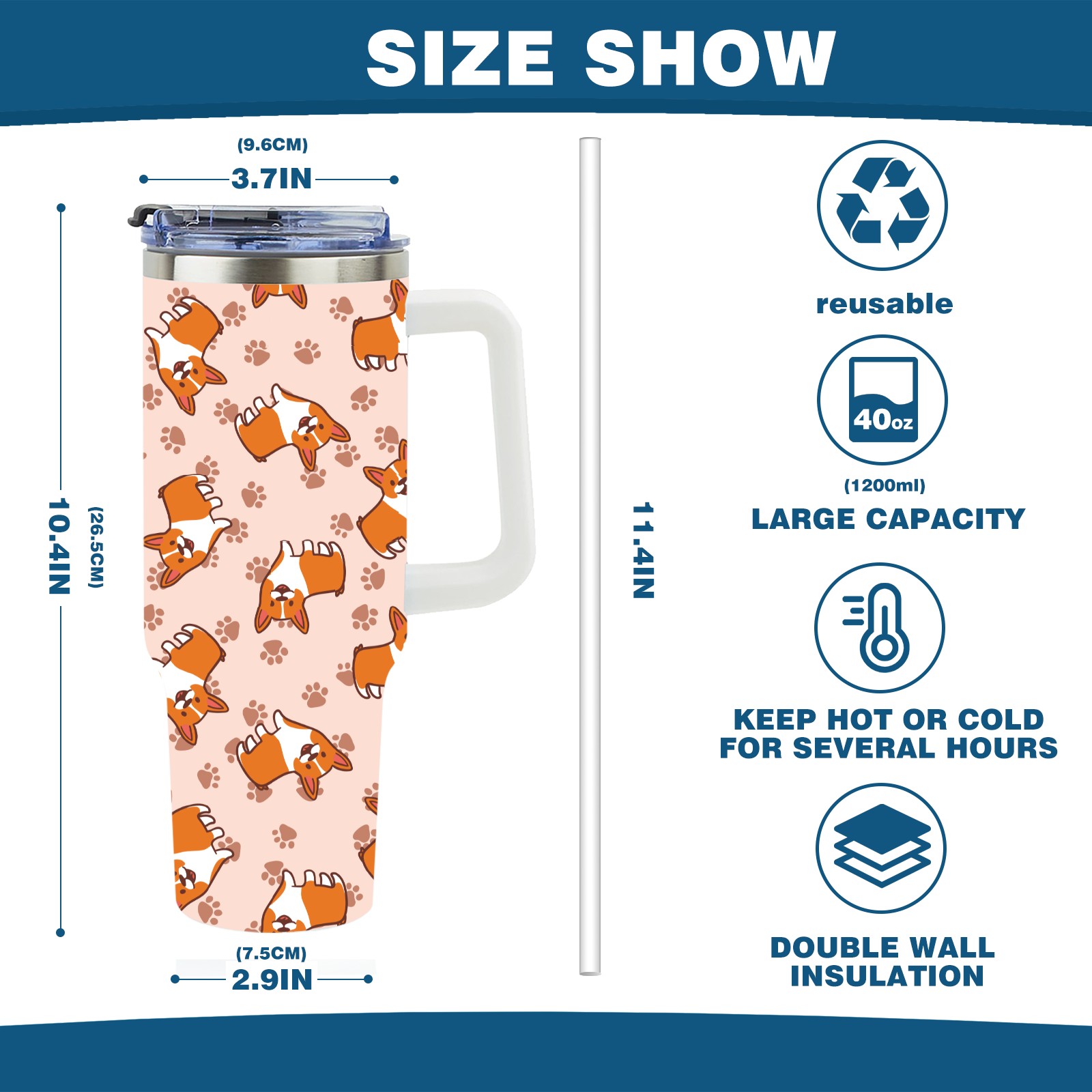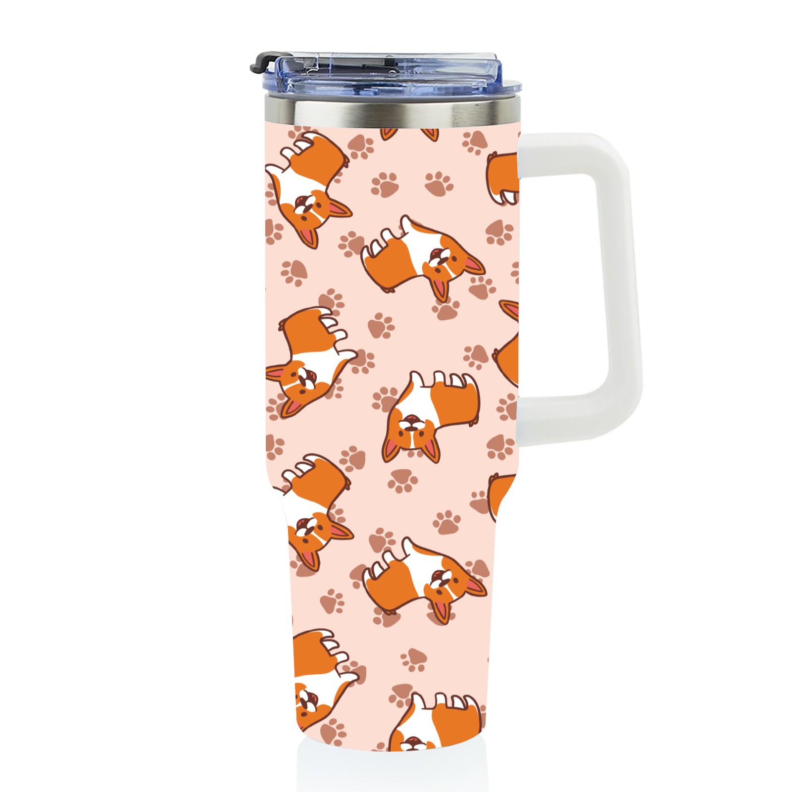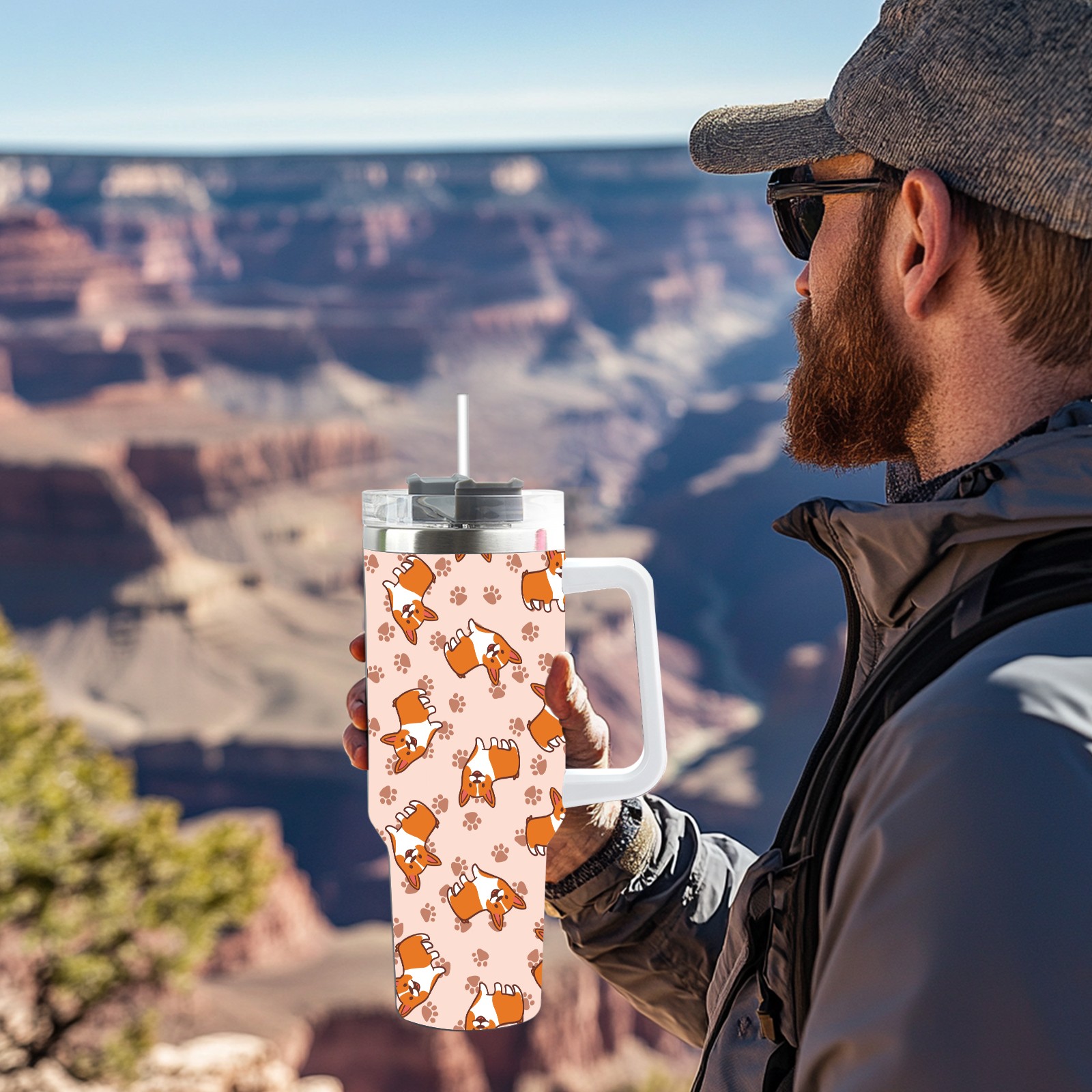 40oz Brown Corgi French Dog Animal thermos with lid and straw, leak-proof stainless steel, with handle, spill-proof bottle, convenient for travel(pink)