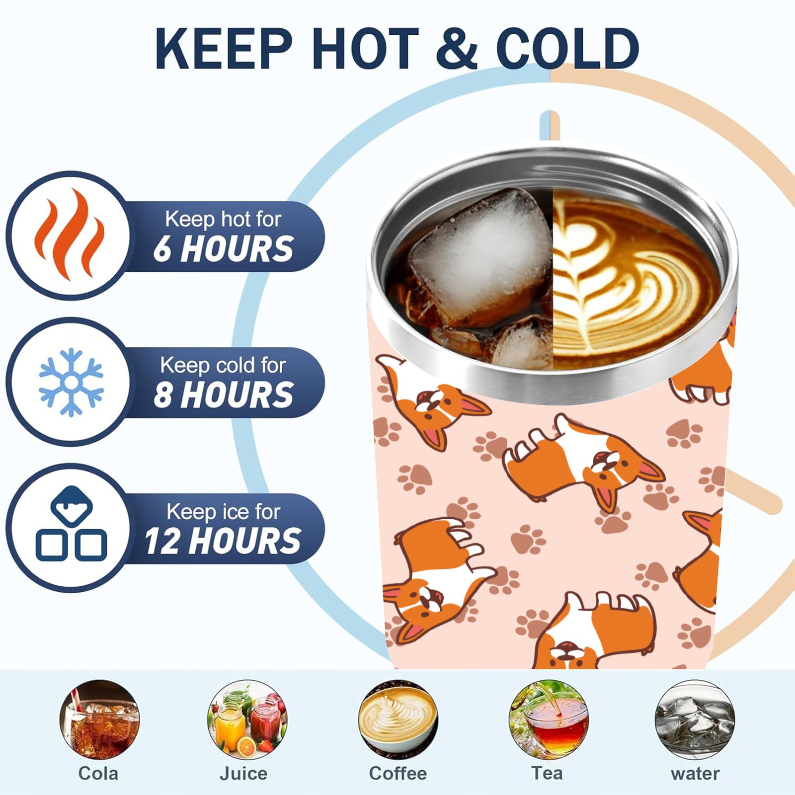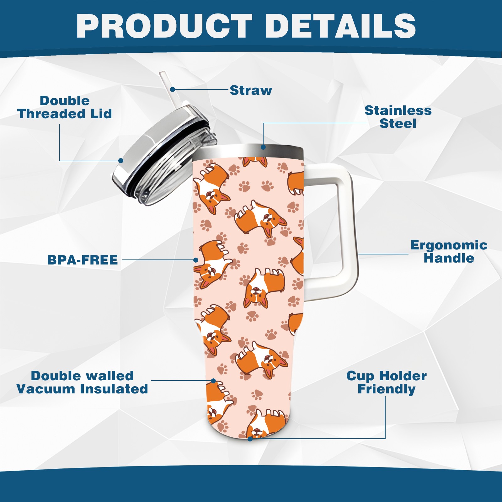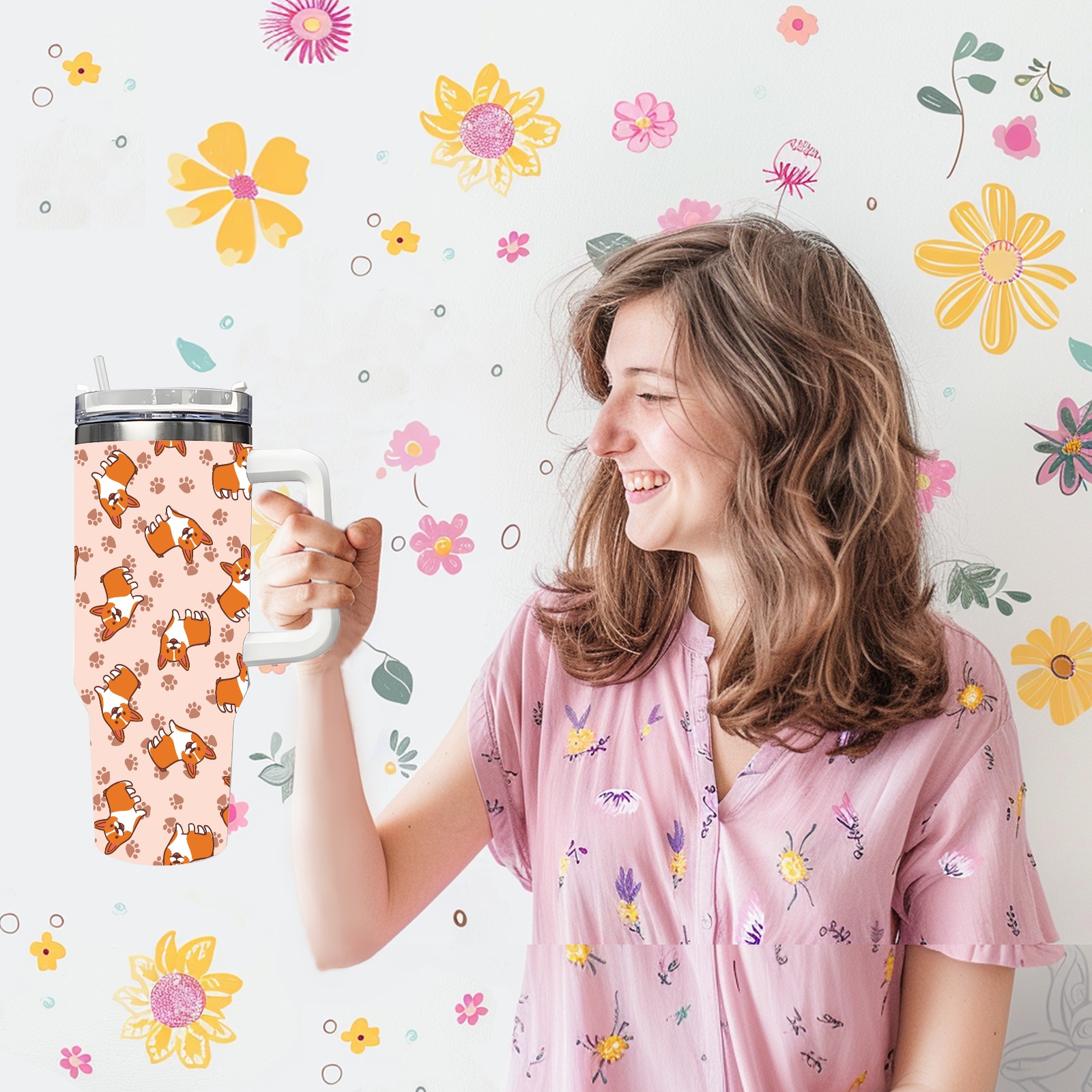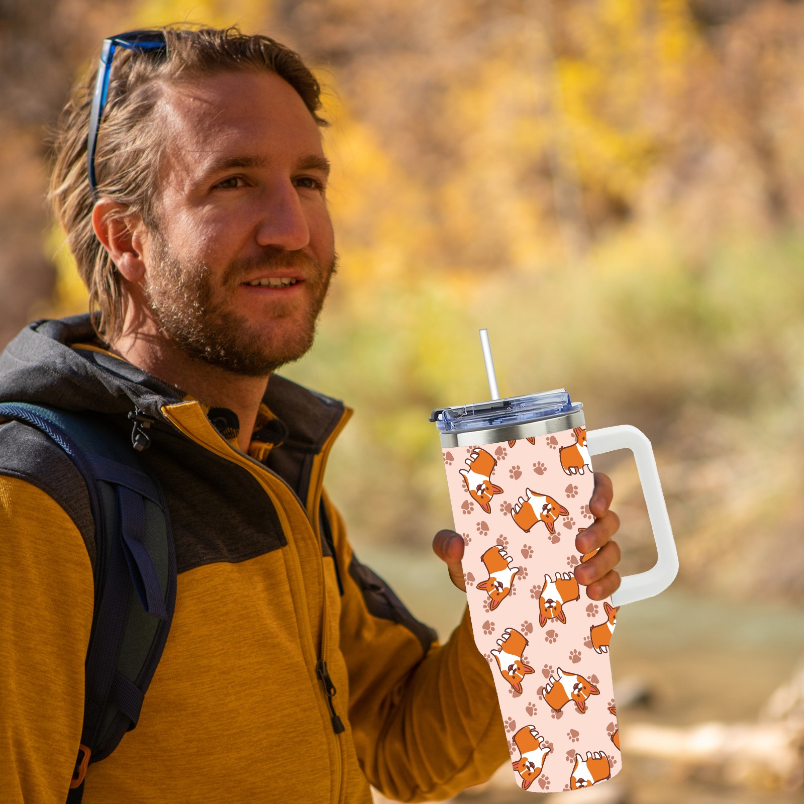 40oz Brown Corgi French Dog Animal thermos with lid and straw, leak-proof stainless steel, with handle, spill-proof bottle, convenient for travel(pink)