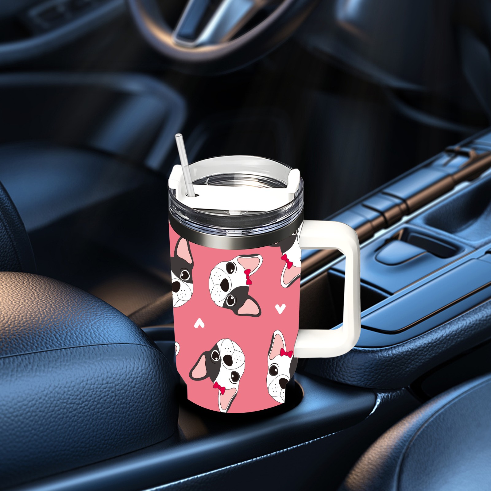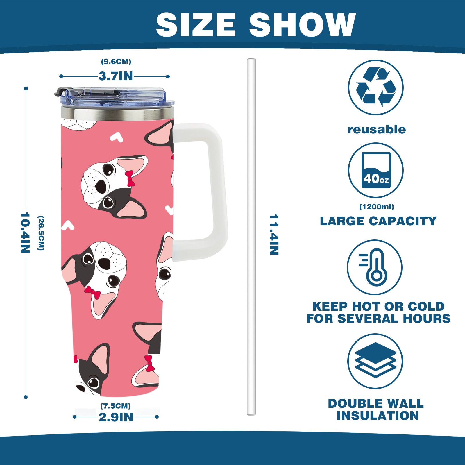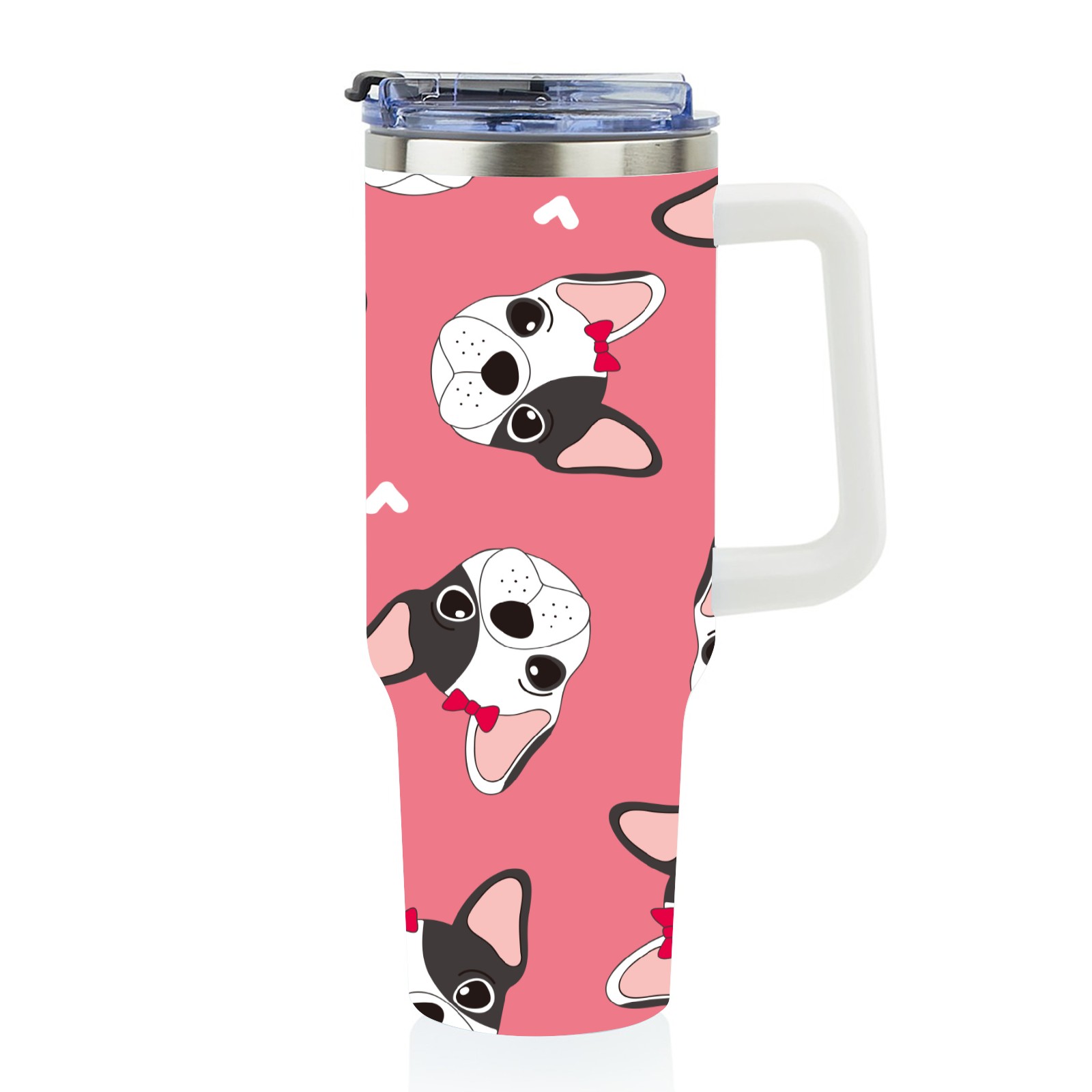 40oz French Pug Dog Princess thermos with lid and straw, leak-proof stainless steel, with handle, spill-proof bottle, convenient for travel(pink)