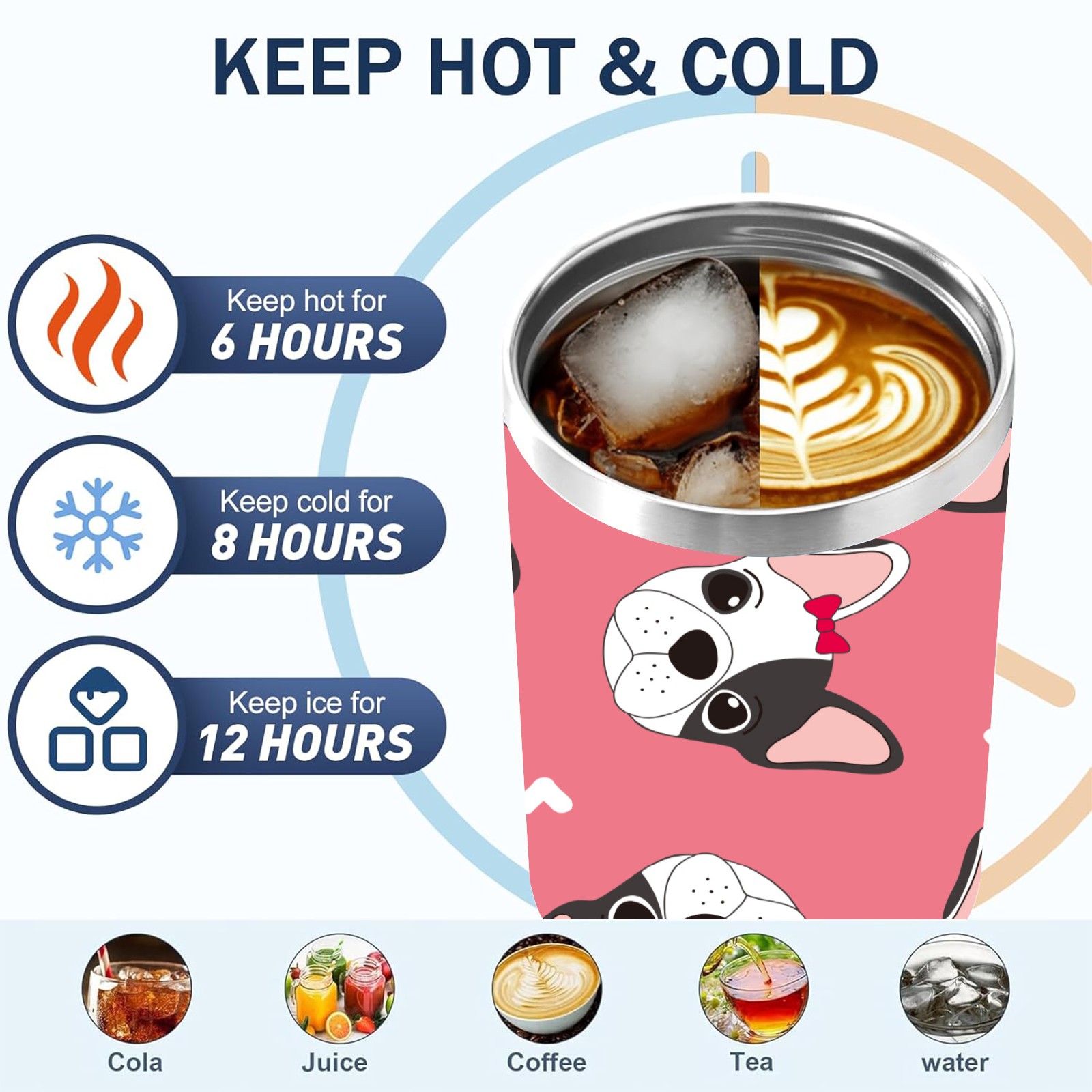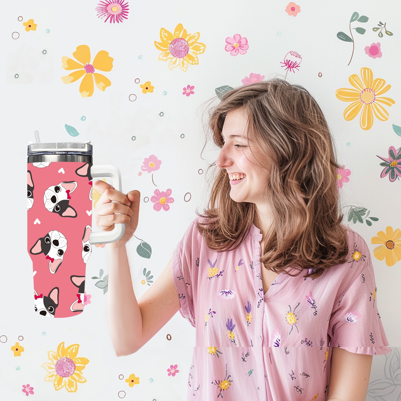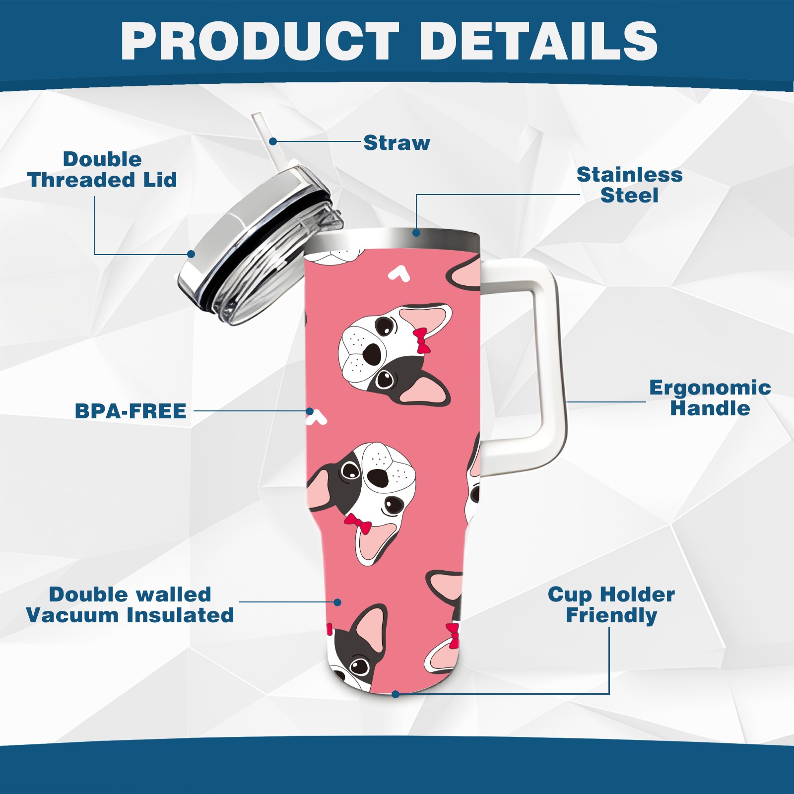 40oz French Pug Dog Princess thermos with lid and straw, leak-proof stainless steel, with handle, spill-proof bottle, convenient for travel(pink)