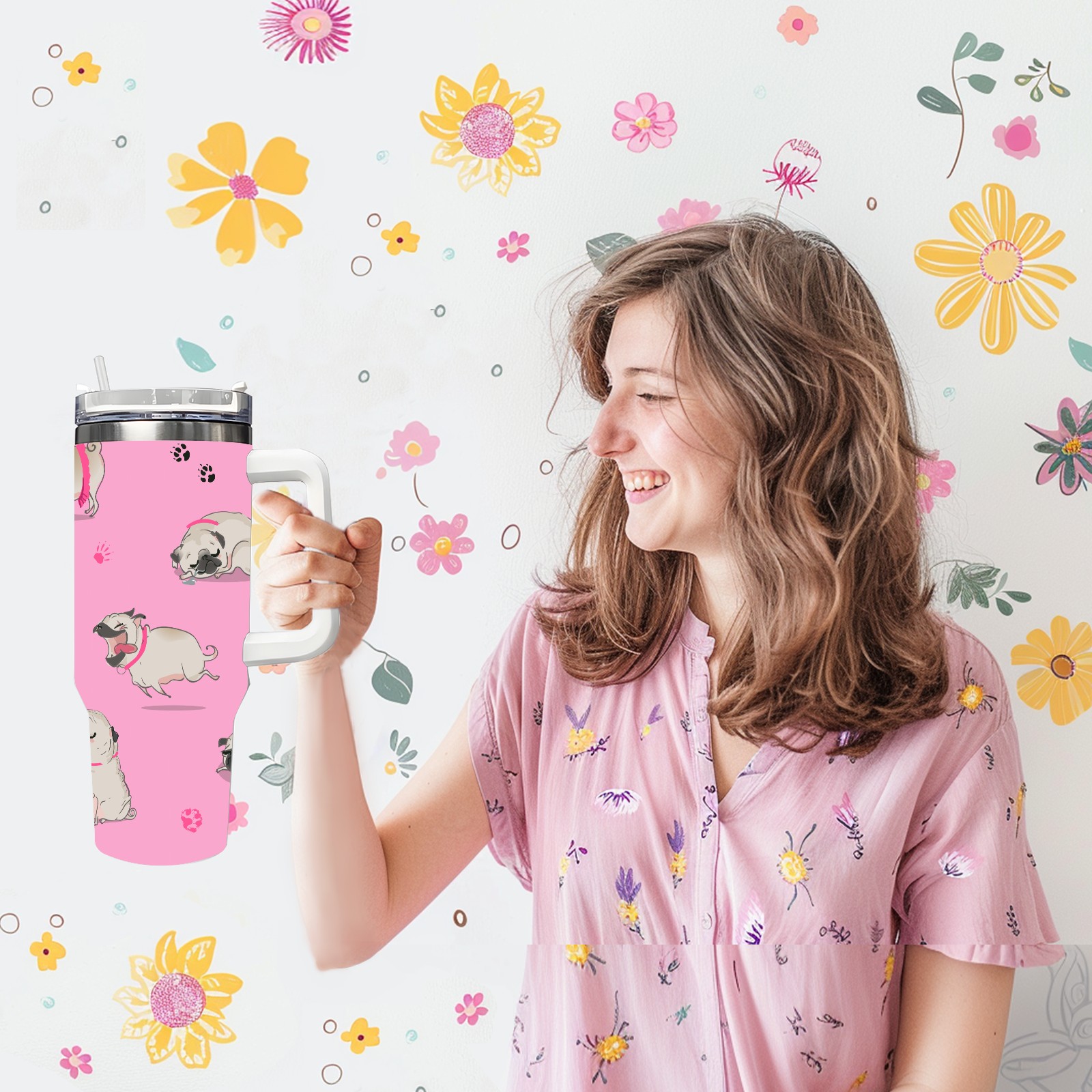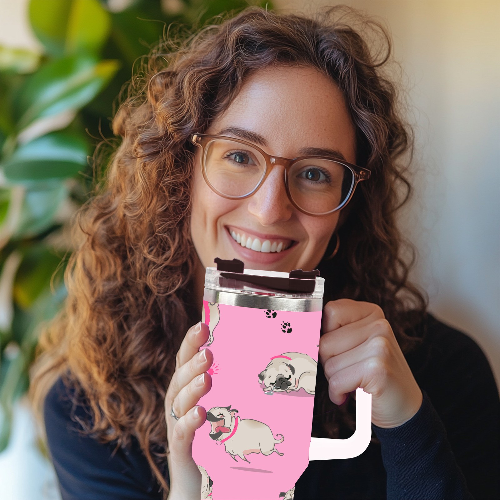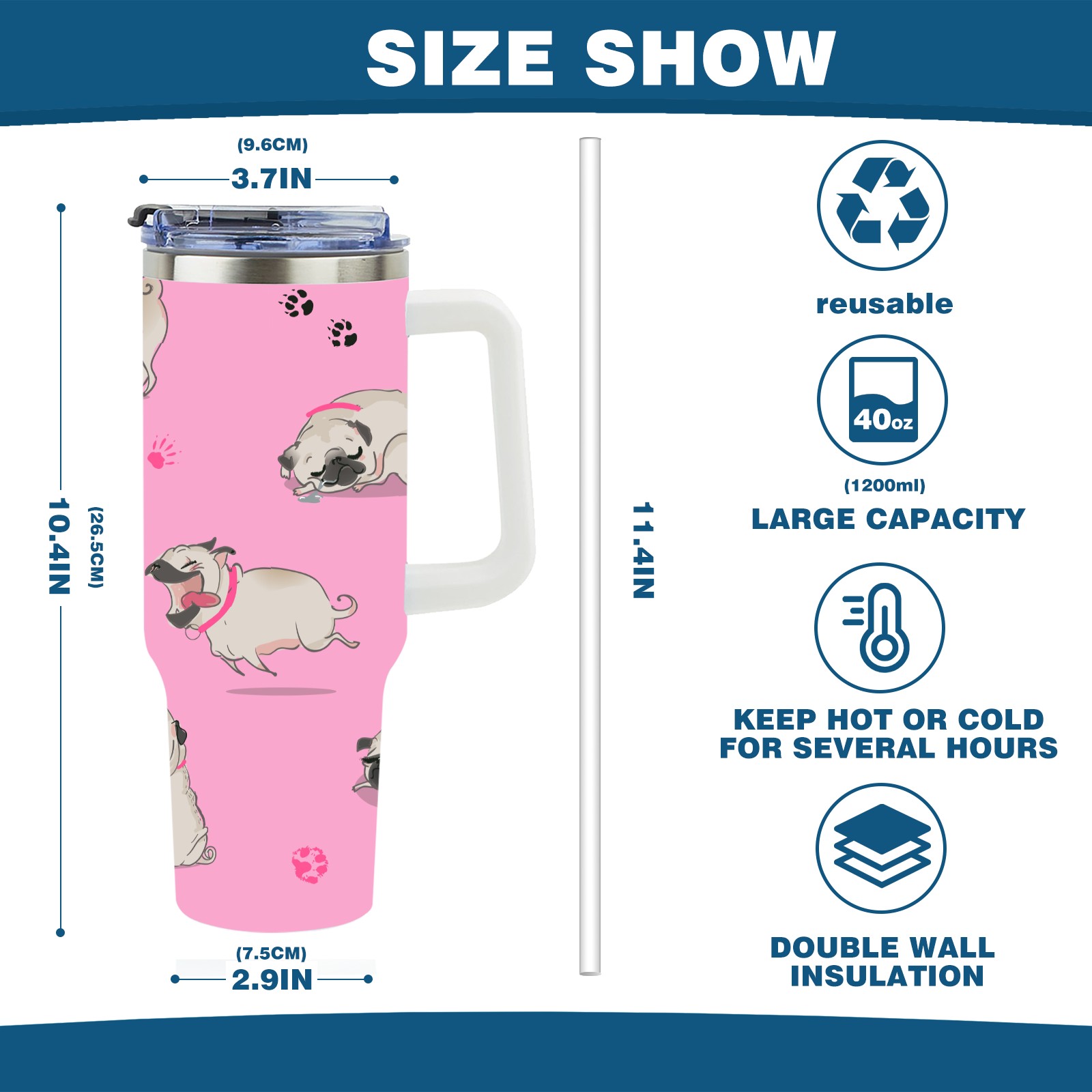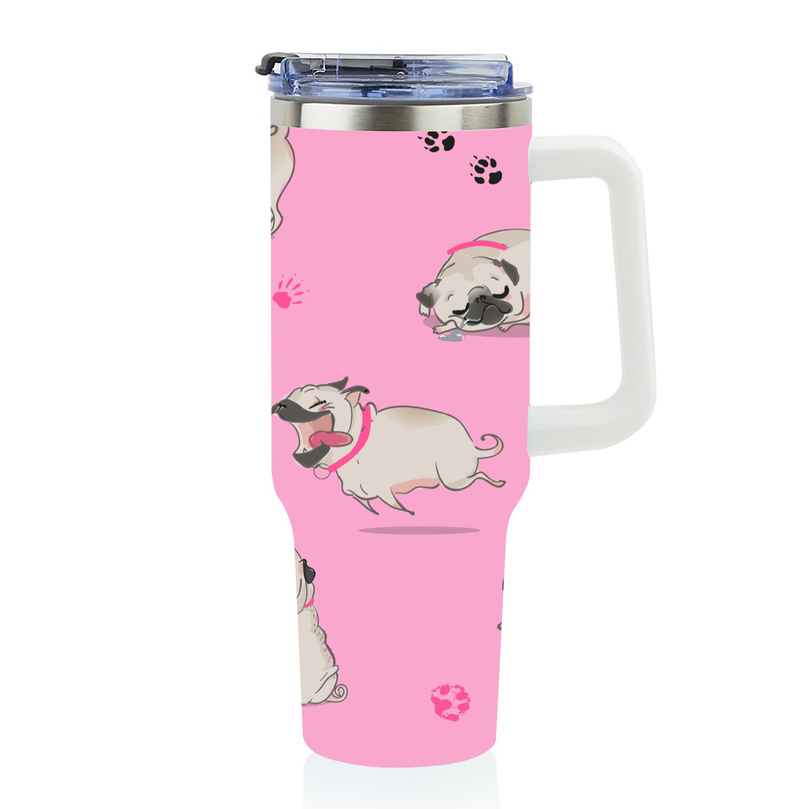 40oz French Pug Bear Paw Dog Footprints thermos with lid and straw, leak-proof stainless steel, with handle, spill-proof bottle, convenient for travel(pink)