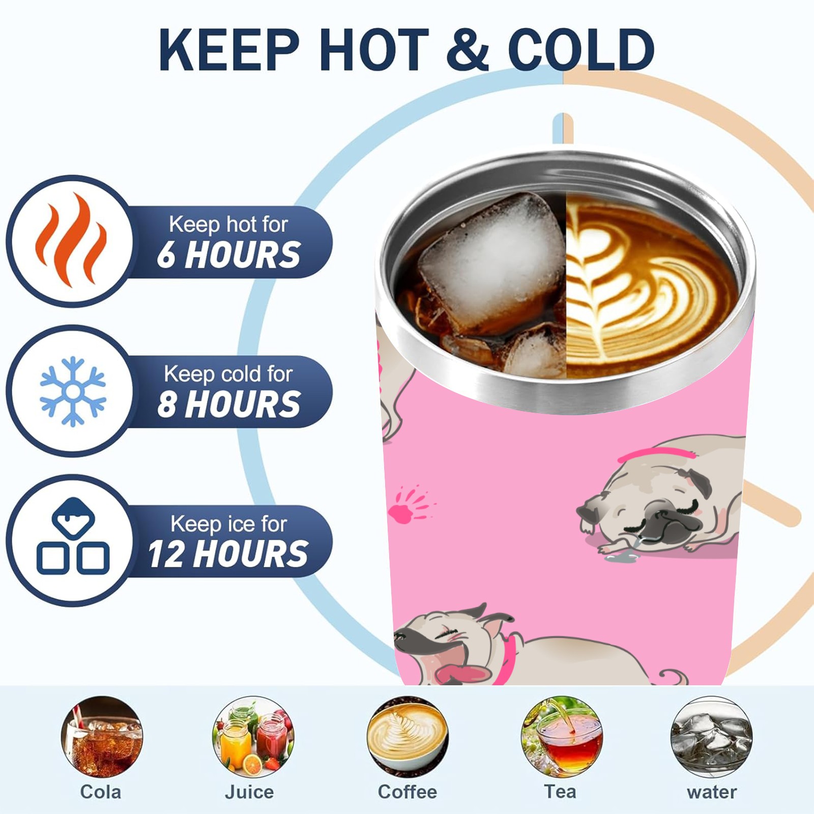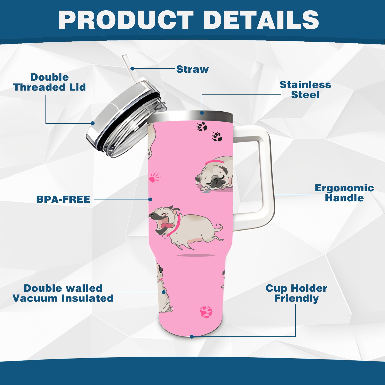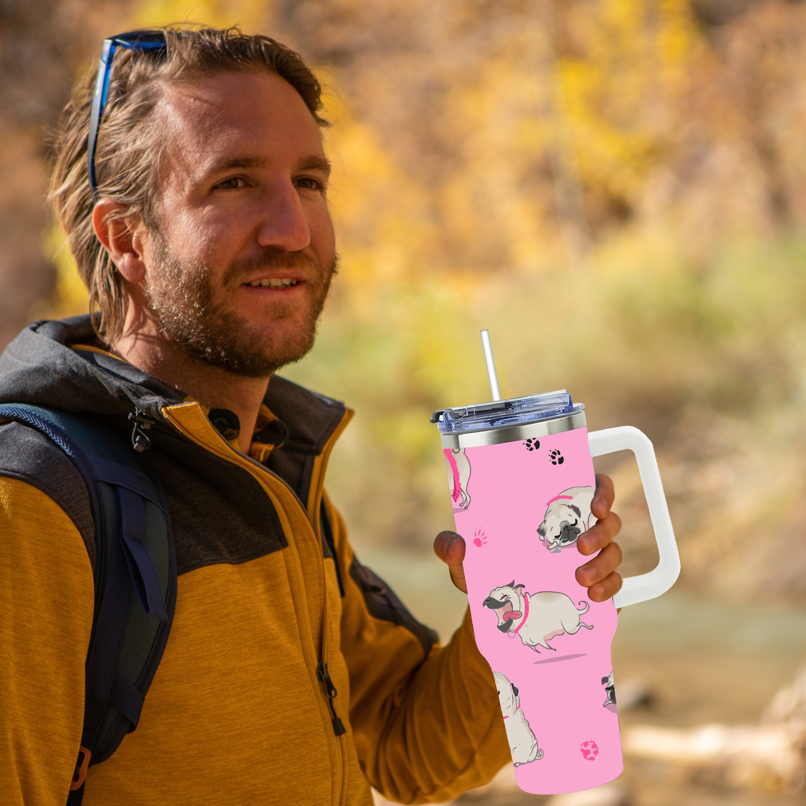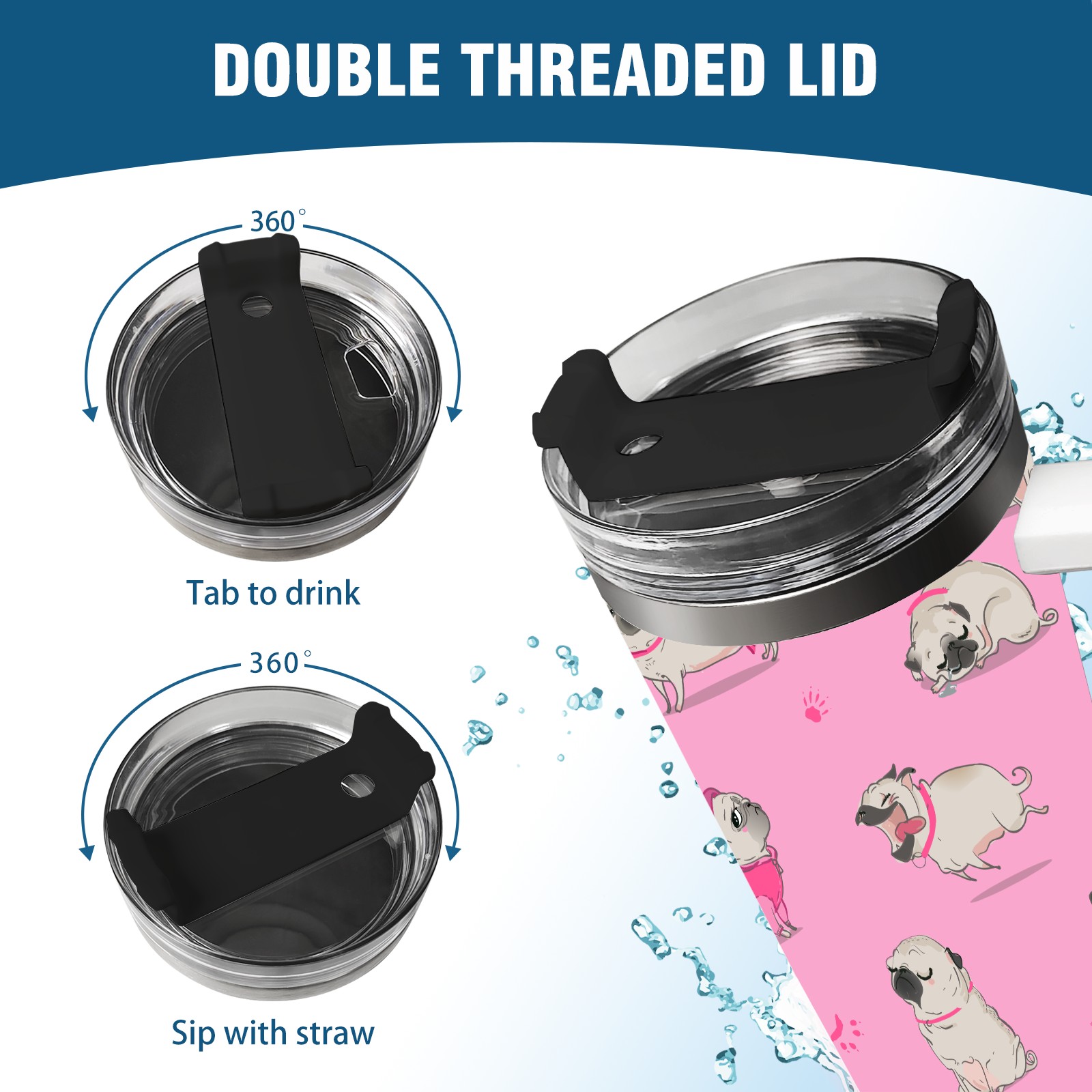 40oz French Pug Bear Paw Dog Footprints thermos with lid and straw, leak-proof stainless steel, with handle, spill-proof bottle, convenient for travel(pink)