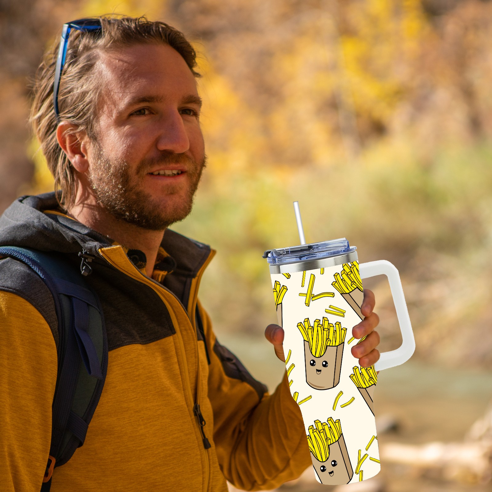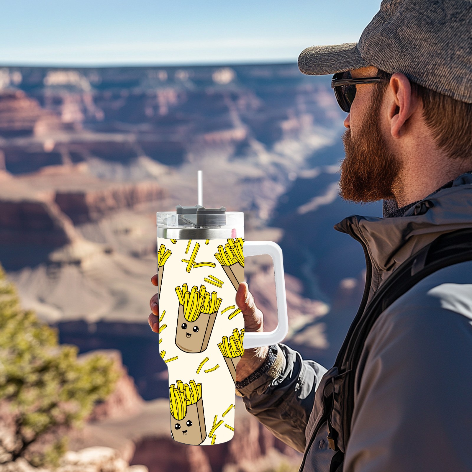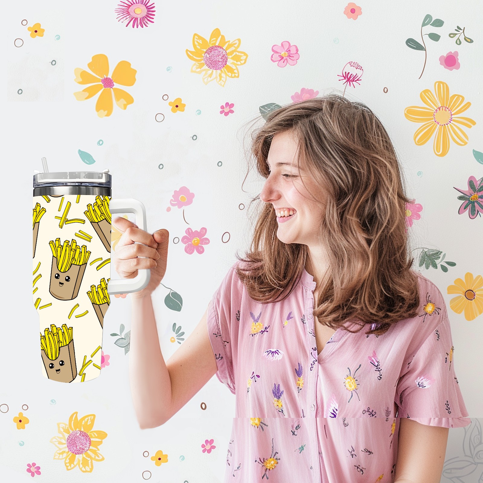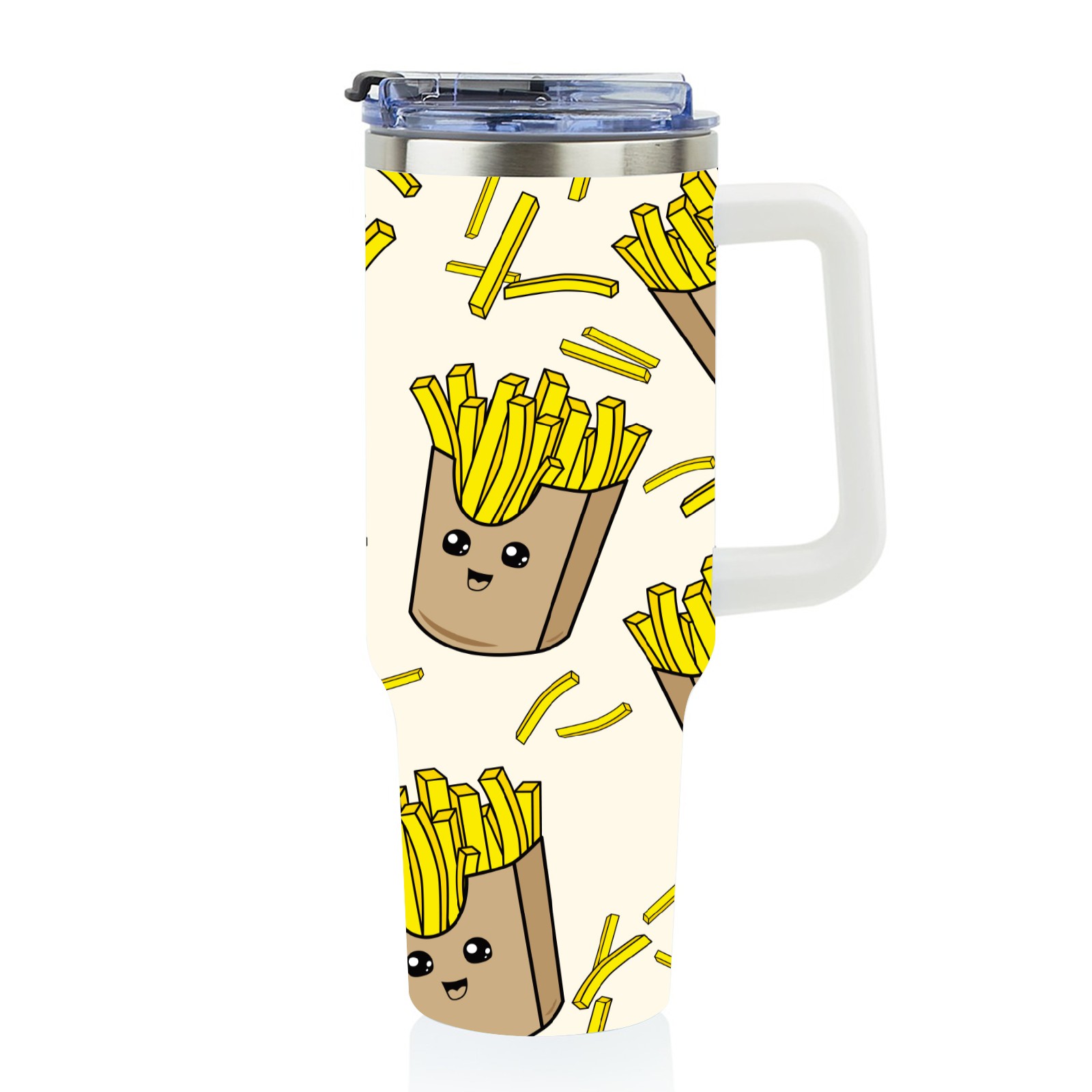 40oz Cartoon French Fries Yellow thermos with lid and straw, leak-proof stainless steel, with handle, spill-proof bottle, convenient for travel(pink)