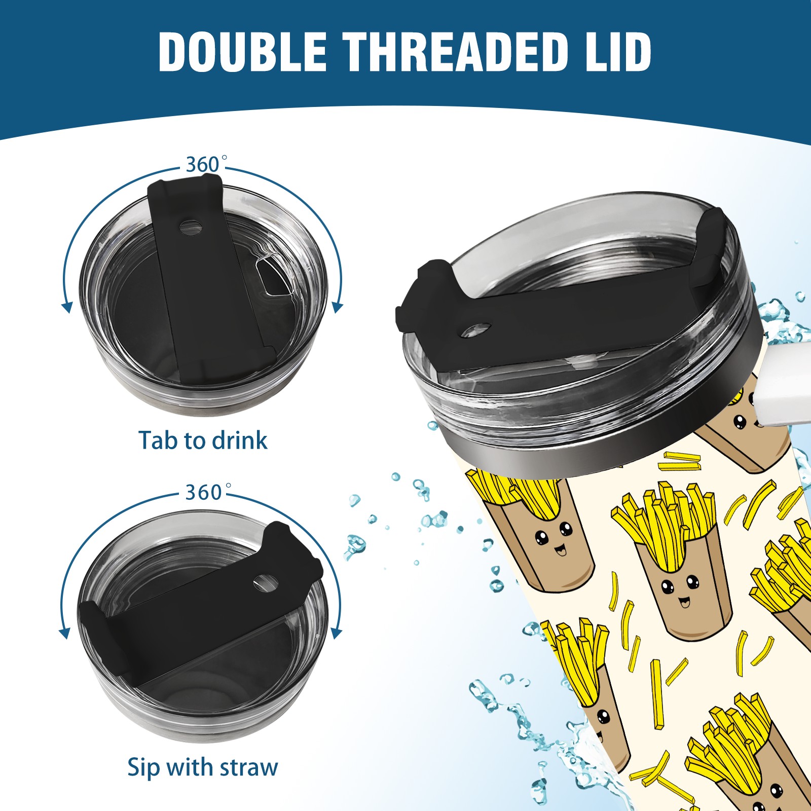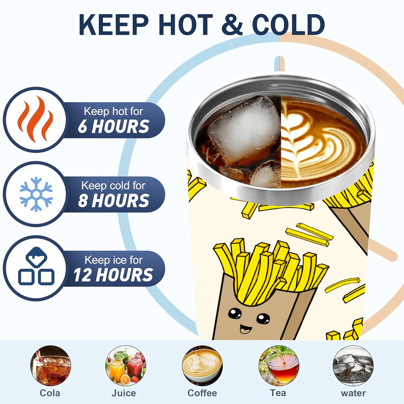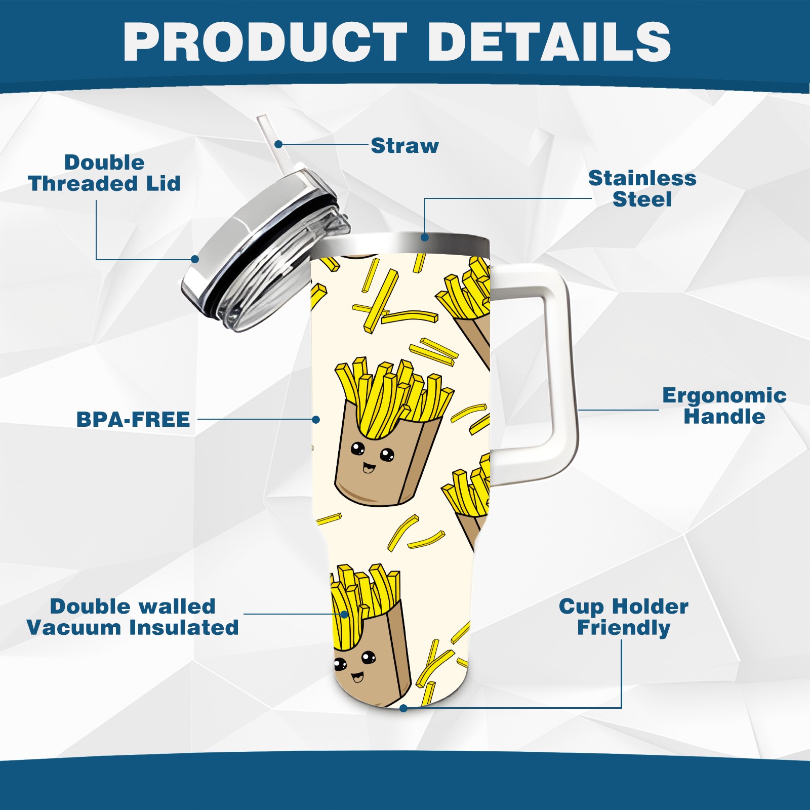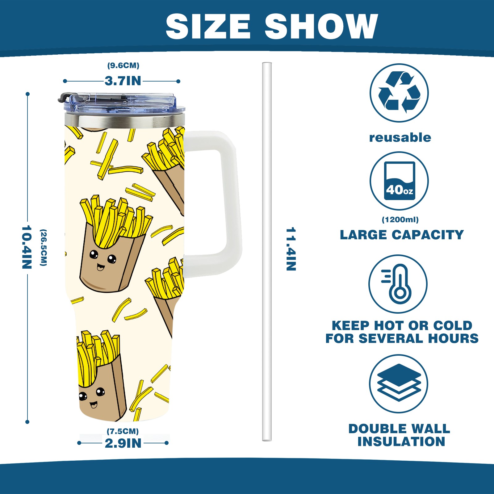 40oz Cartoon French Fries Yellow thermos with lid and straw, leak-proof stainless steel, with handle, spill-proof bottle, convenient for travel(pink)