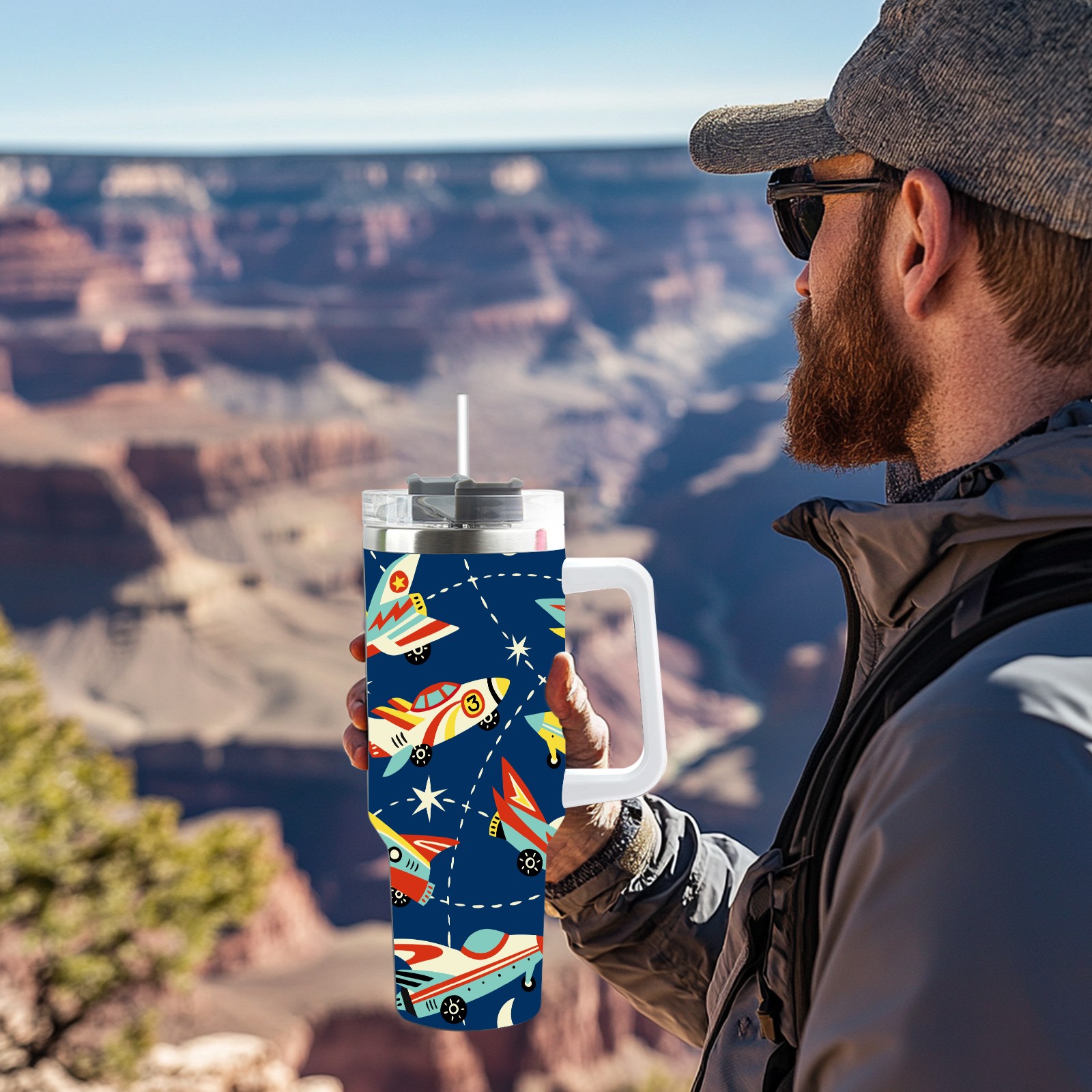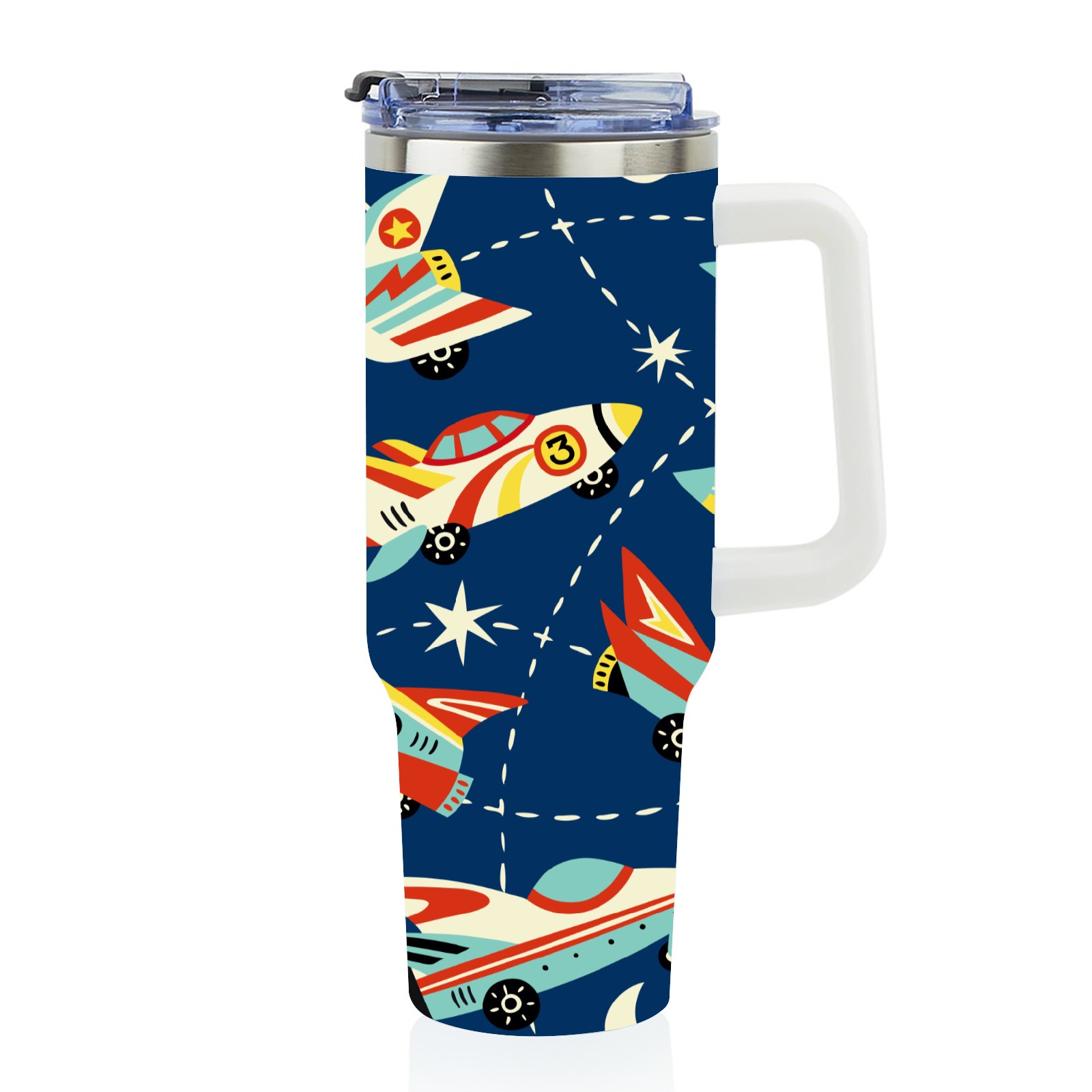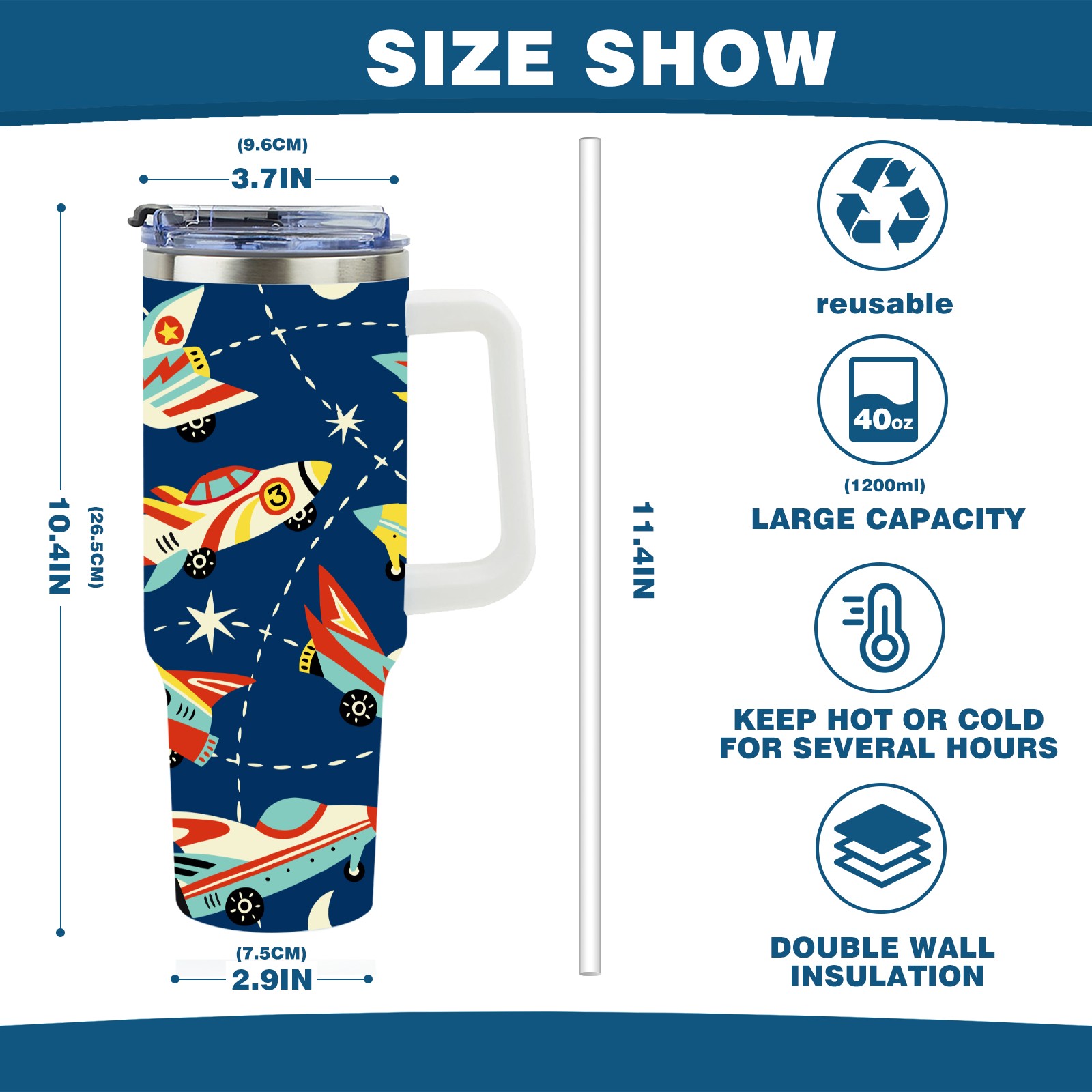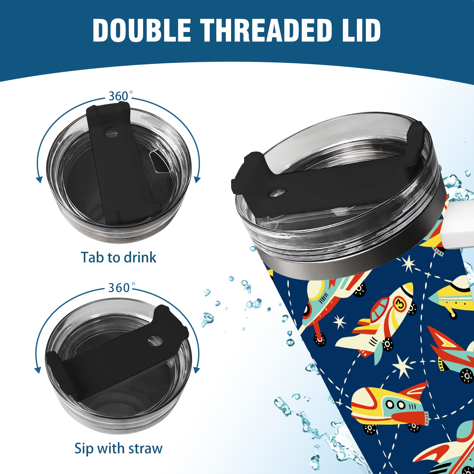 40oz Cartoon Airplane Helicopter Trajectory thermos with lid and straw, leak-proof stainless steel, with handle, spill-proof bottle, convenient for travel(pink)