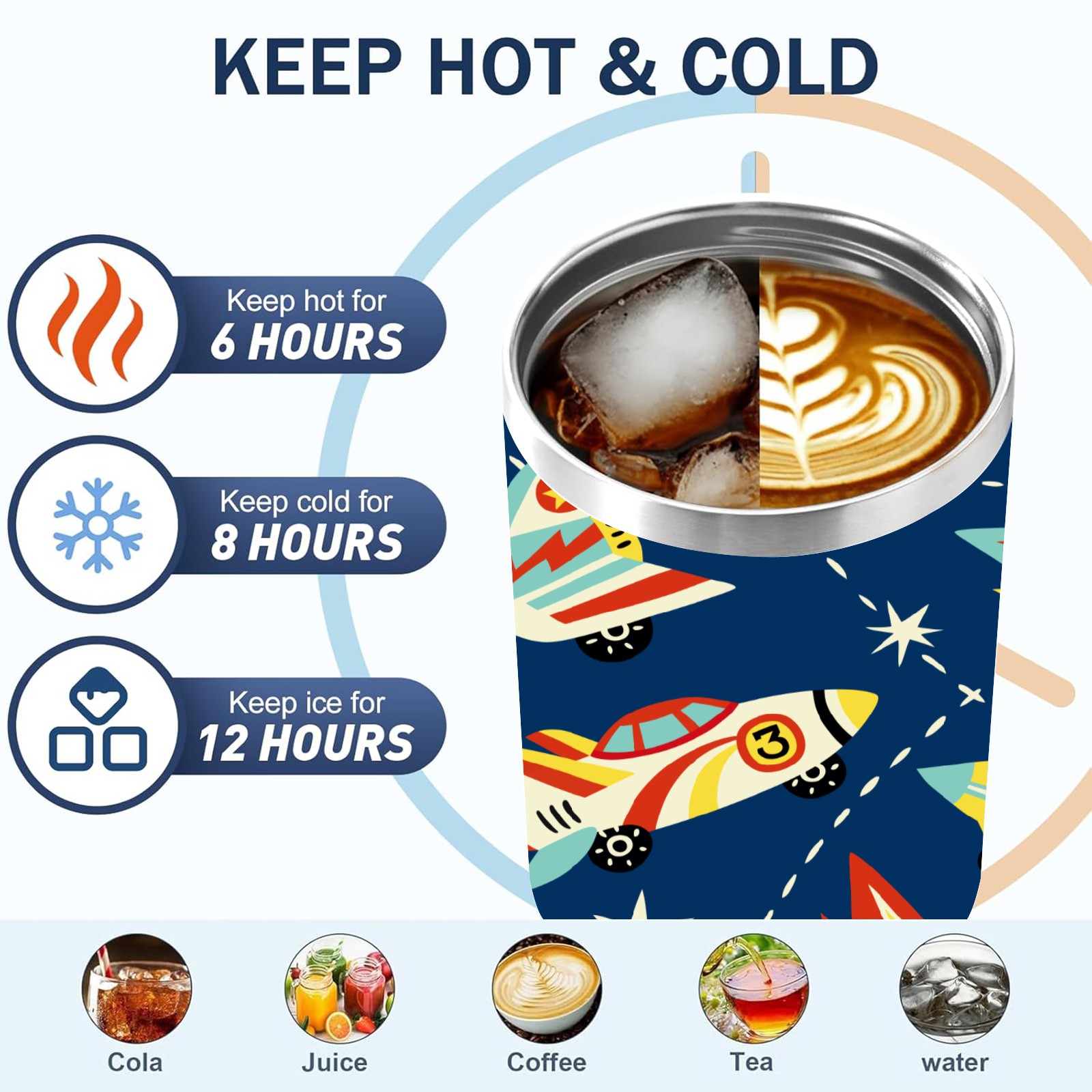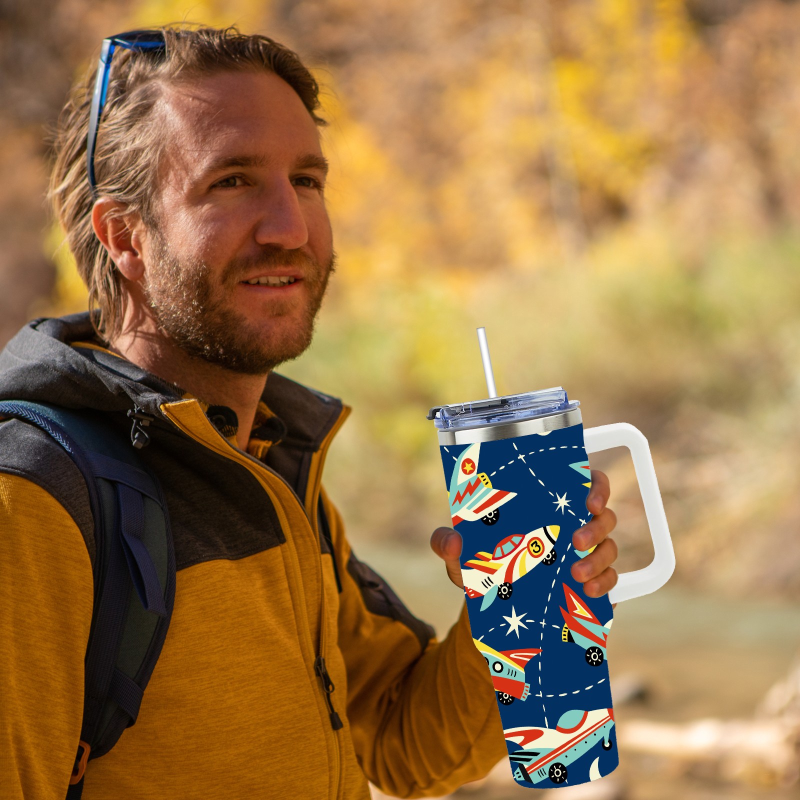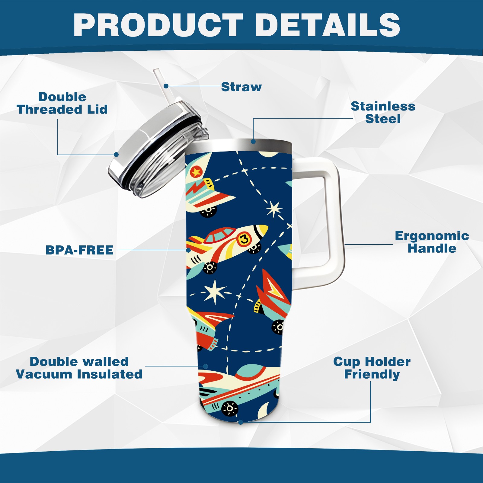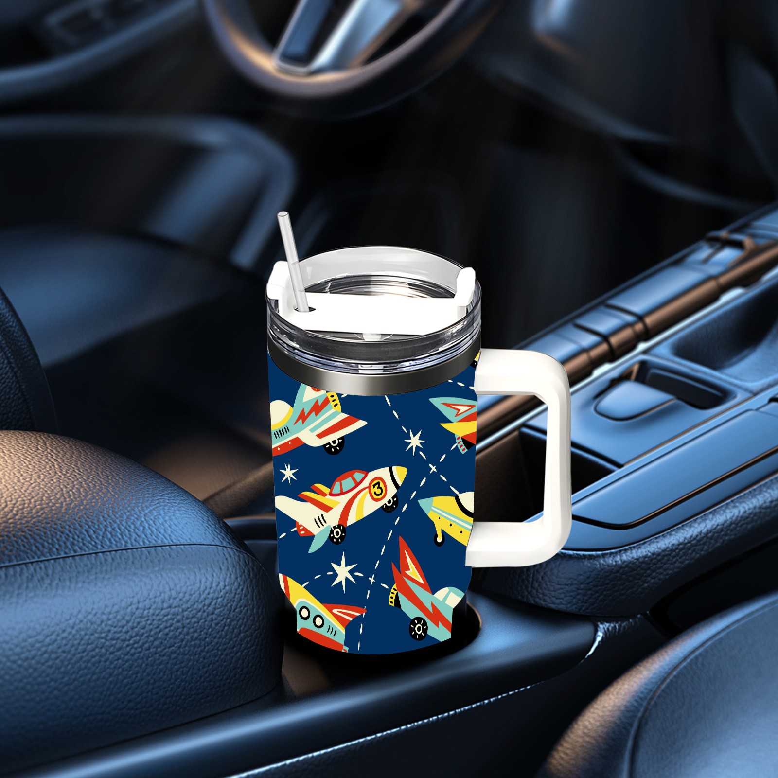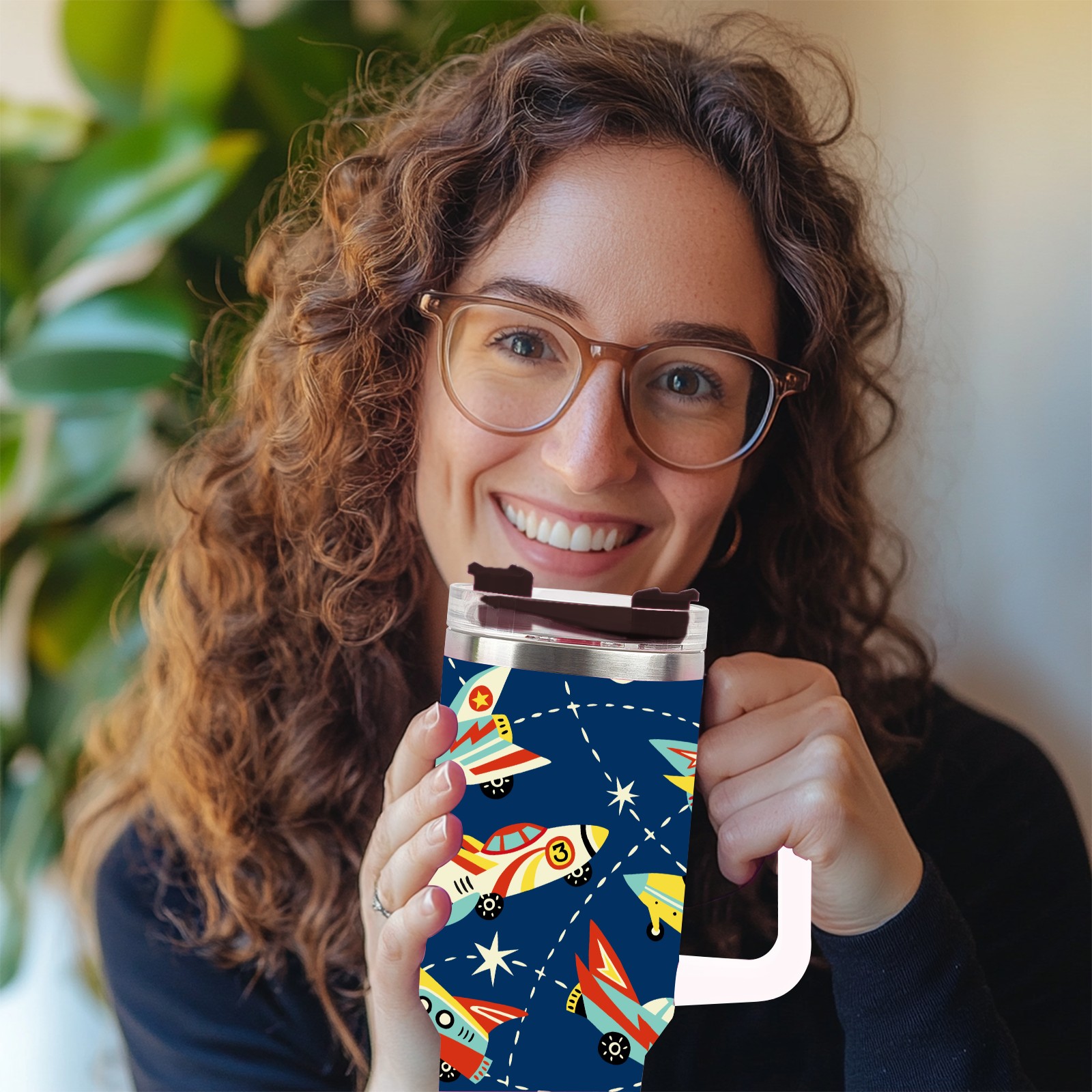 40oz Cartoon Airplane Helicopter Trajectory thermos with lid and straw, leak-proof stainless steel, with handle, spill-proof bottle, convenient for travel(pink)