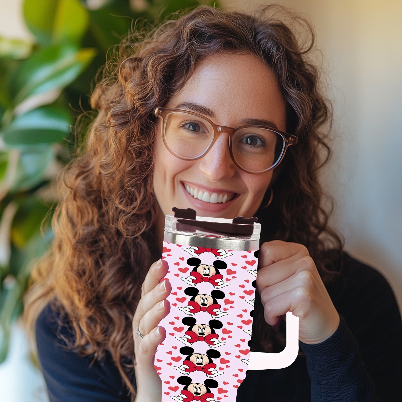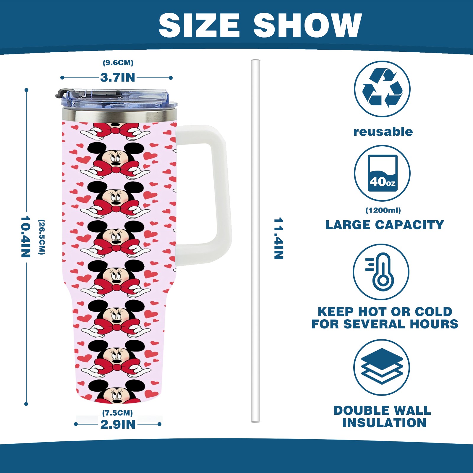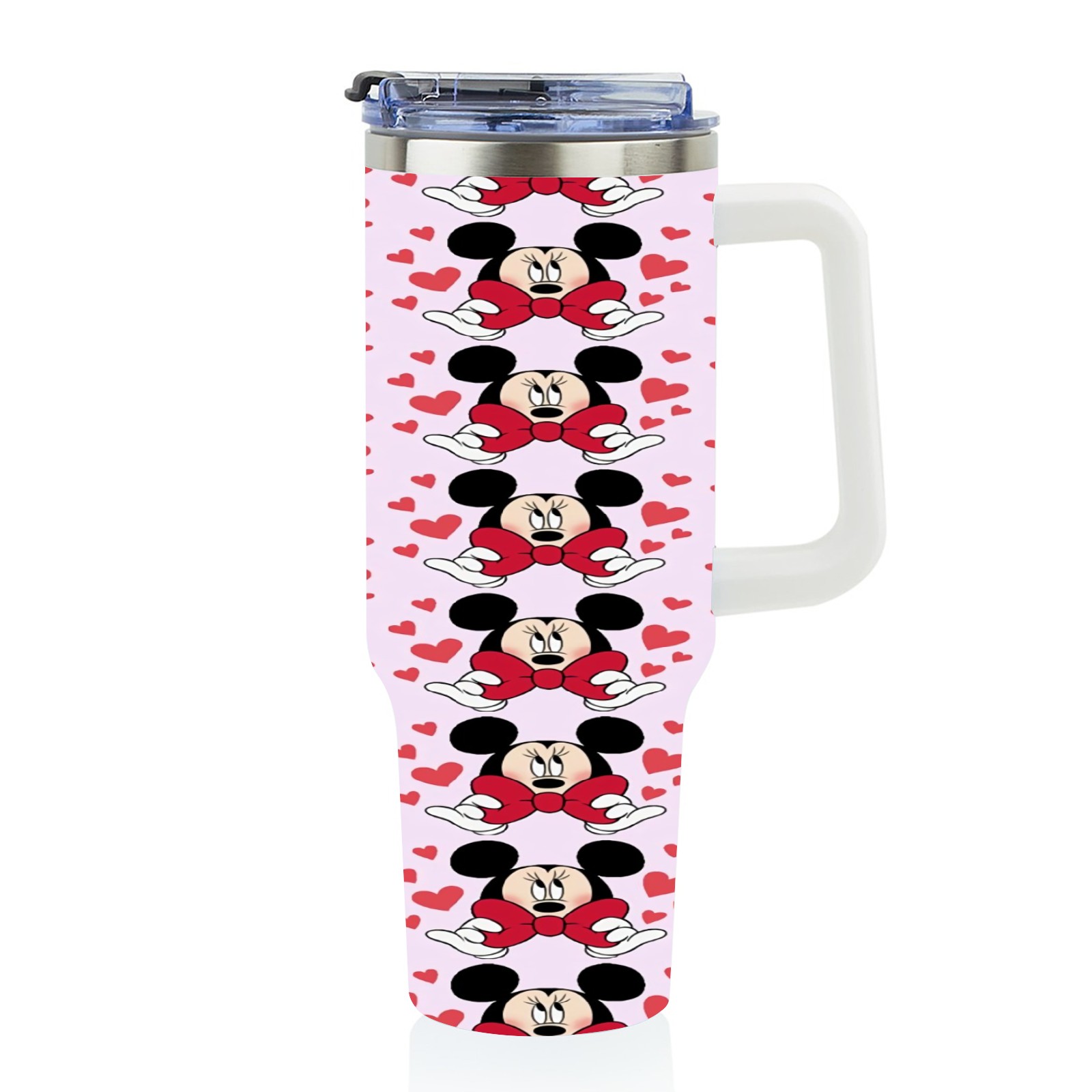 40oz Mickey Mouse And Bow thermos with lid and straw, leak-proof stainless steel, with handle, spill-proof bottle, convenient for travel(pink)