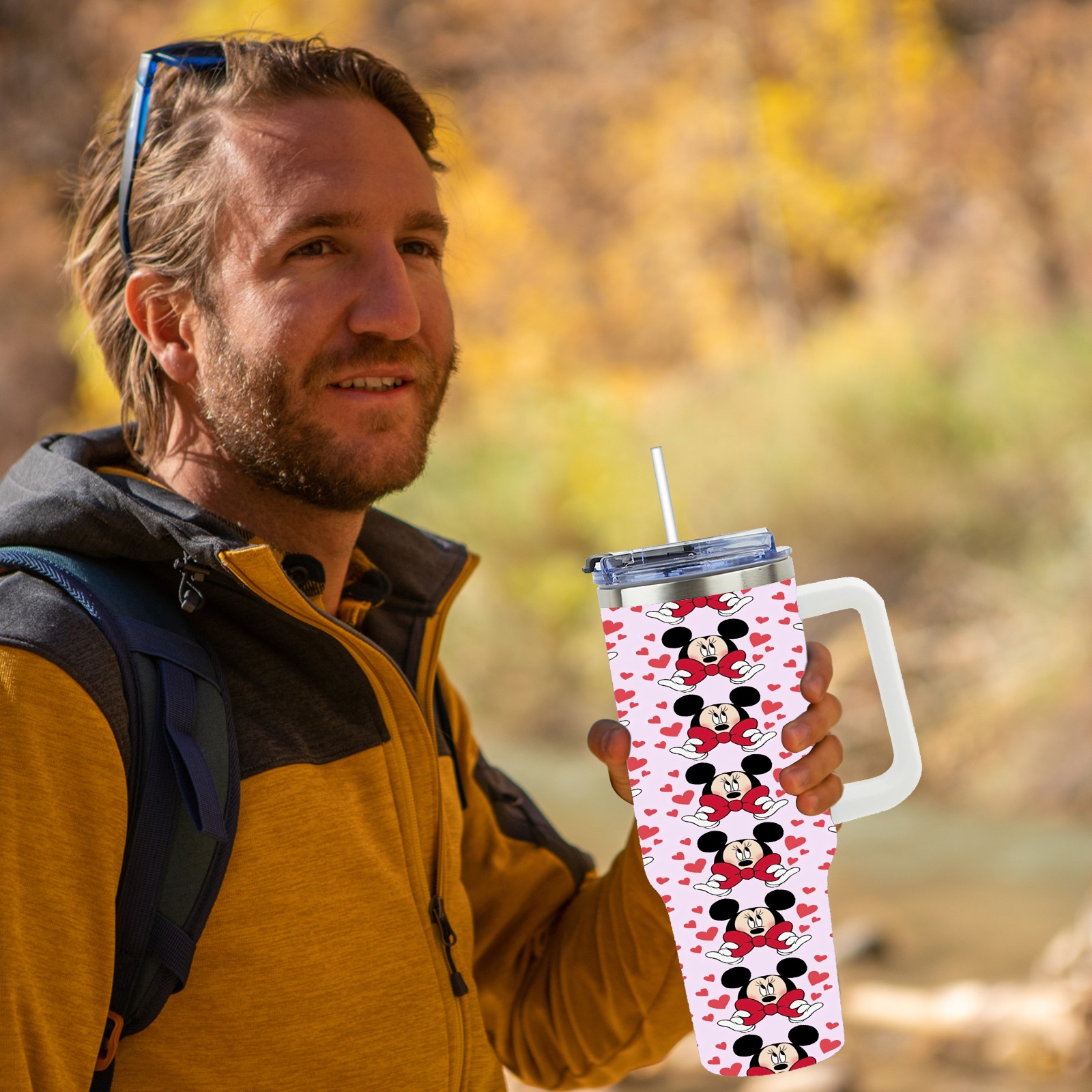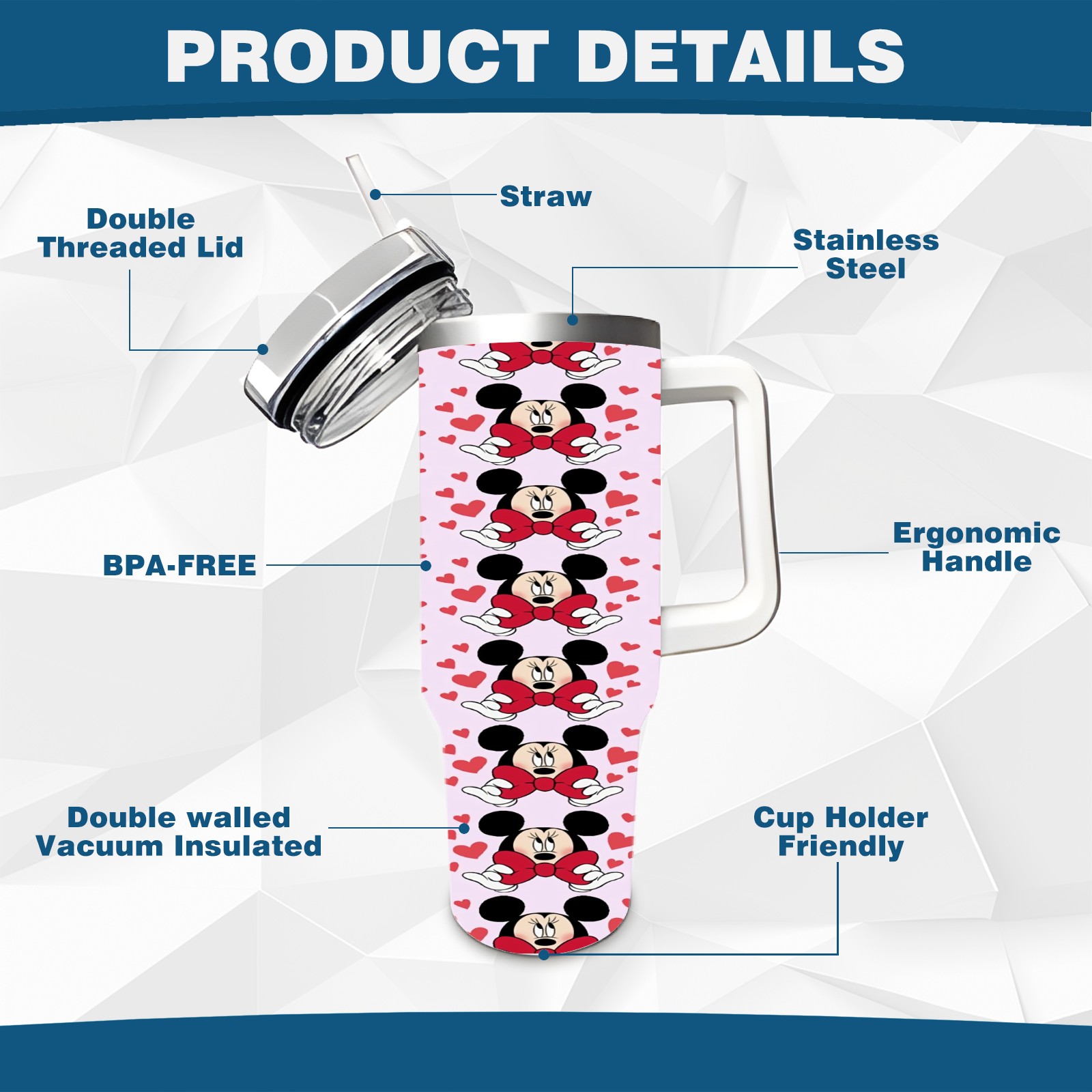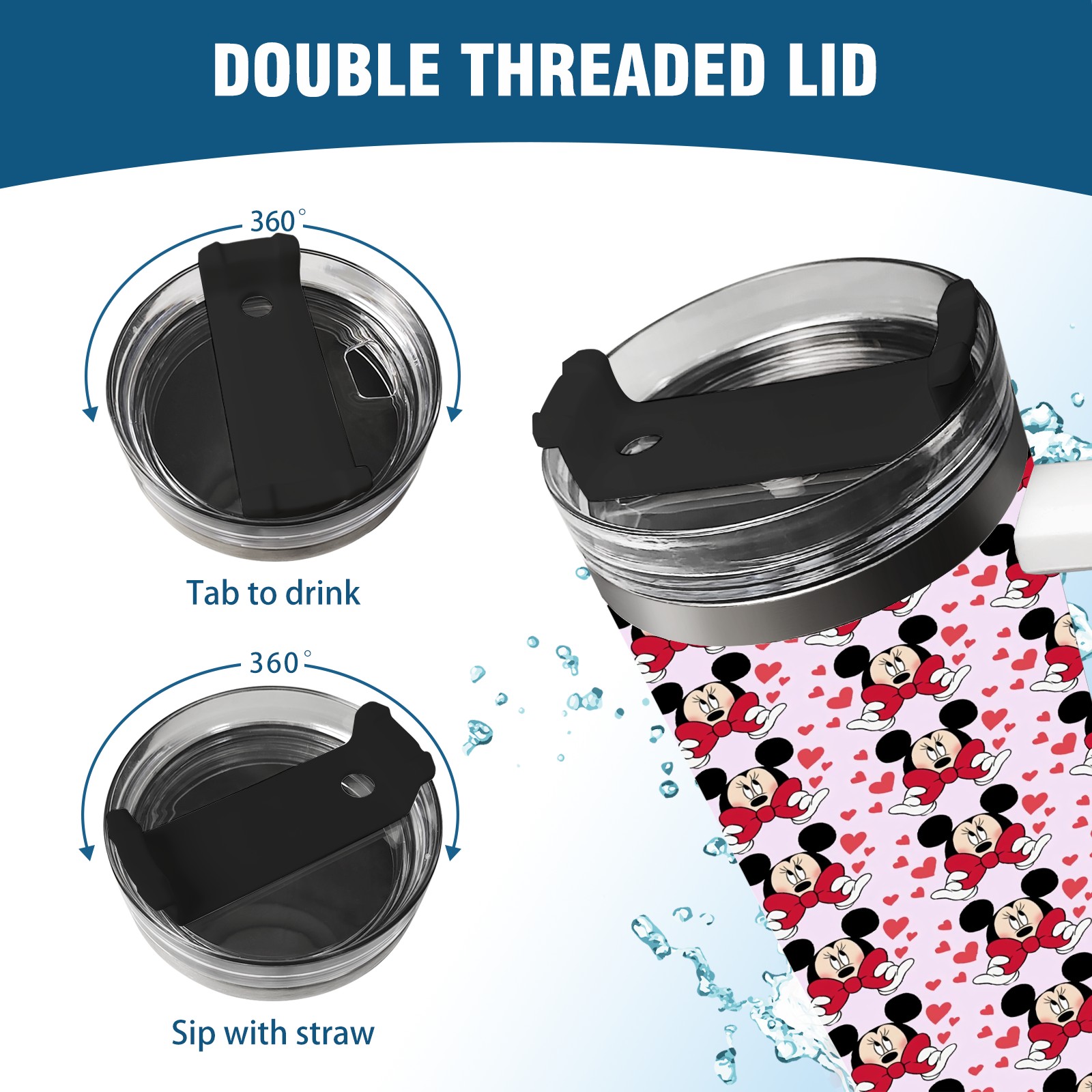 40oz Mickey Mouse And Bow thermos with lid and straw, leak-proof stainless steel, with handle, spill-proof bottle, convenient for travel(pink)