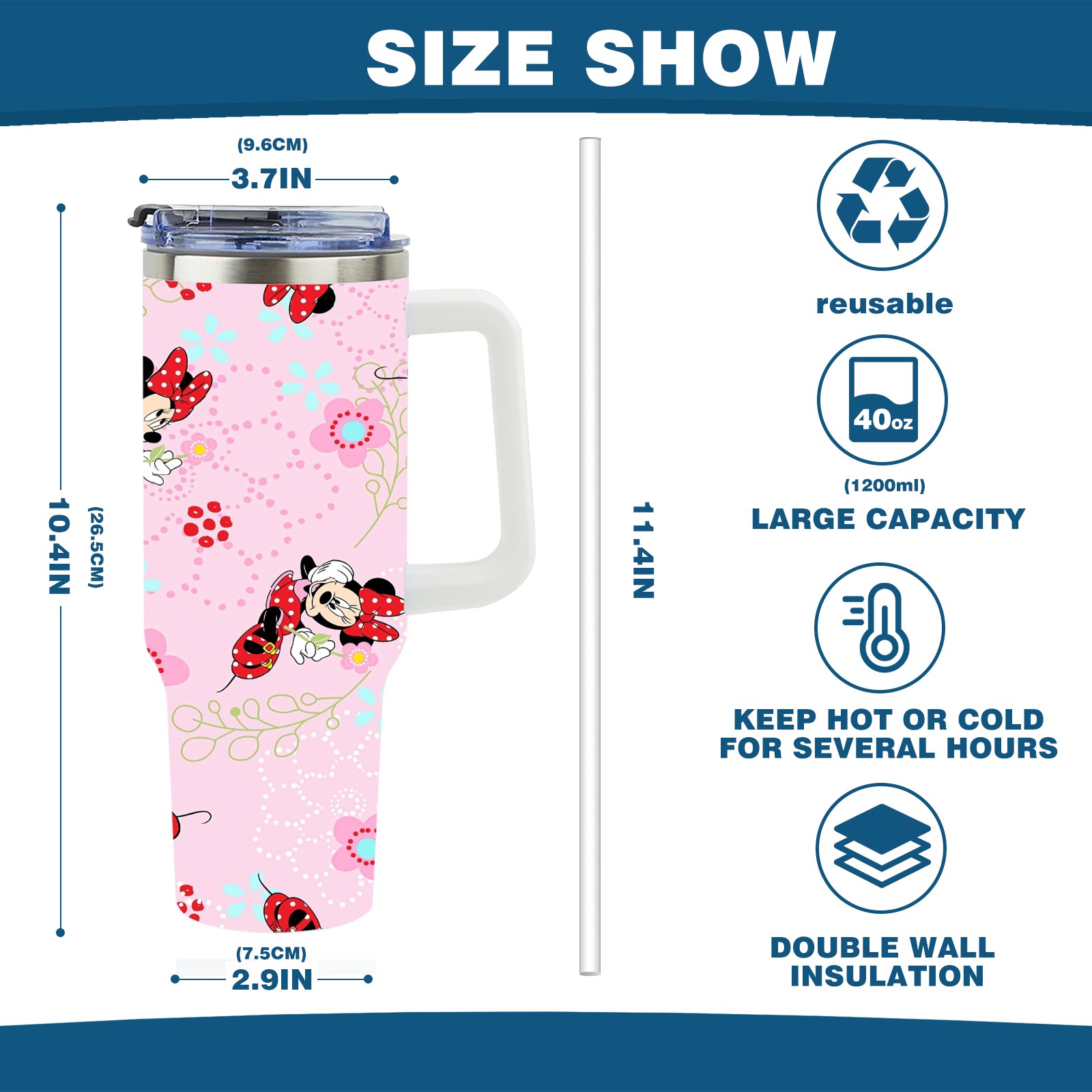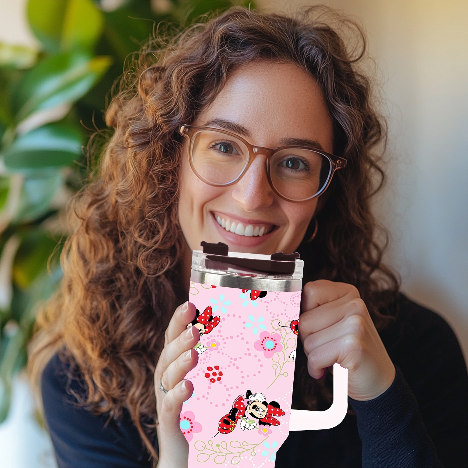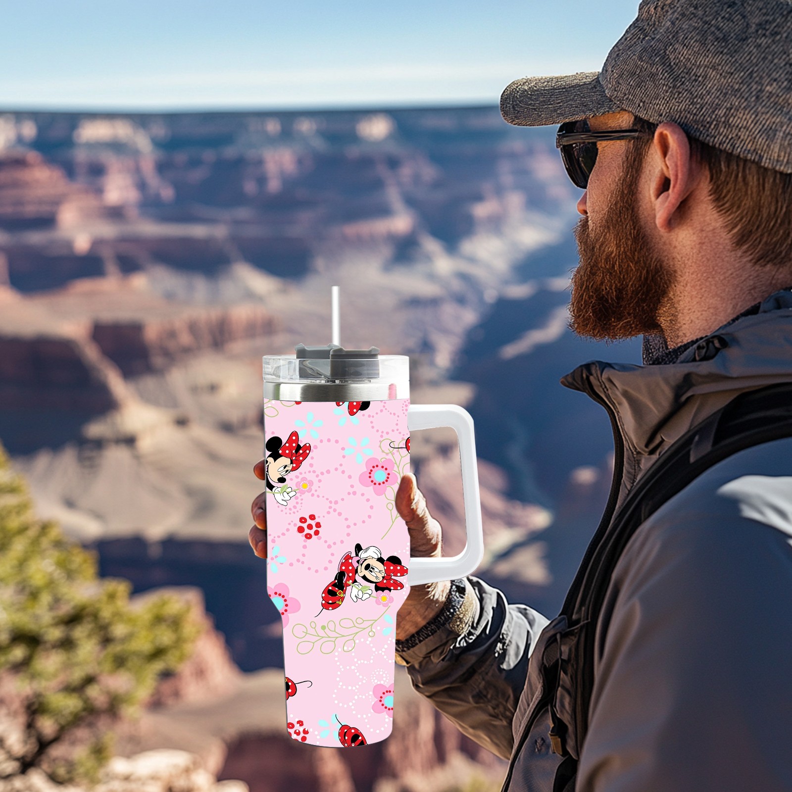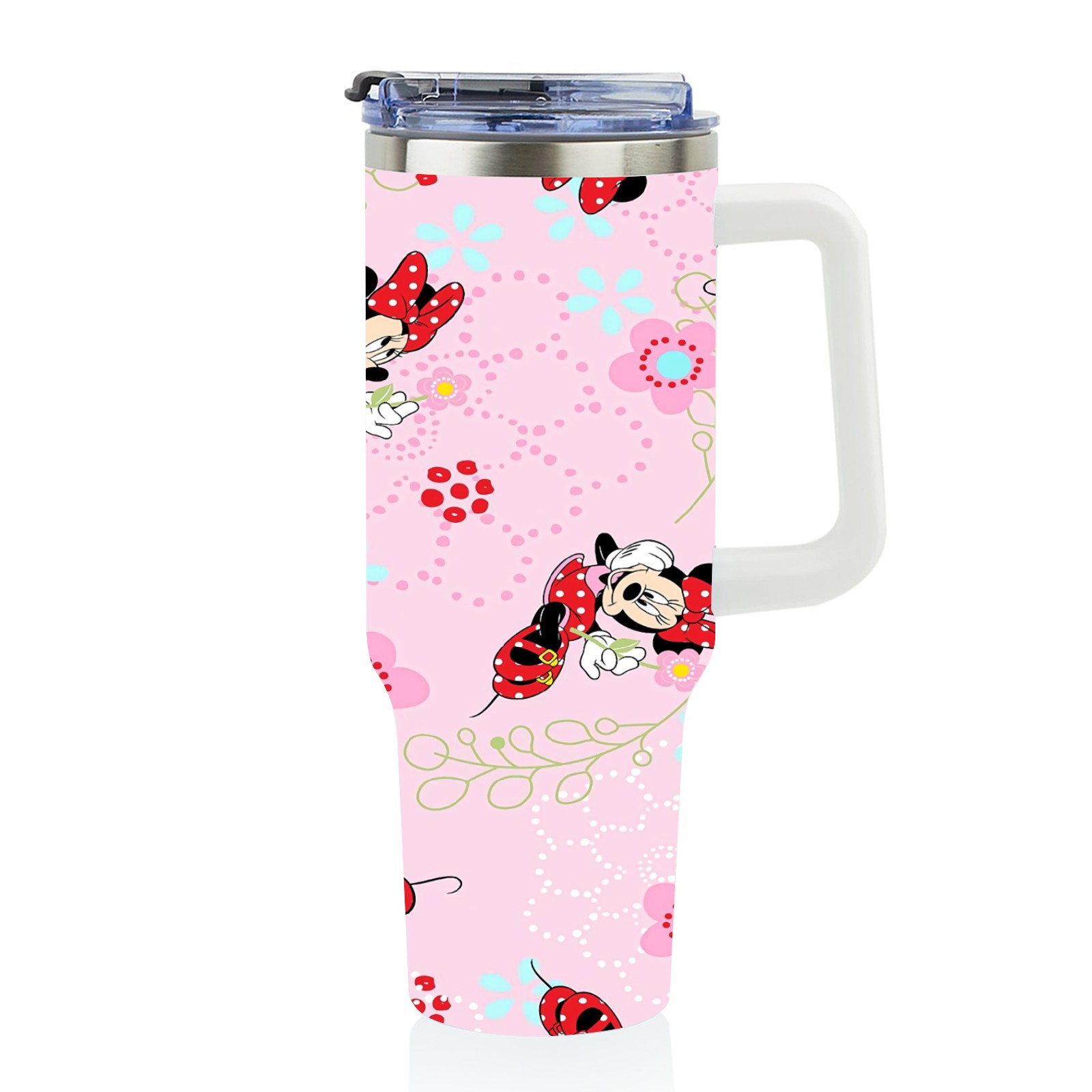 40oz Pink Mickey Mouse Minnie thermos with lid and straw, leak-proof stainless steel, with handle, spill-proof bottle, convenient for travel(pink)