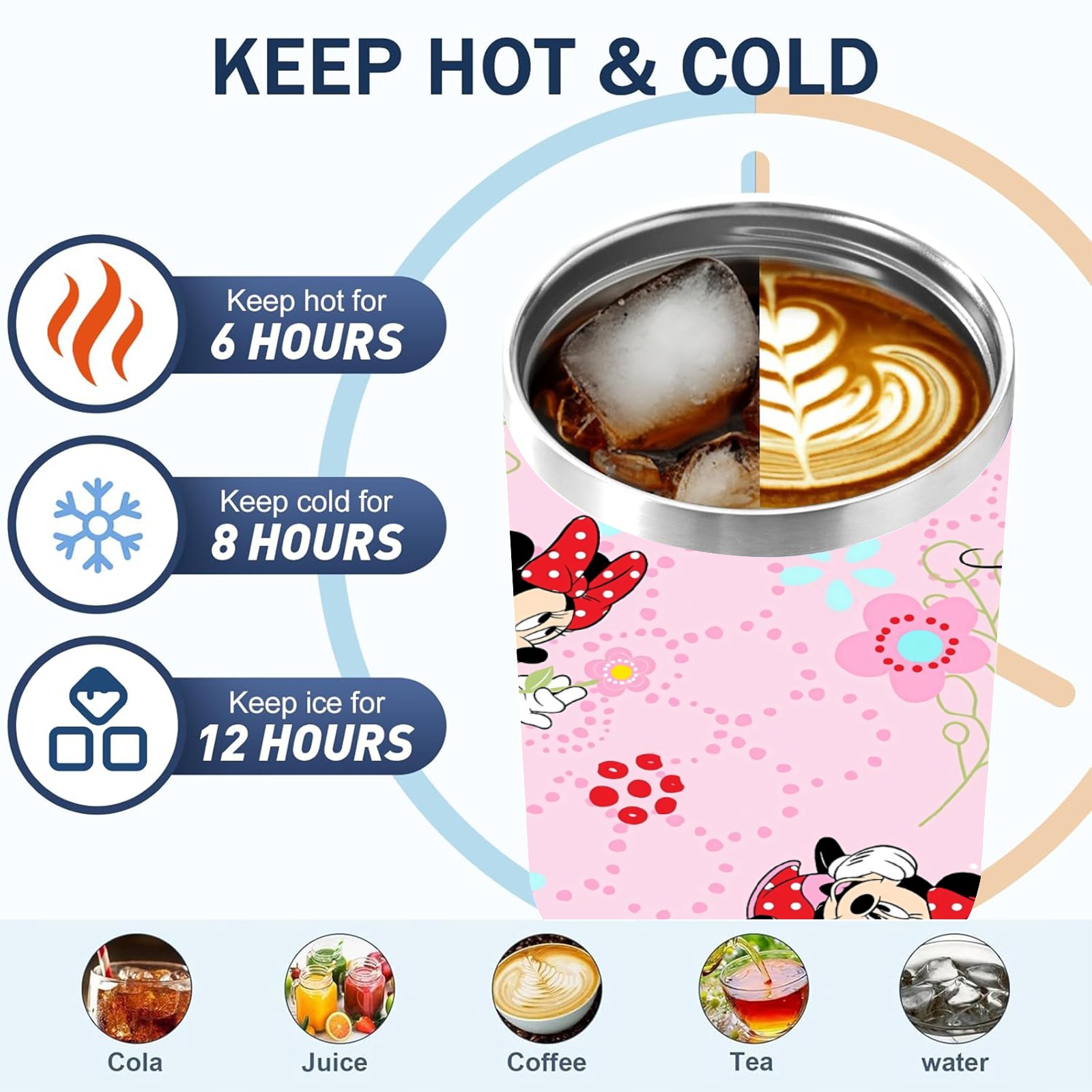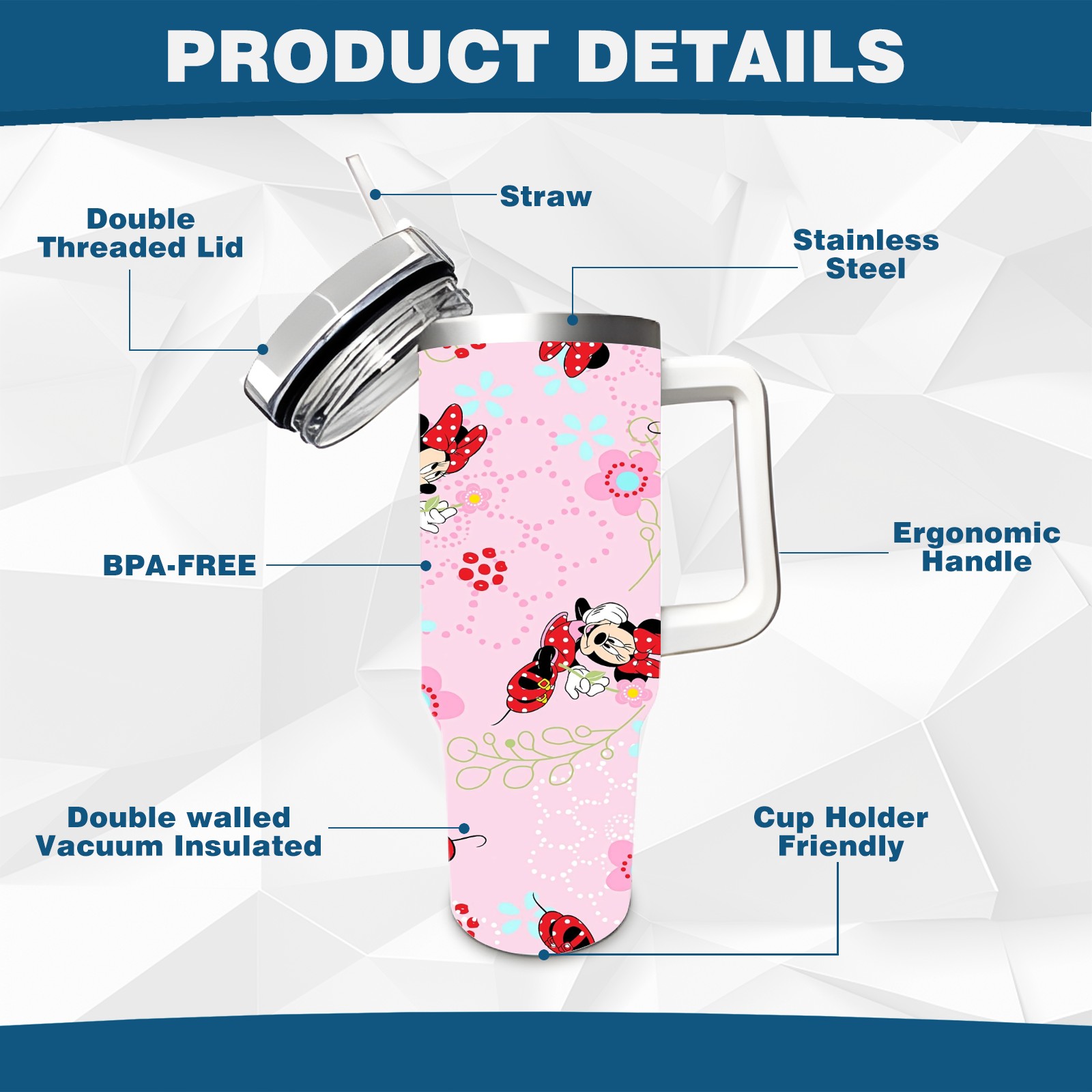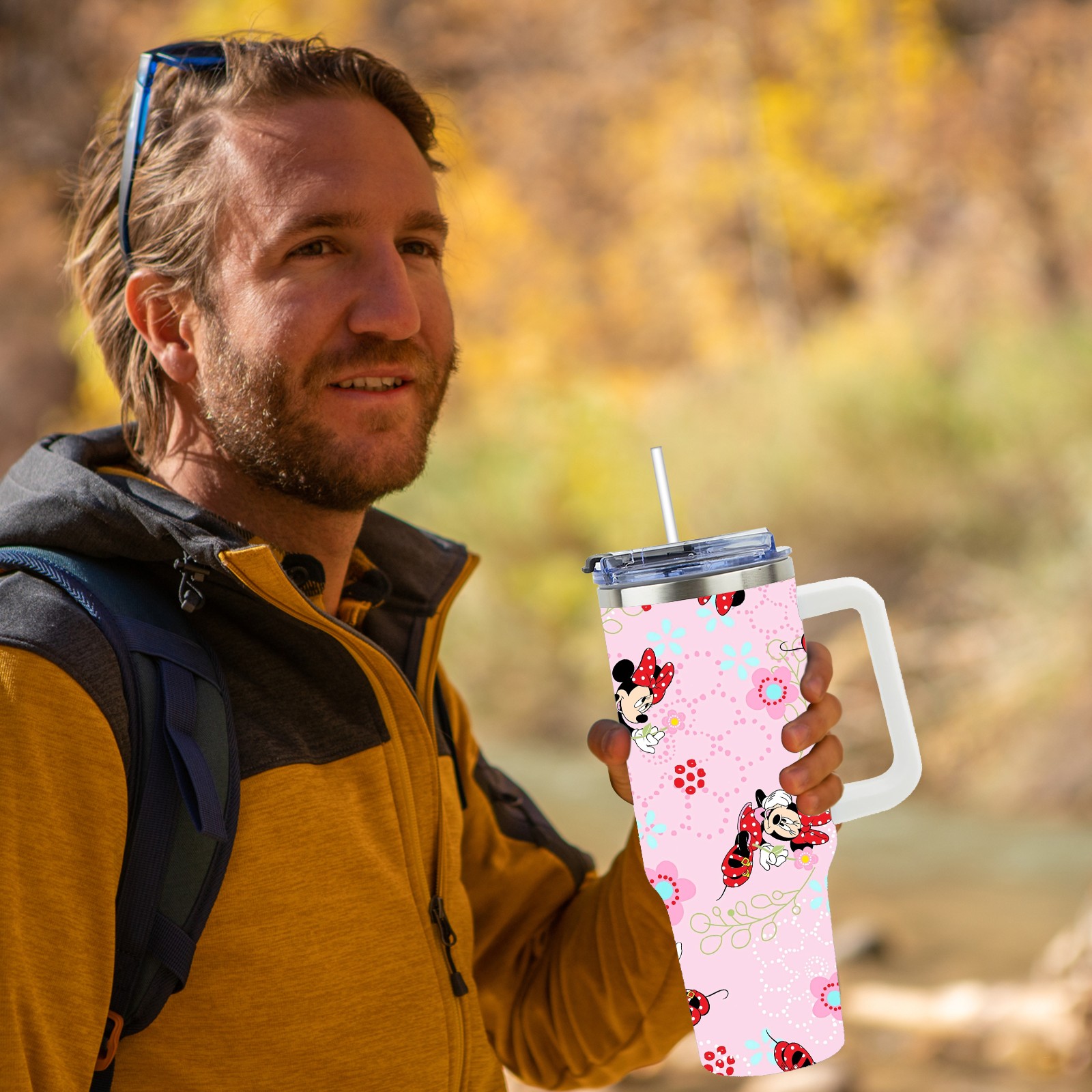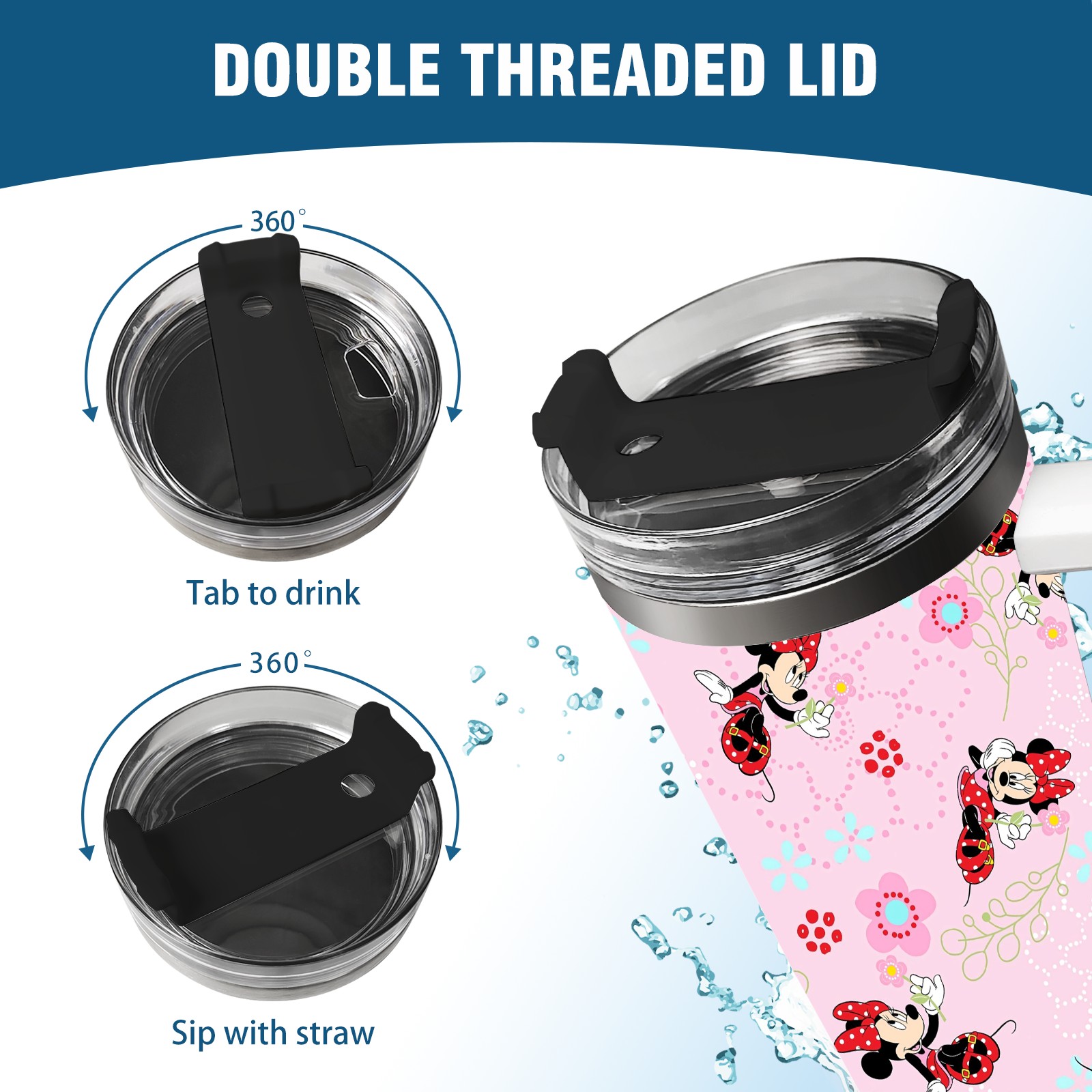 40oz Pink Mickey Mouse Minnie thermos with lid and straw, leak-proof stainless steel, with handle, spill-proof bottle, convenient for travel(pink)
