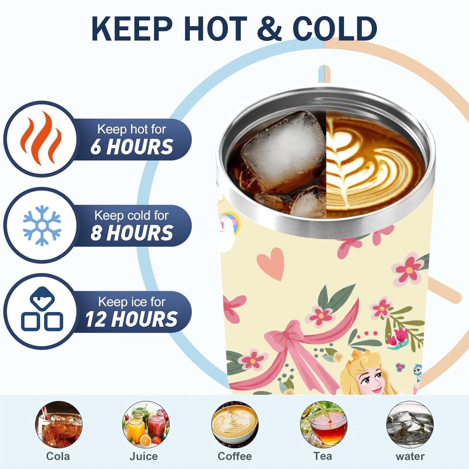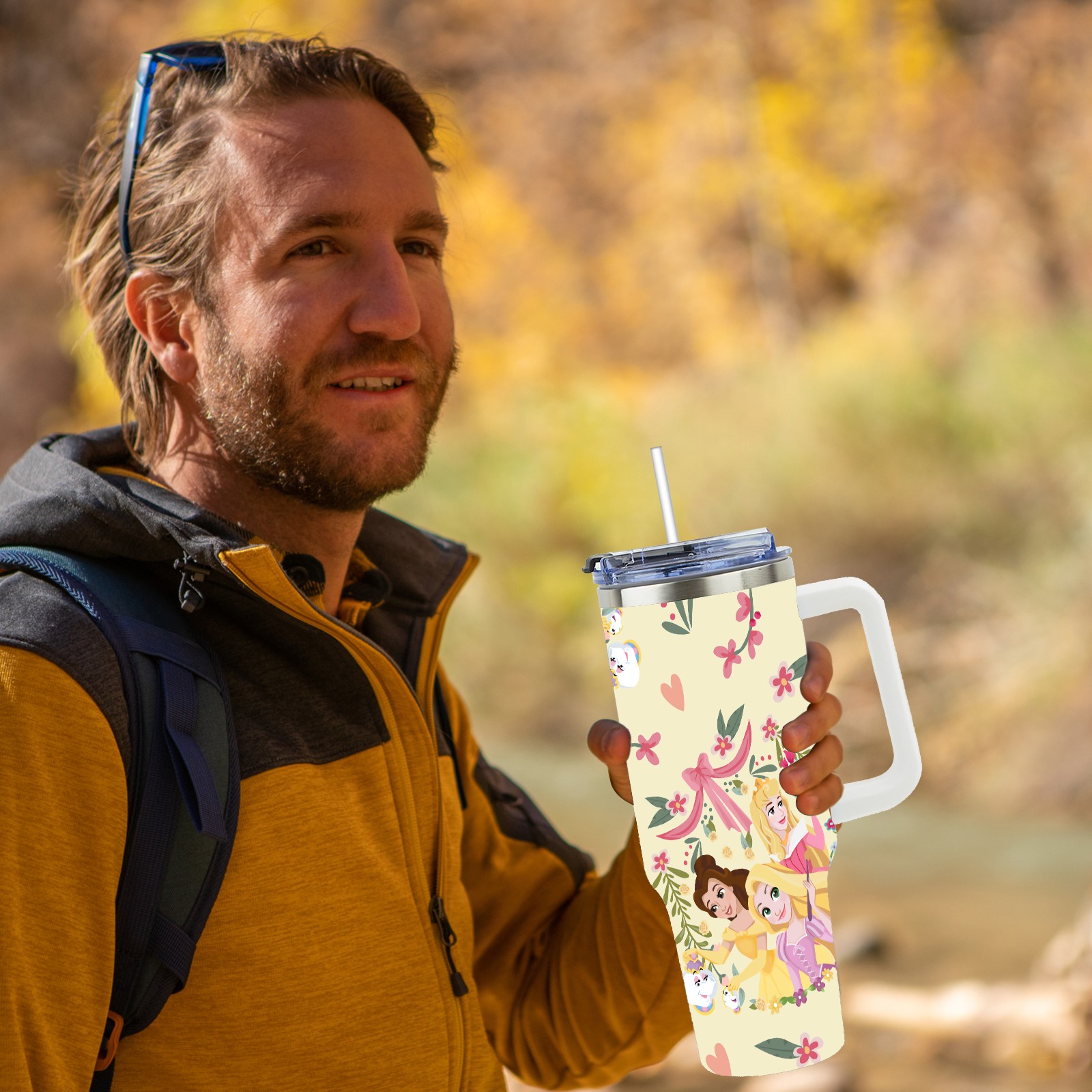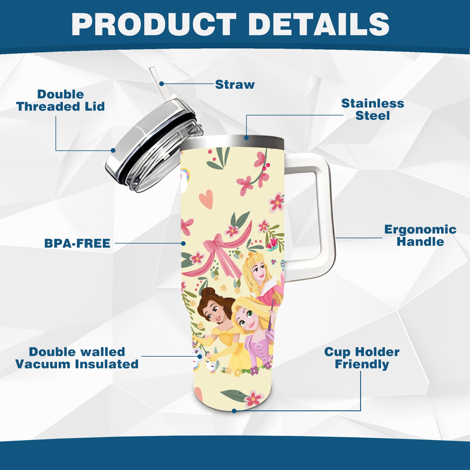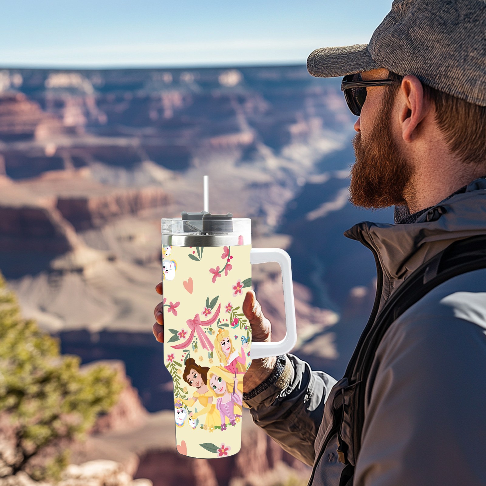 40oz Princess Pattern thermos with lid and straw, leak-proof stainless steel, with handle, spill-proof bottle, convenient for travel(pink)