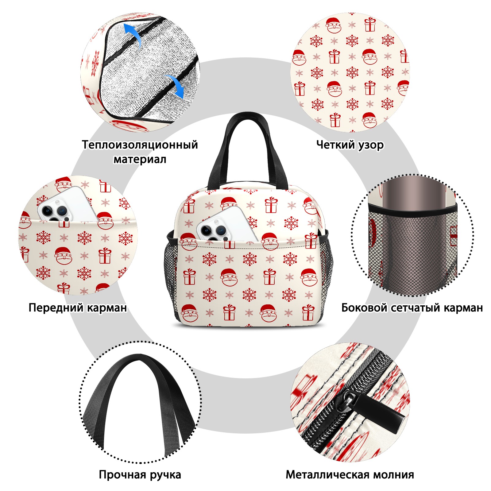Lunch Bag,Lunch Box for Women Men,Red Christmas With Santa Gift Reusable Insulated Lunch Tote,Small Leakproof Cute Lunch Cooler with High Capacity for Work,Picnic,Camping