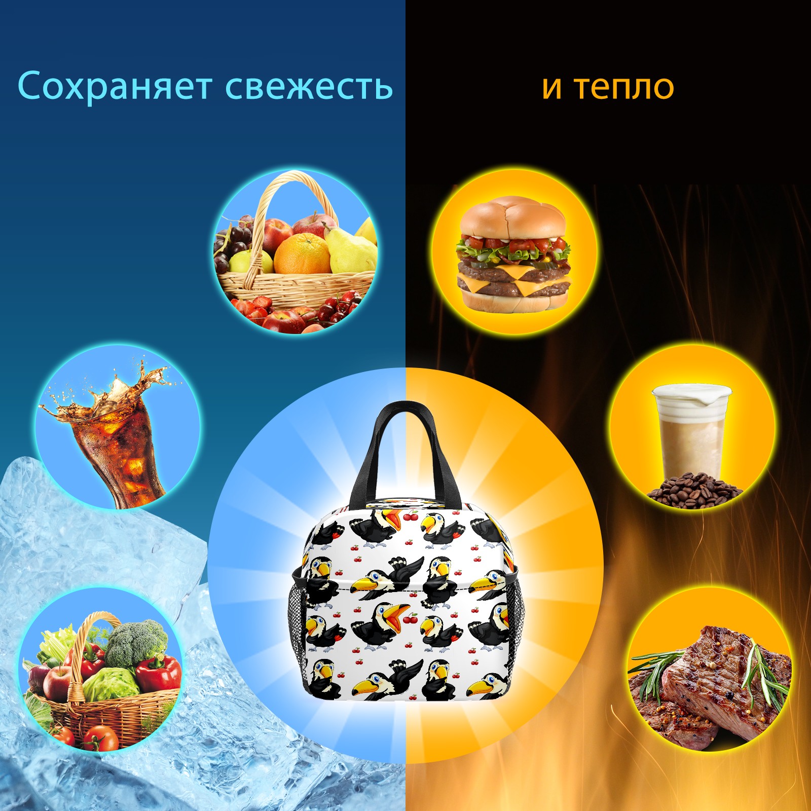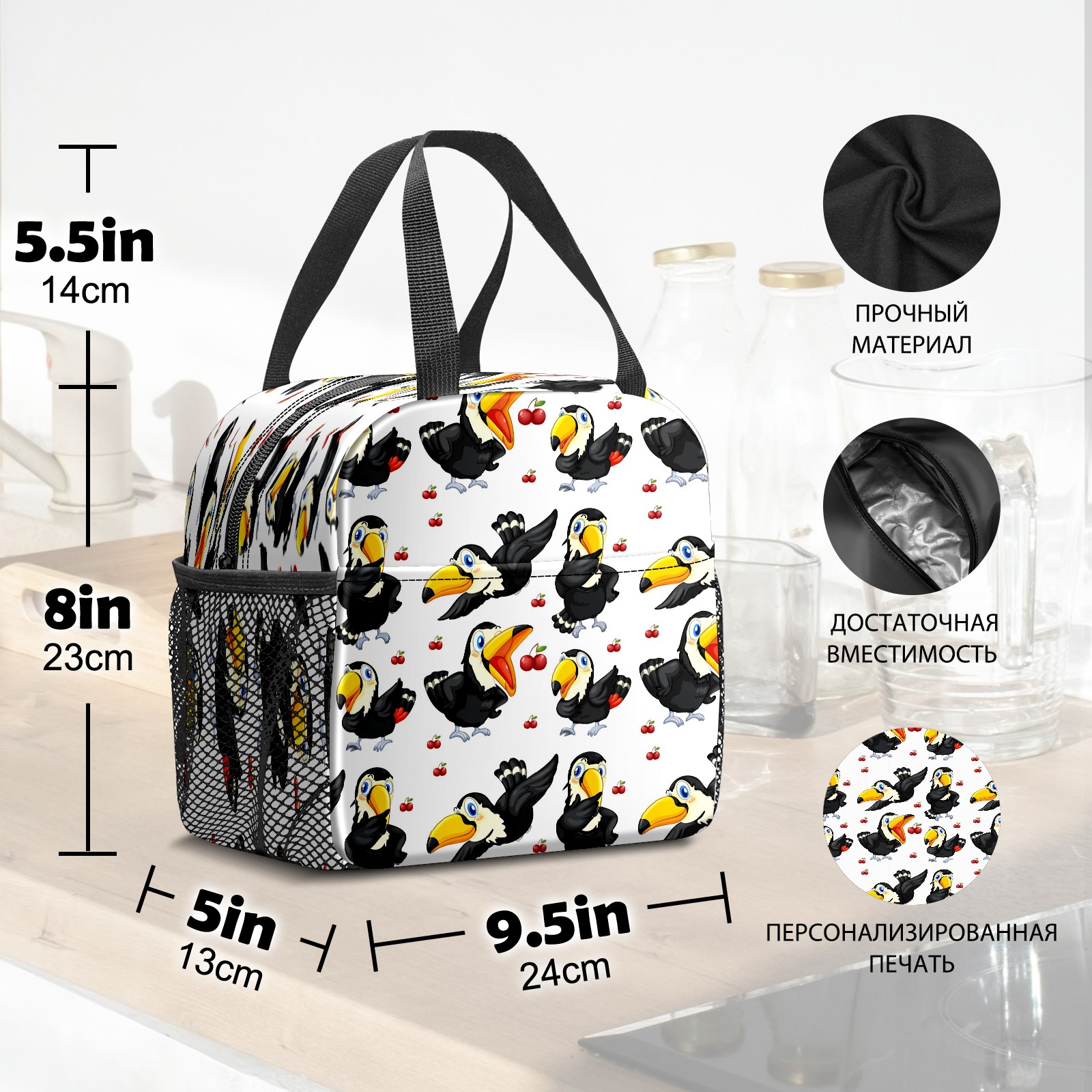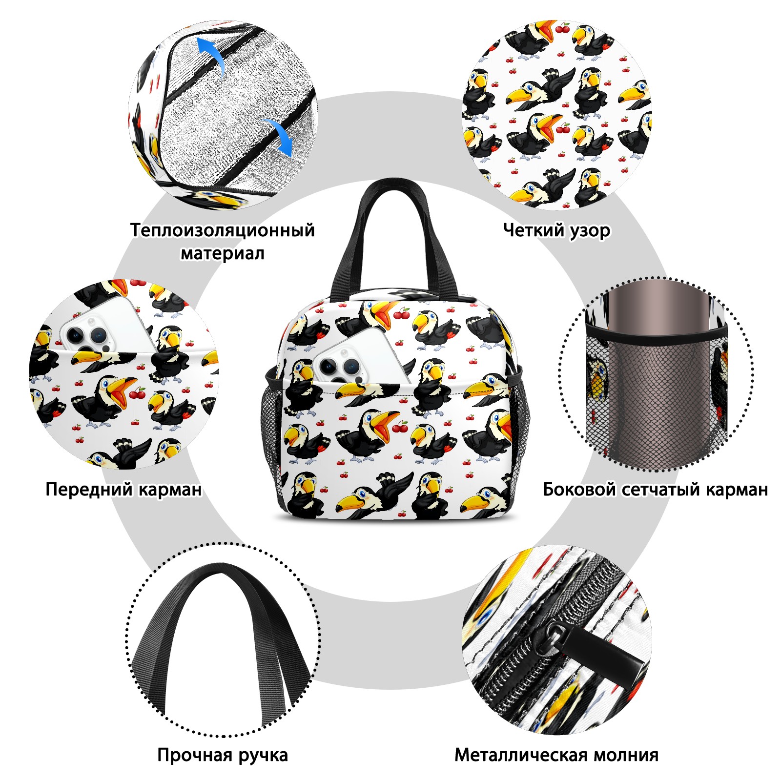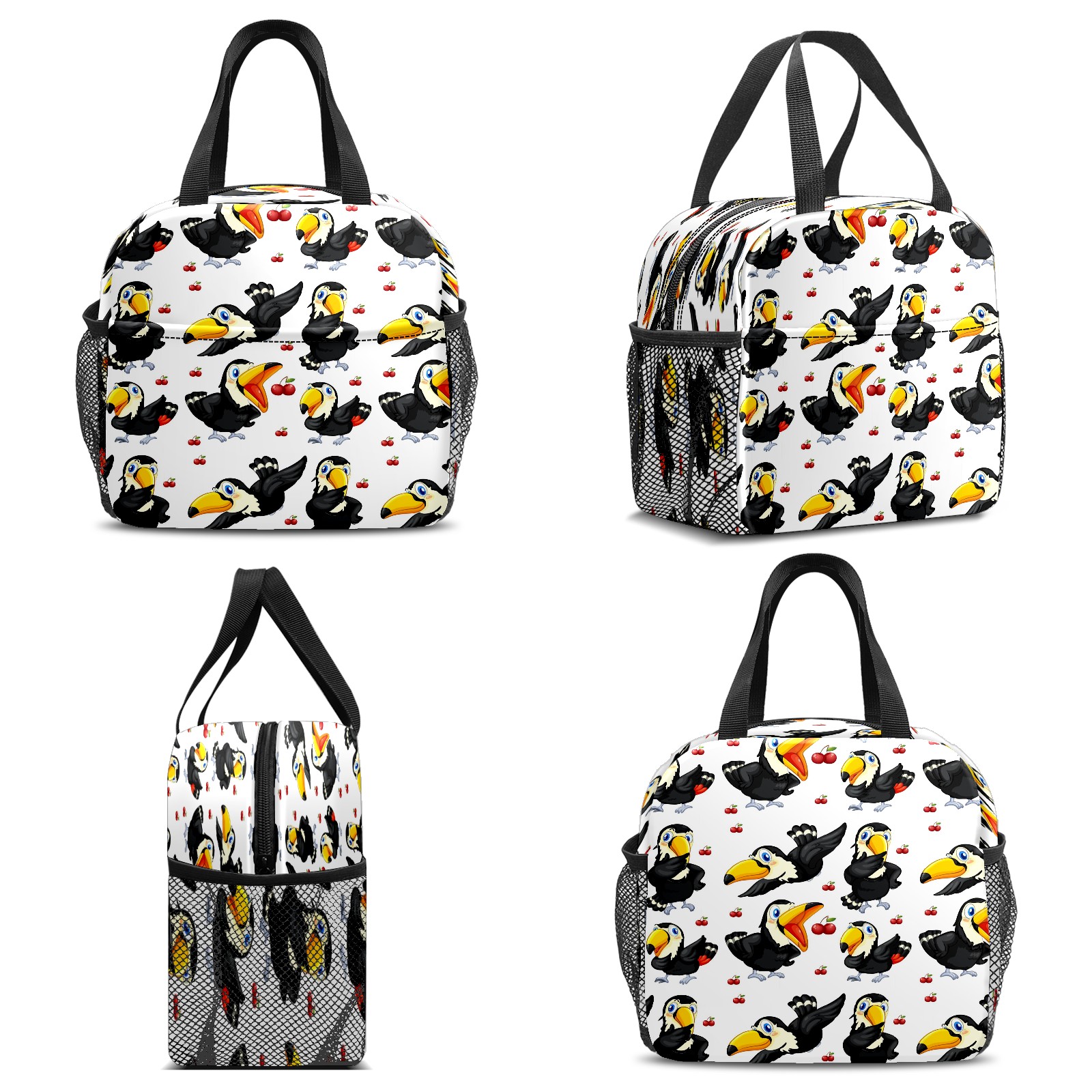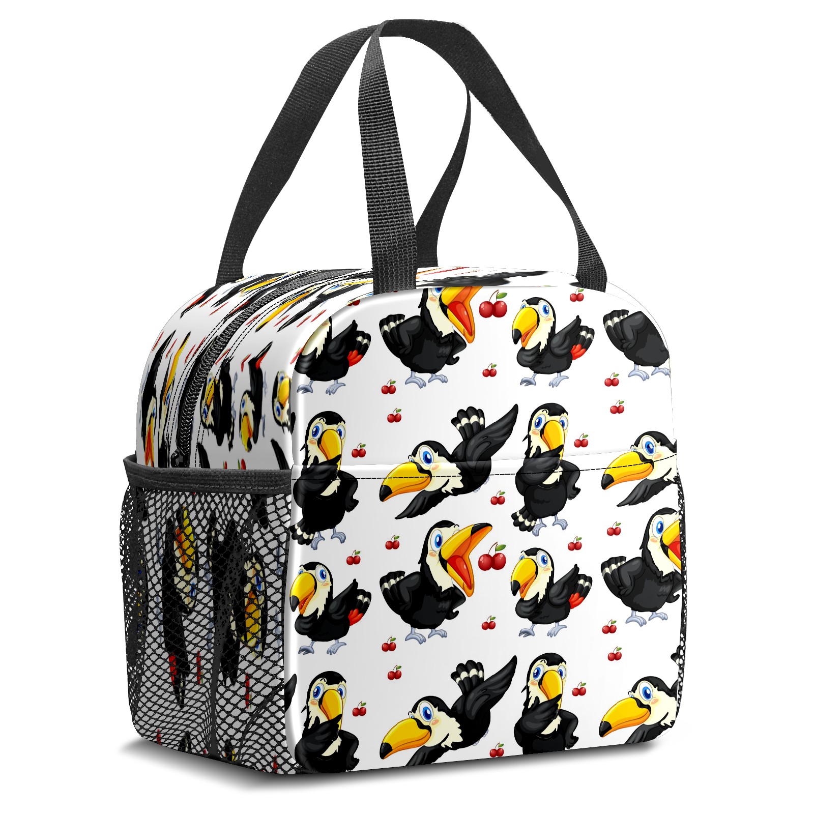 Lunch Bag,Lunch Box for Women Men,Toucan Red Cherries- Black Bird White Reusable Insulated Lunch Tote,Small Leakproof Cute Lunch Cooler with High Capacity for Work,Picnic,Camping