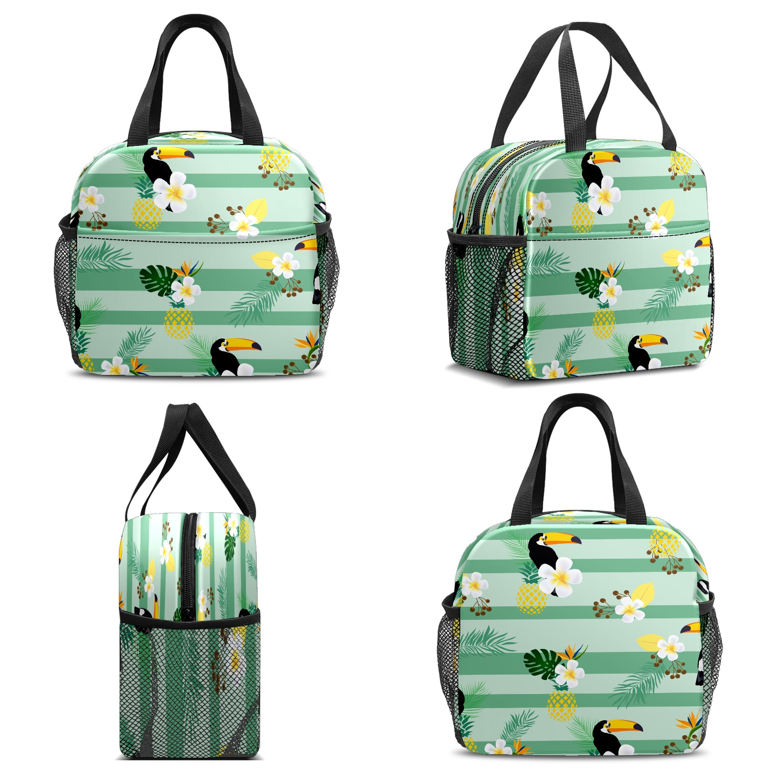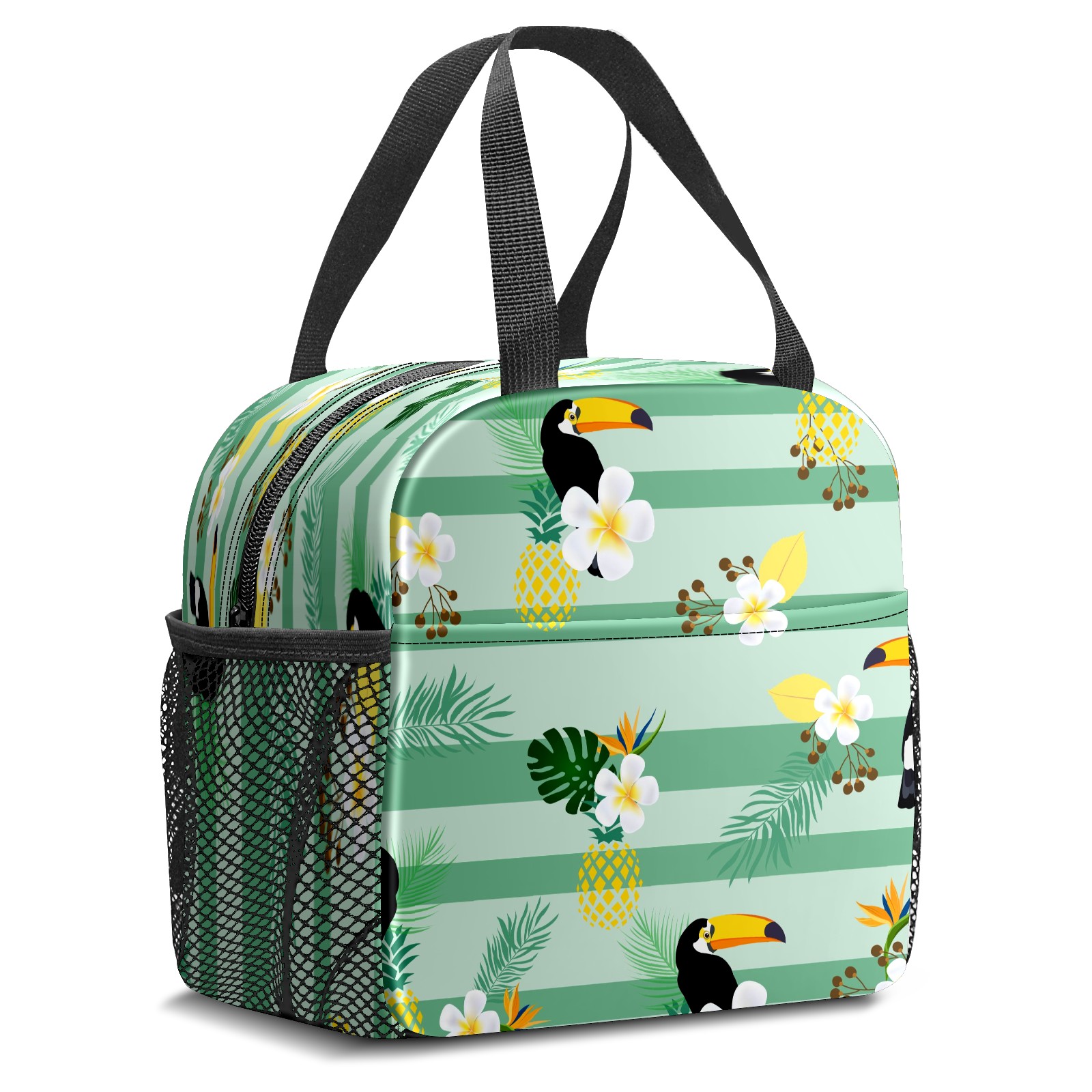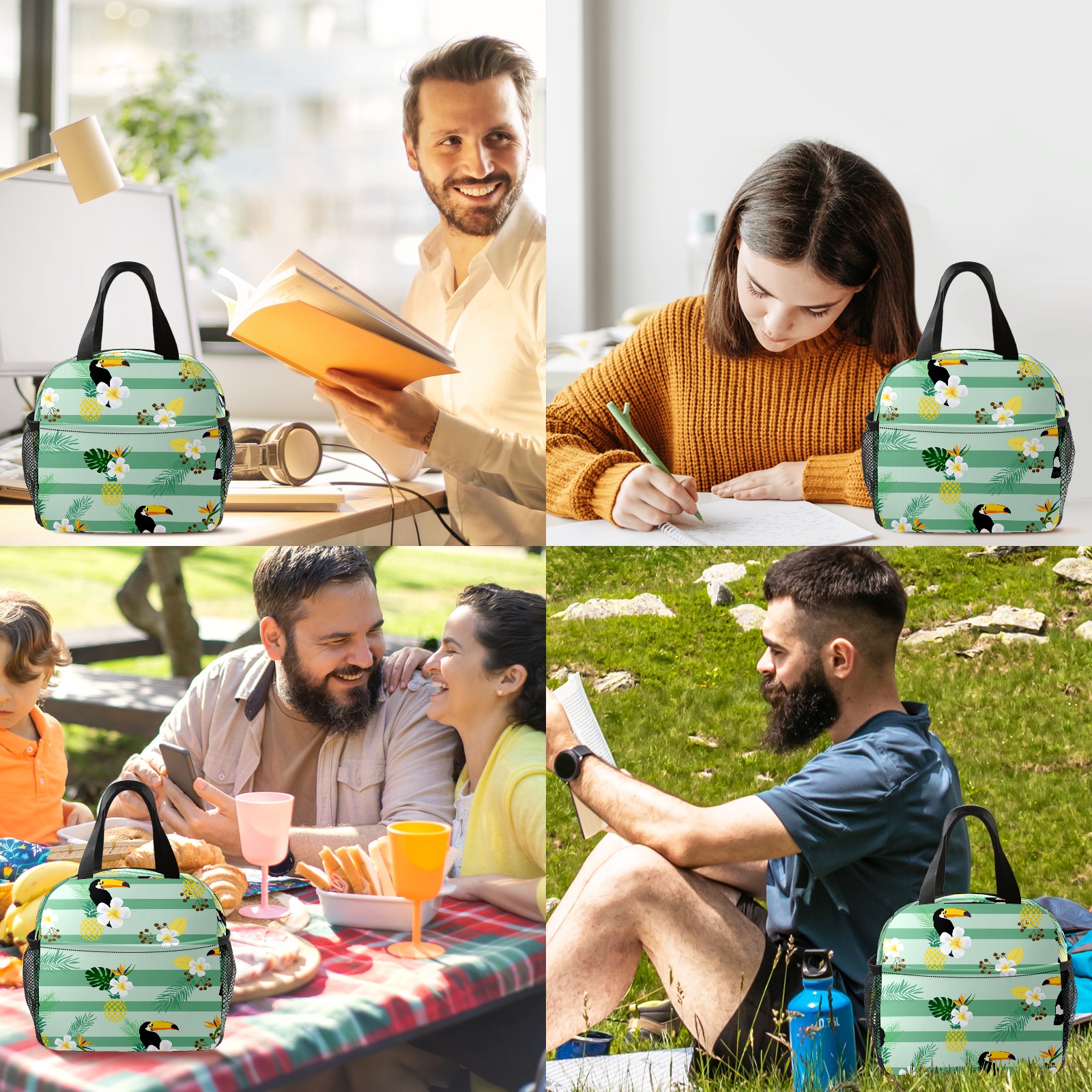 Lunch Bag,Lunch Box for Women Men,Toucans Pineapples Foliage - Green Striped Summer Reusable Insulated Lunch Tote,Small Leakproof Cute Lunch Cooler with High Capacity for Work,Picnic,Camping