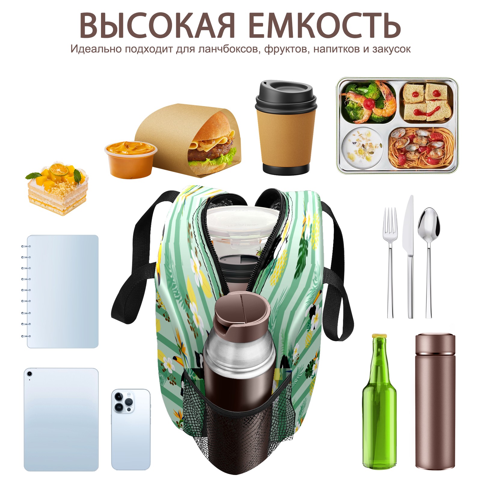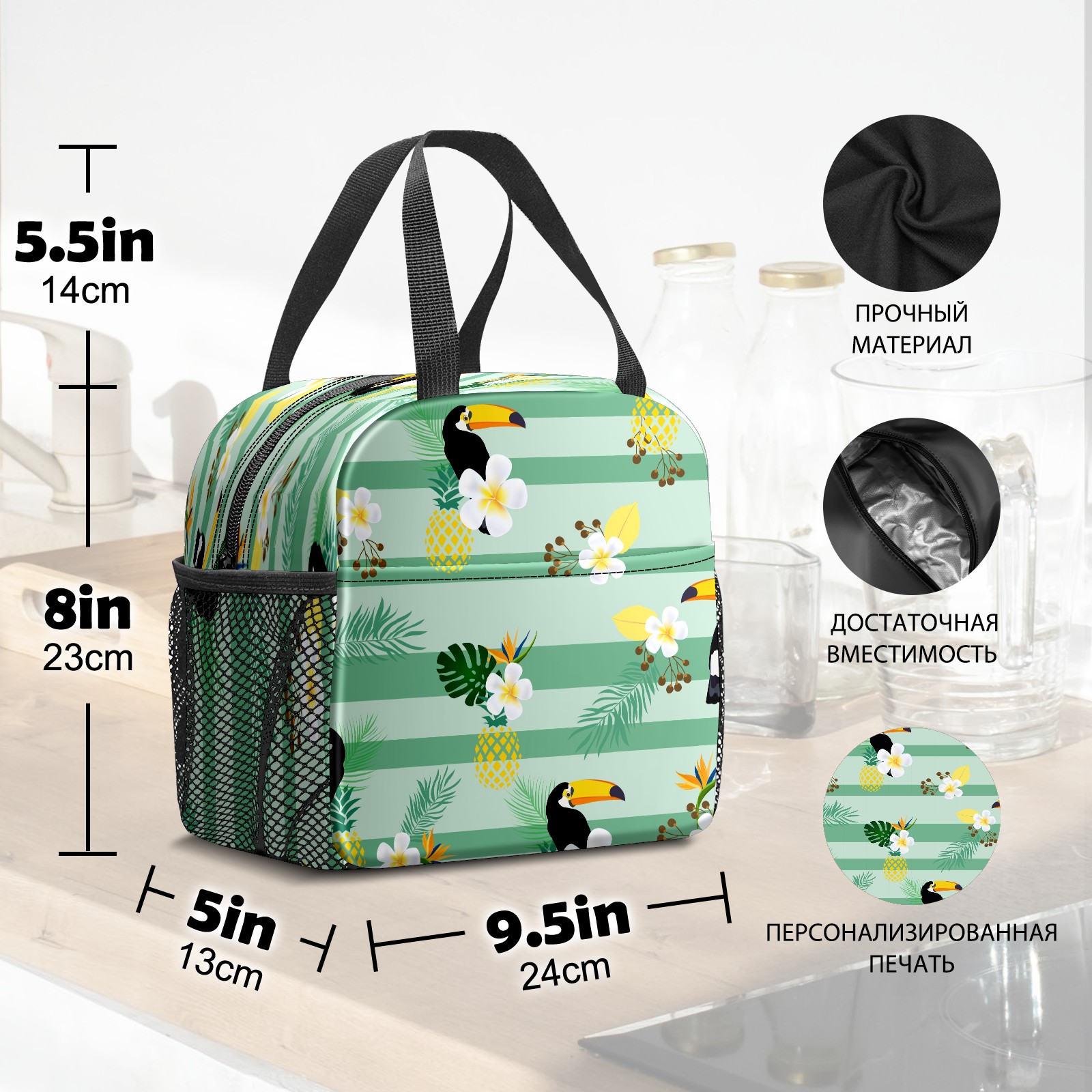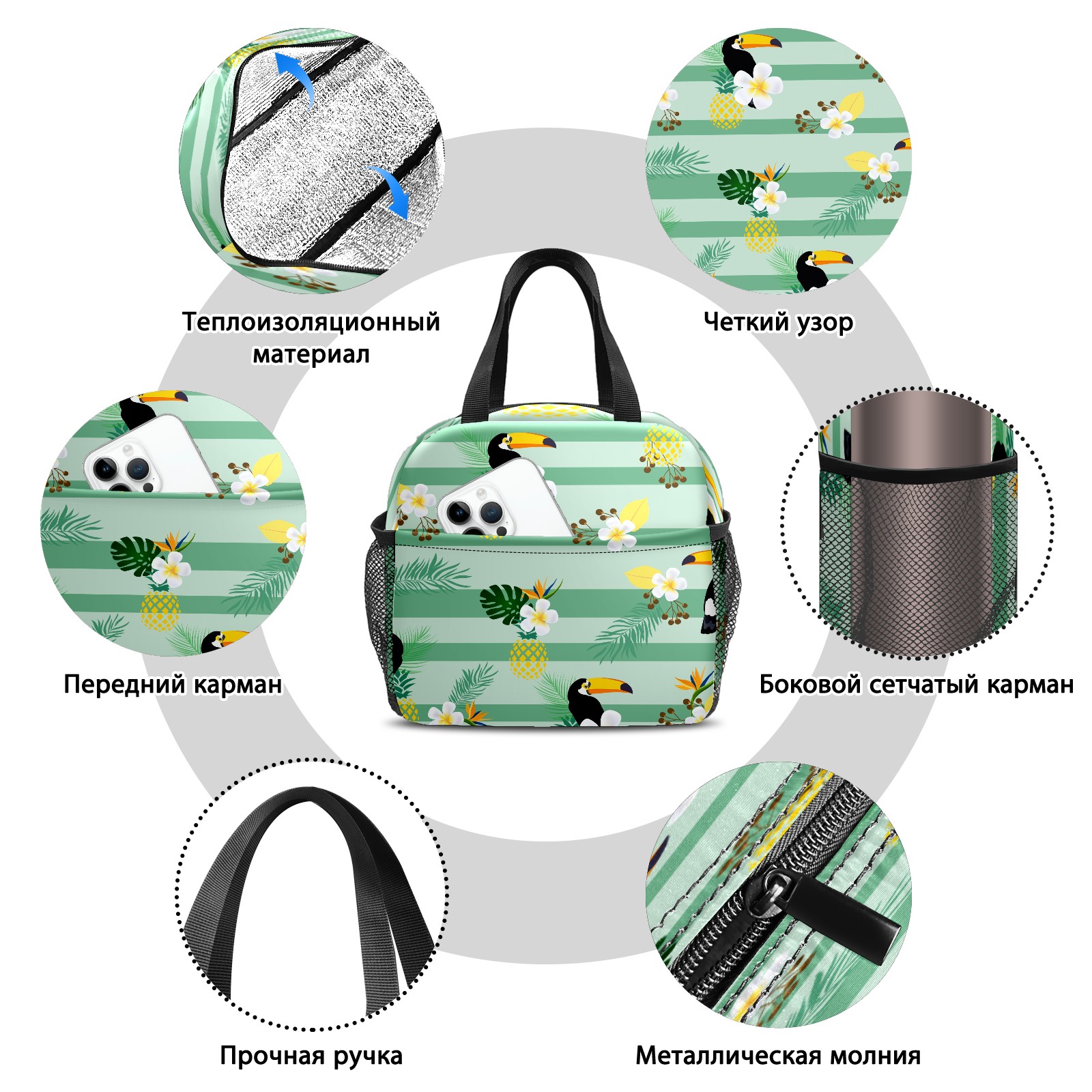 Lunch Bag,Lunch Box for Women Men,Toucans Pineapples Foliage - Green Striped Summer Reusable Insulated Lunch Tote,Small Leakproof Cute Lunch Cooler with High Capacity for Work,Picnic,Camping