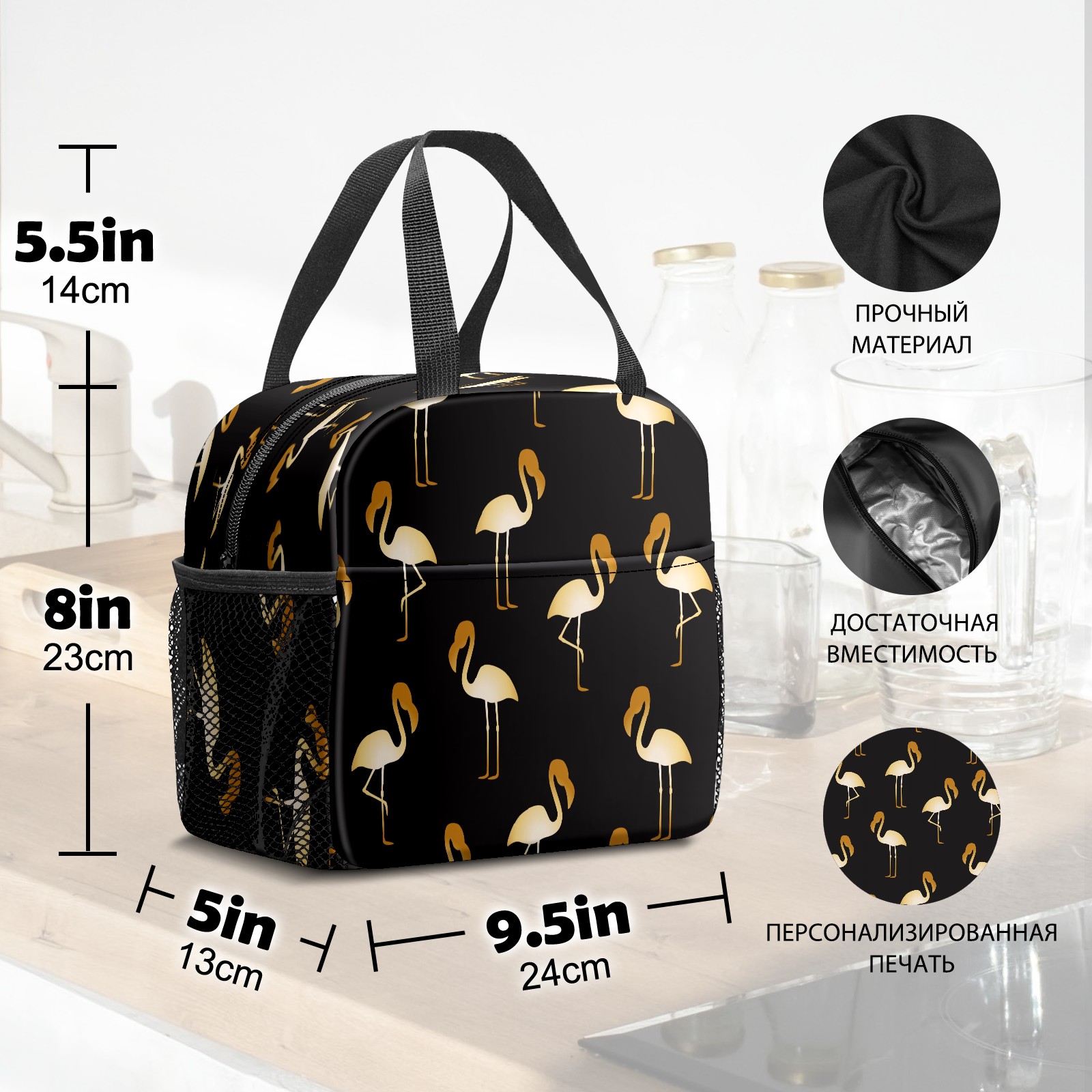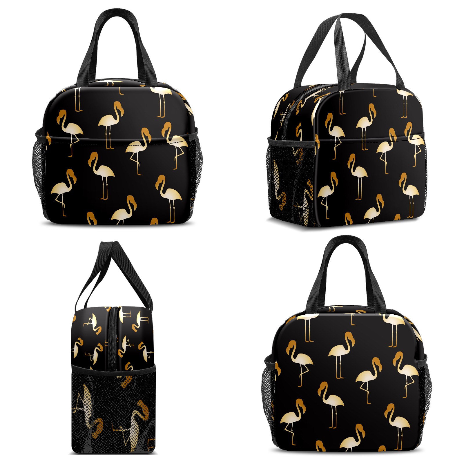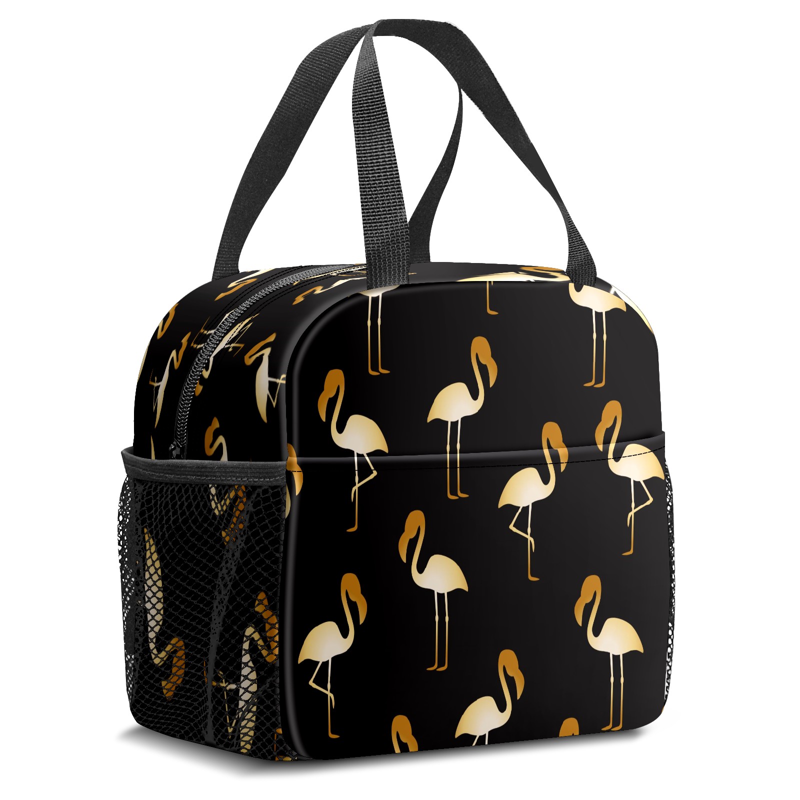 Lunch Bag,Lunch Box for Women Men,Golden Flamingo Illustration - Animal Bird Black Reusable Insulated Lunch Tote,Small Leakproof Cute Lunch Cooler with High Capacity for Work,Picnic,Camping
