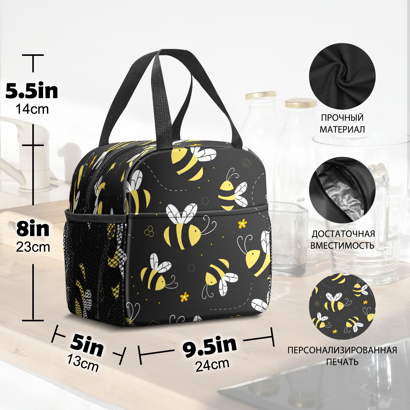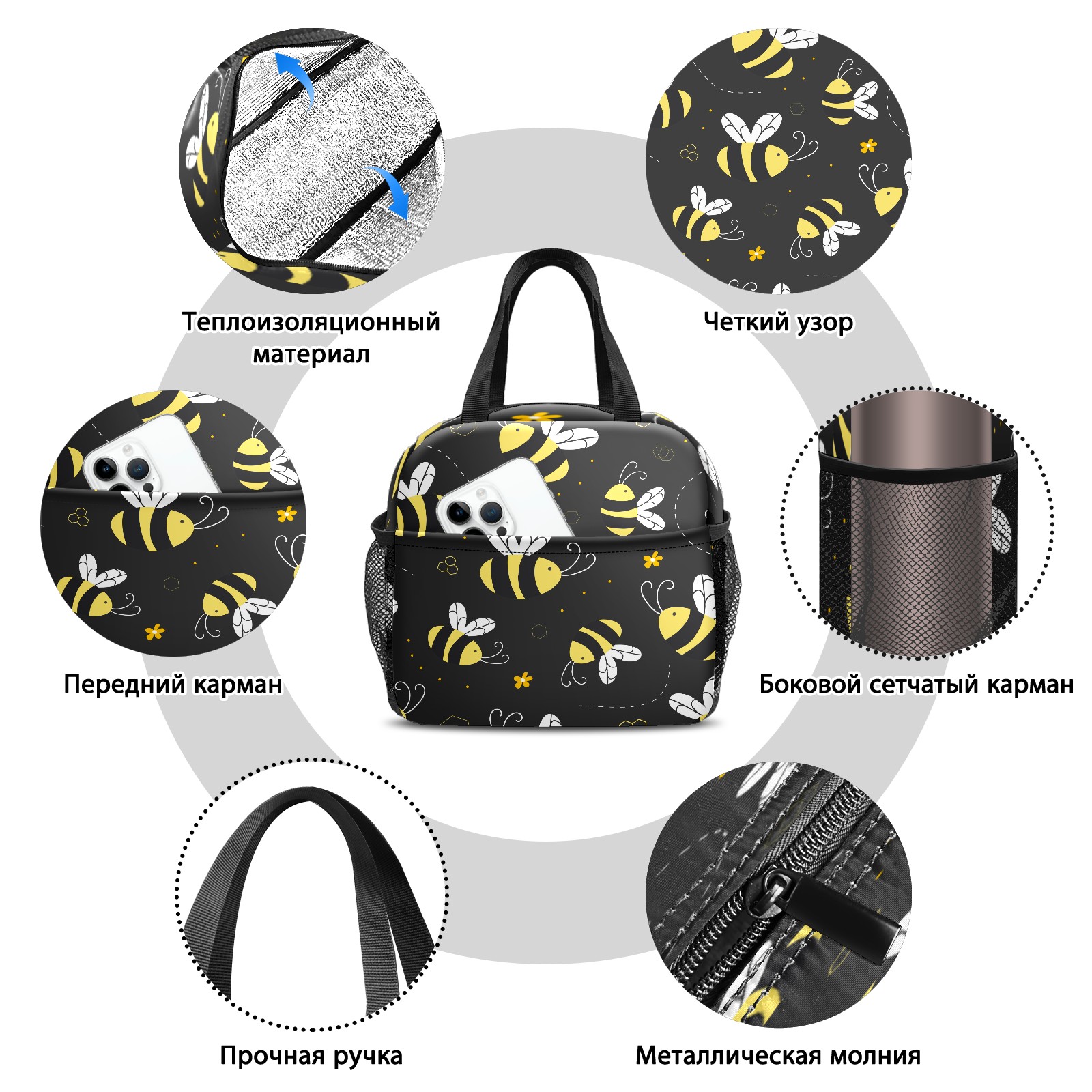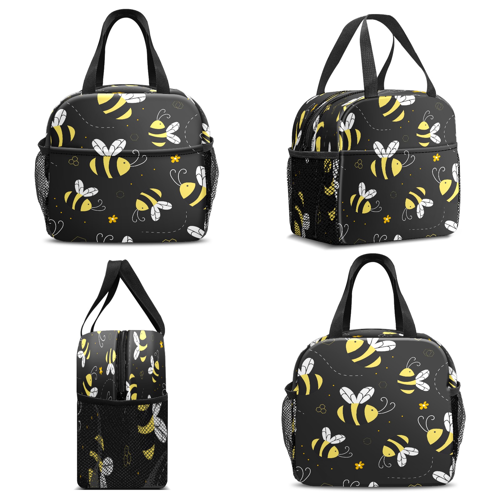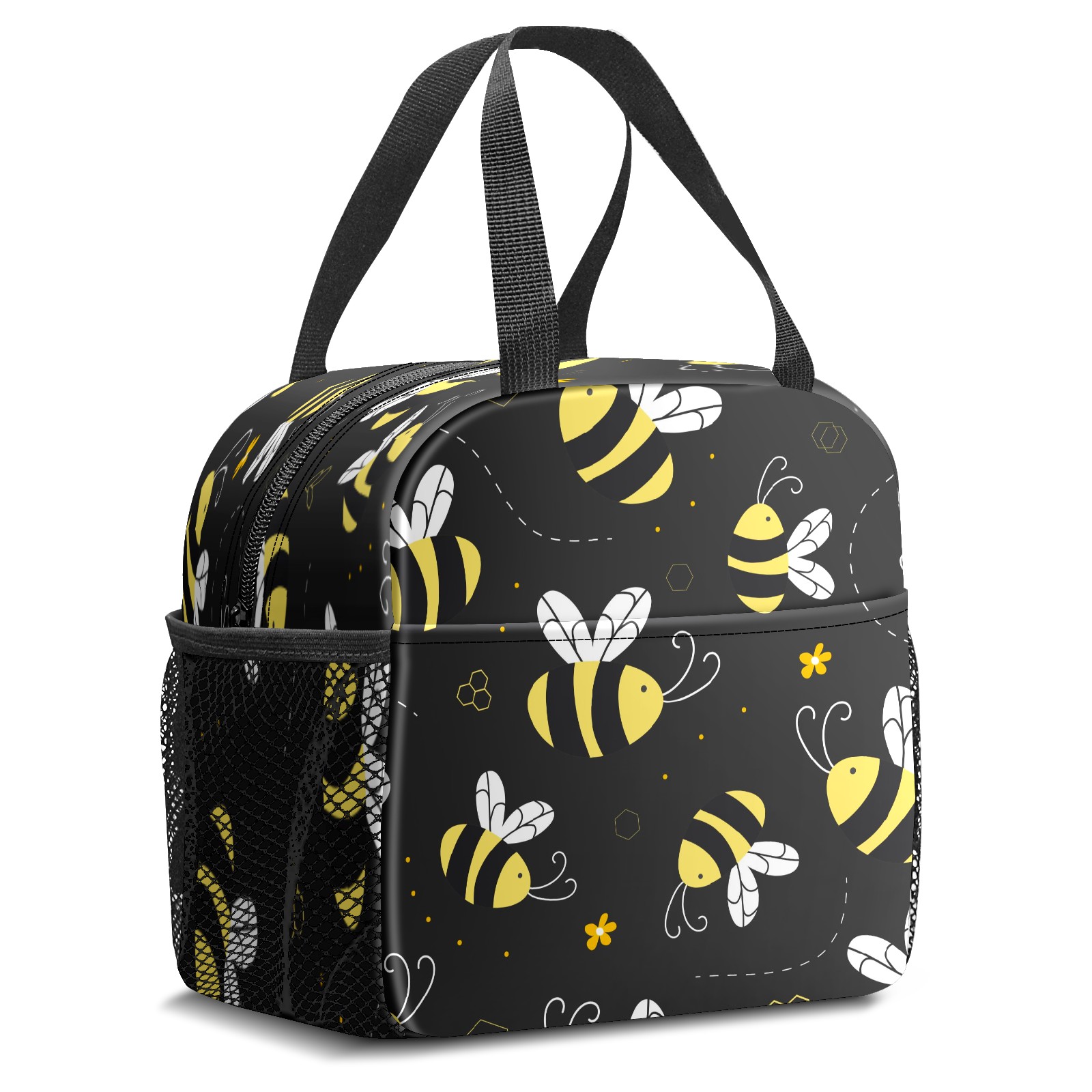 Lunch Bag,Lunch Box for Women Men,Cartoon Cute Yellow Bees - Black Reusable Insulated Lunch Tote,Small Leakproof Cute Lunch Cooler with High Capacity for Work,Picnic,Camping