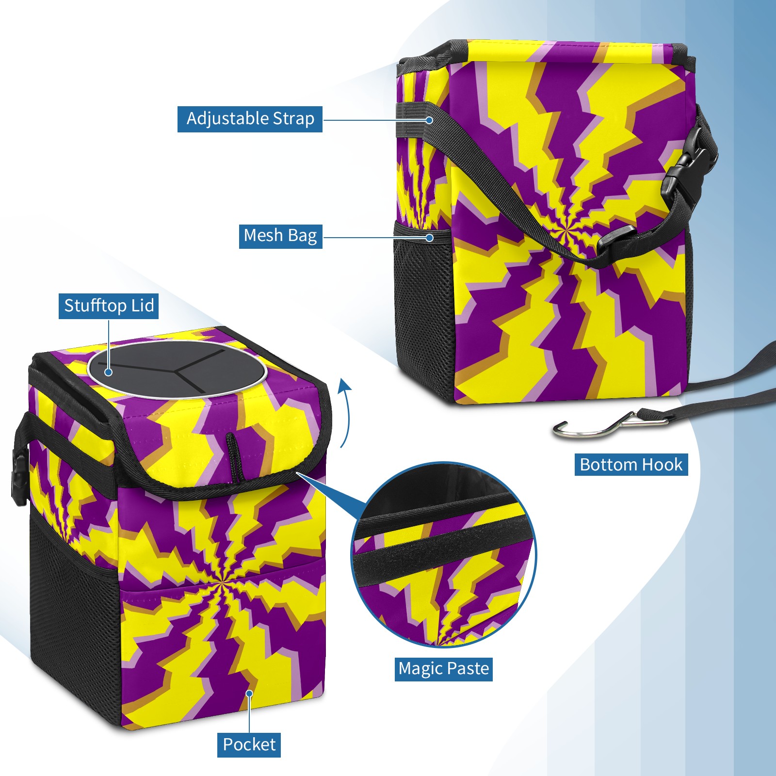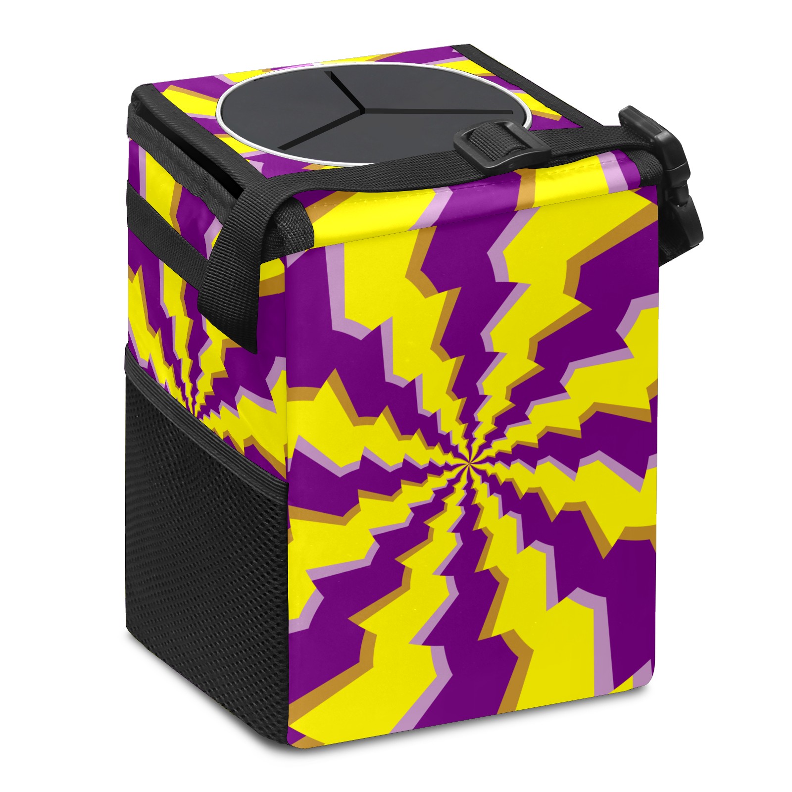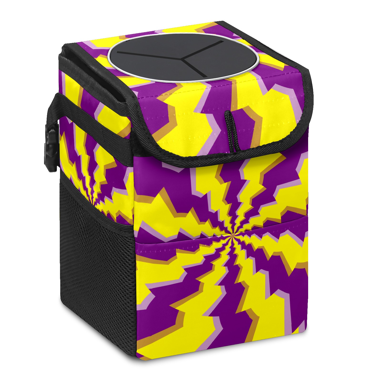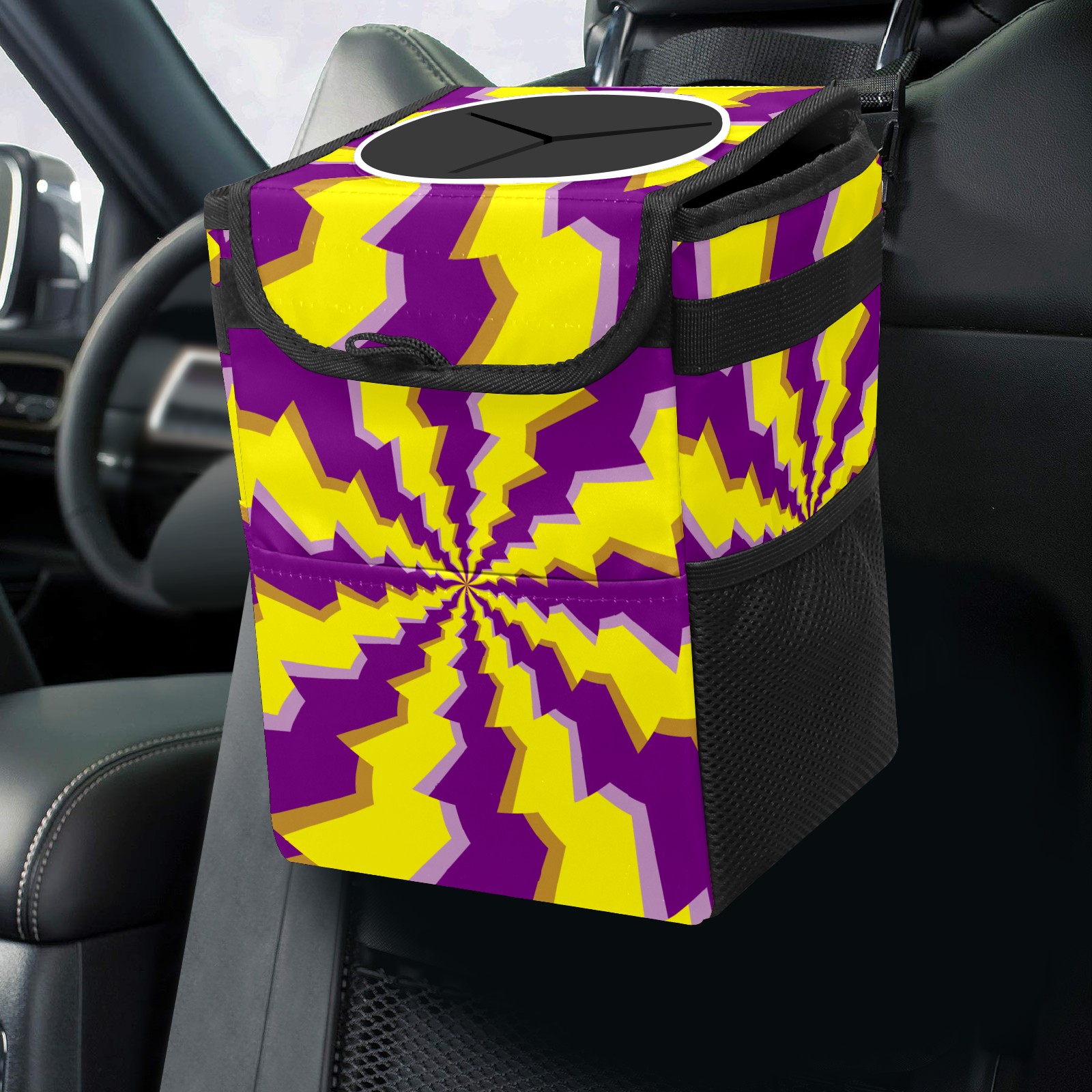 Car Garbage Can — Multi-functional, Lightweight Portable, Reusable Vehicle Trash Can, Waterproof with Sufficient Storage Capacity Yellow Purple Psychedelic Round Illusion