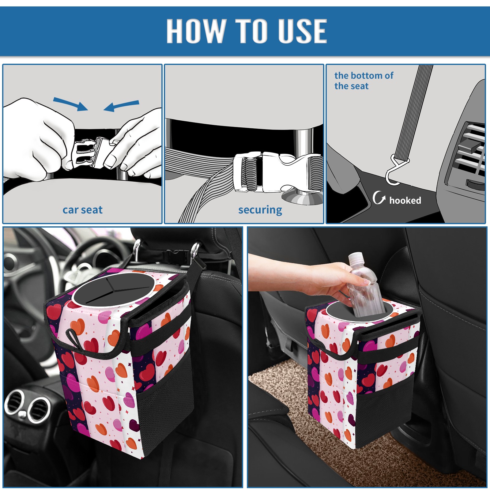 • <p>Keep your car neat with this practical car trash can—built for durability, versatility, and on-the-go convenience! Crafted from quality twill fabric with a waterproof lining, it prevents leaks, keeping seats/floors clean. Clean easily: empty directly or secure a disposable bag with side clips. Adjustable pull cord fits floor, seat, or headrest. 9.5x6.3x6.7 inches, ample space for daily trash, folds flat for storage. More than a trash can, it doubles as a storage bag for cups, toys, docs, and small gadgets—must-have car interior accessory. Installs in seconds on seats, console, or gear shift; adjustable straps keep it stable, no slipping on bumpy roads. Perfect gift for new car owners!</p>