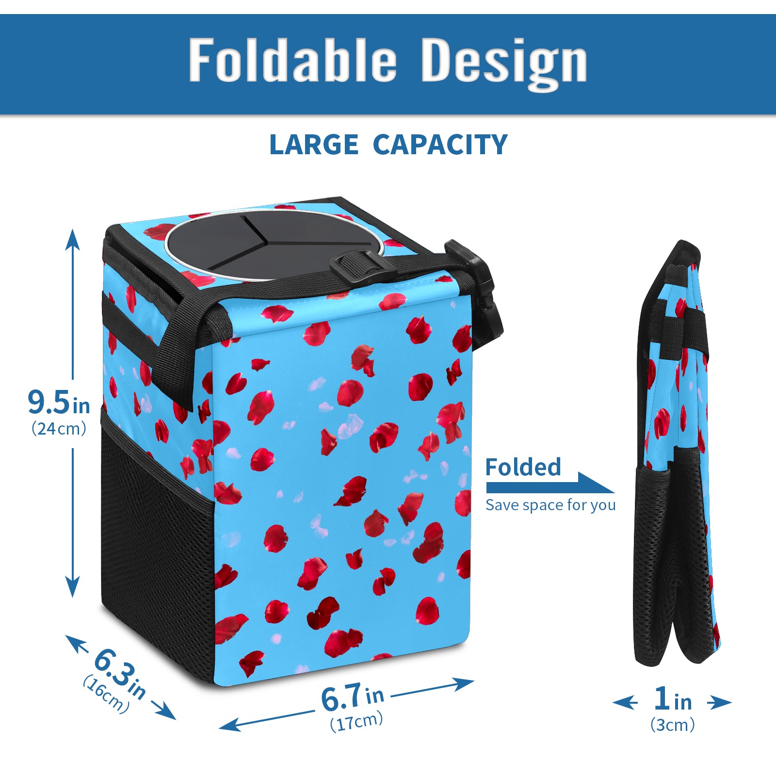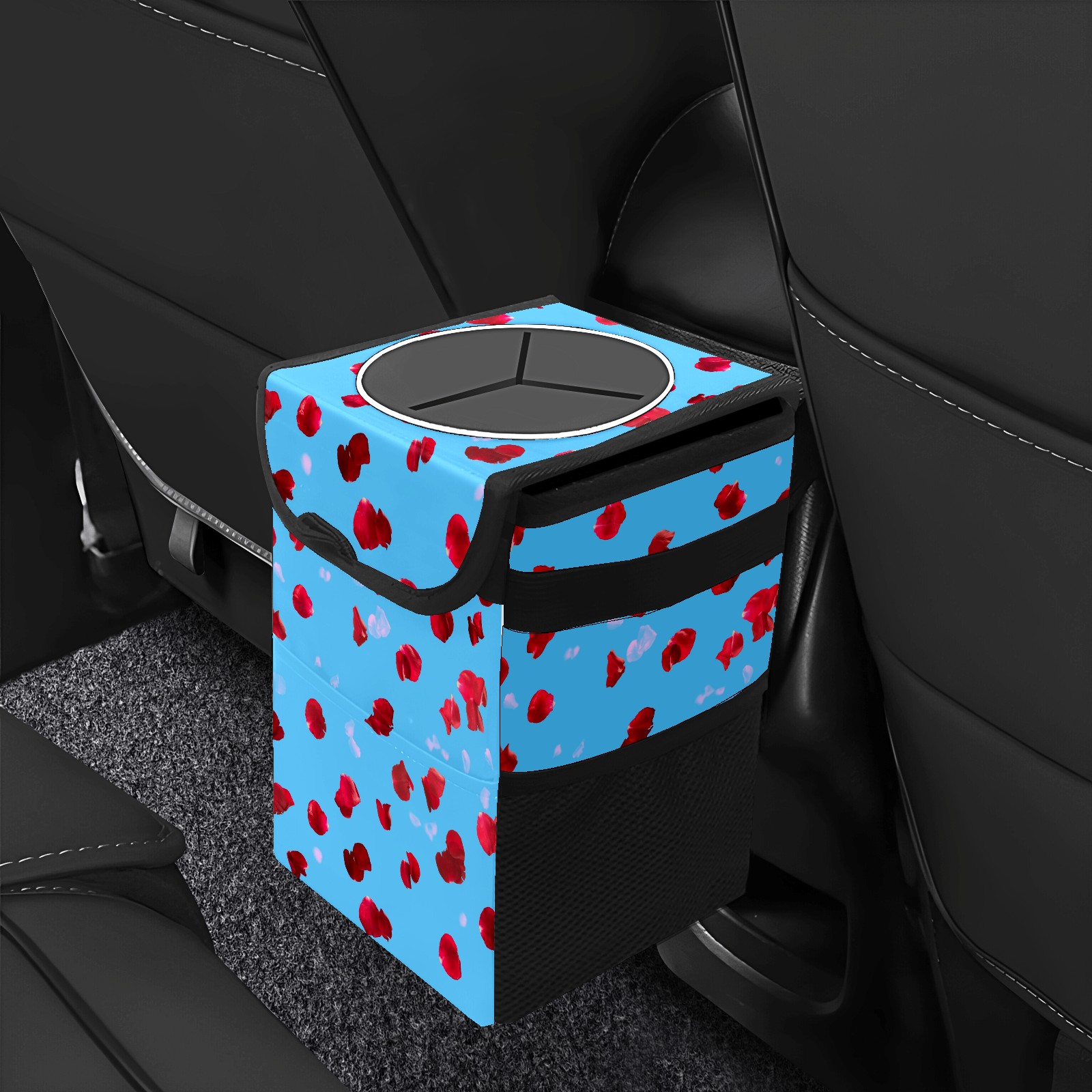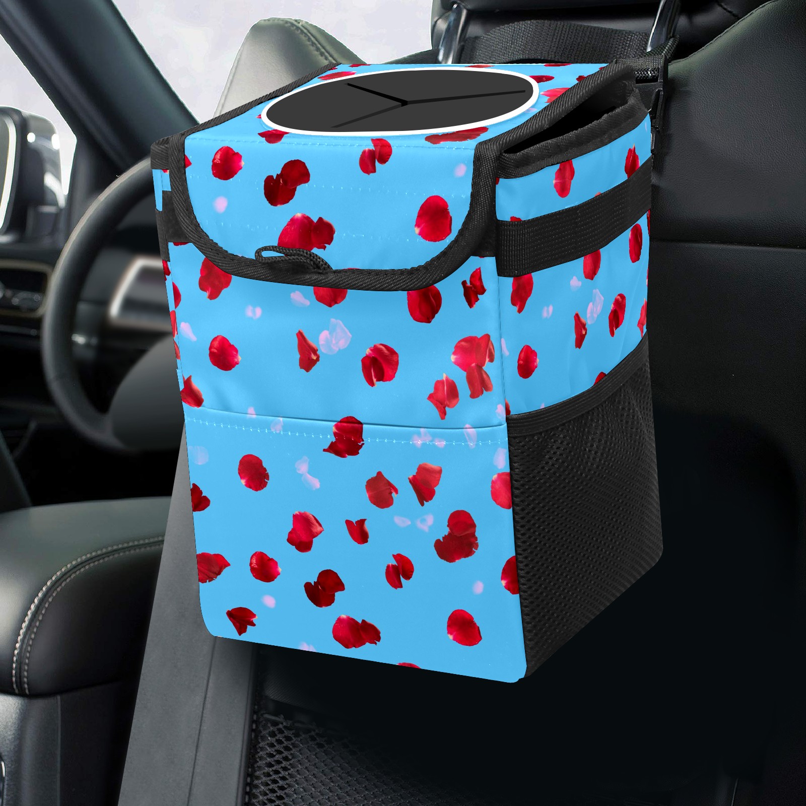 Car Garbage Can — Multi-functional, Lightweight Portable, Reusable Vehicle Trash Can, Waterproof with Sufficient Storage Capacity Red Rose Petals Pattern Blue